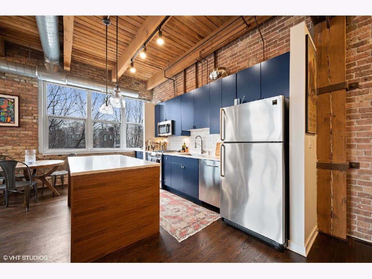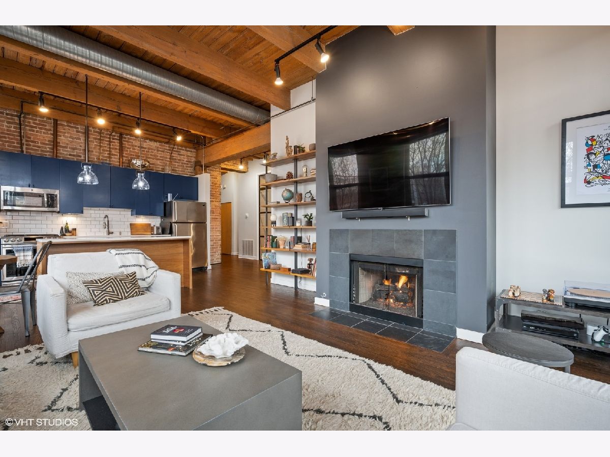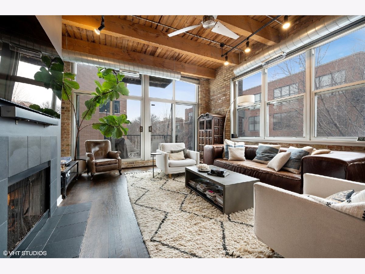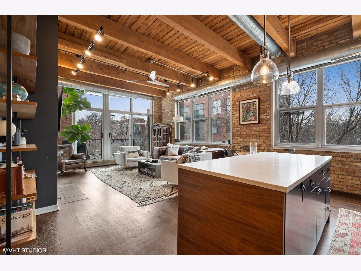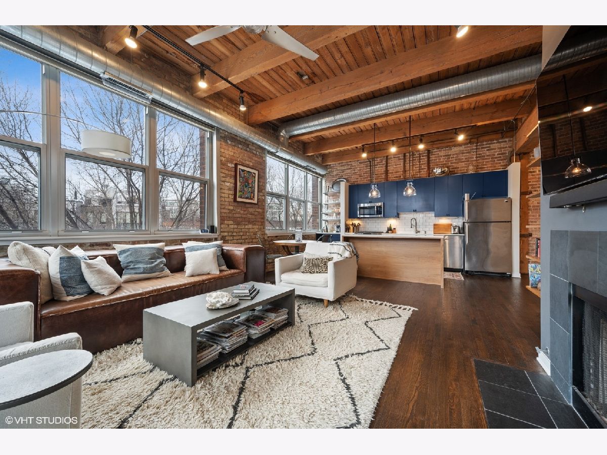 WELCOME to ACME LOFTS, a three- story boutique loft building on the edge of Wicker Park and Bucktown. This converted industrial building houses 25 unique lofts with exposed brick, 14 ft. ceilings and original timber beams. But, this unit is anything but your standard timber loft Unit #10 is a handsome NW corner unit on the second floor, with big beautiful windows offering treetop views of the neighborhood and gleaming hardwood floors throughout. . It has been thoughtfully updated, adding style and sophistication to an already cool space. This condo loves people and provides a beautiful space for gathering with friends and family. The inviting open floor plan includes a spacious Living/Dining room, with wood -burning fireplace/ gas starter and a private balcony for grilling.. The renovated kitchen boasts stainless steel appliances with new gas range (2021), wood cabinets with all new doors and hardware, painted a deep navy blue, beautiful white quartz counters, an expansive island wrapped in walnut and topped in quartz, a built-in prep bar area and new RH lighting. If you love to cook and entertain this is the space for you. The Primary bedroom is fully enclosed and includes walk-in closet and en-suite spa bath with new quartz counters and fixtures, marble shower and separate whirlpool style tub. The guest bathroom also has new quartz counter and fixtures. The second bedroom, currently used as an office, has been enclosed with a custom industrial style glass wall/doors....... a statement designer touch that allows light to pour into a previously uninspired room. Curtains or blinds can provide privacy for use as a bedroom. NEw RH Chandelier adds personality to this custom space. In-unit laundry, new HVAC w/humidifier (2017), storage locker and assigned parking spot in heated attached garage, complete this unique home. Did we mention that the location can't be beat? One block off of Milwaukee Ave., with all of its shops and restaurants; a dog park next door; entrance to the 606 nearby;2 blue line el stops equidistant from home; Aldi and Olivia's Market within walking distance. Investor and Pet friendly.