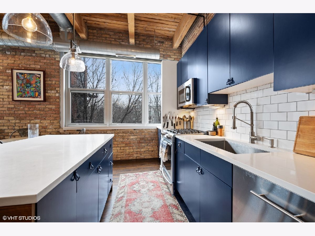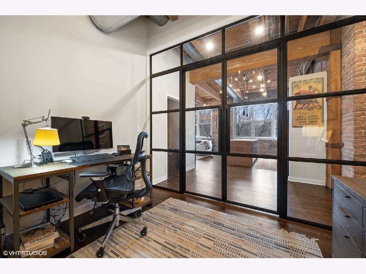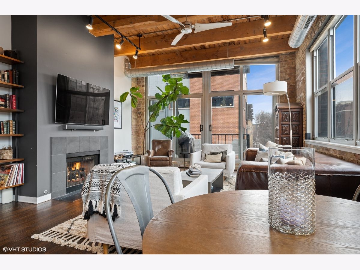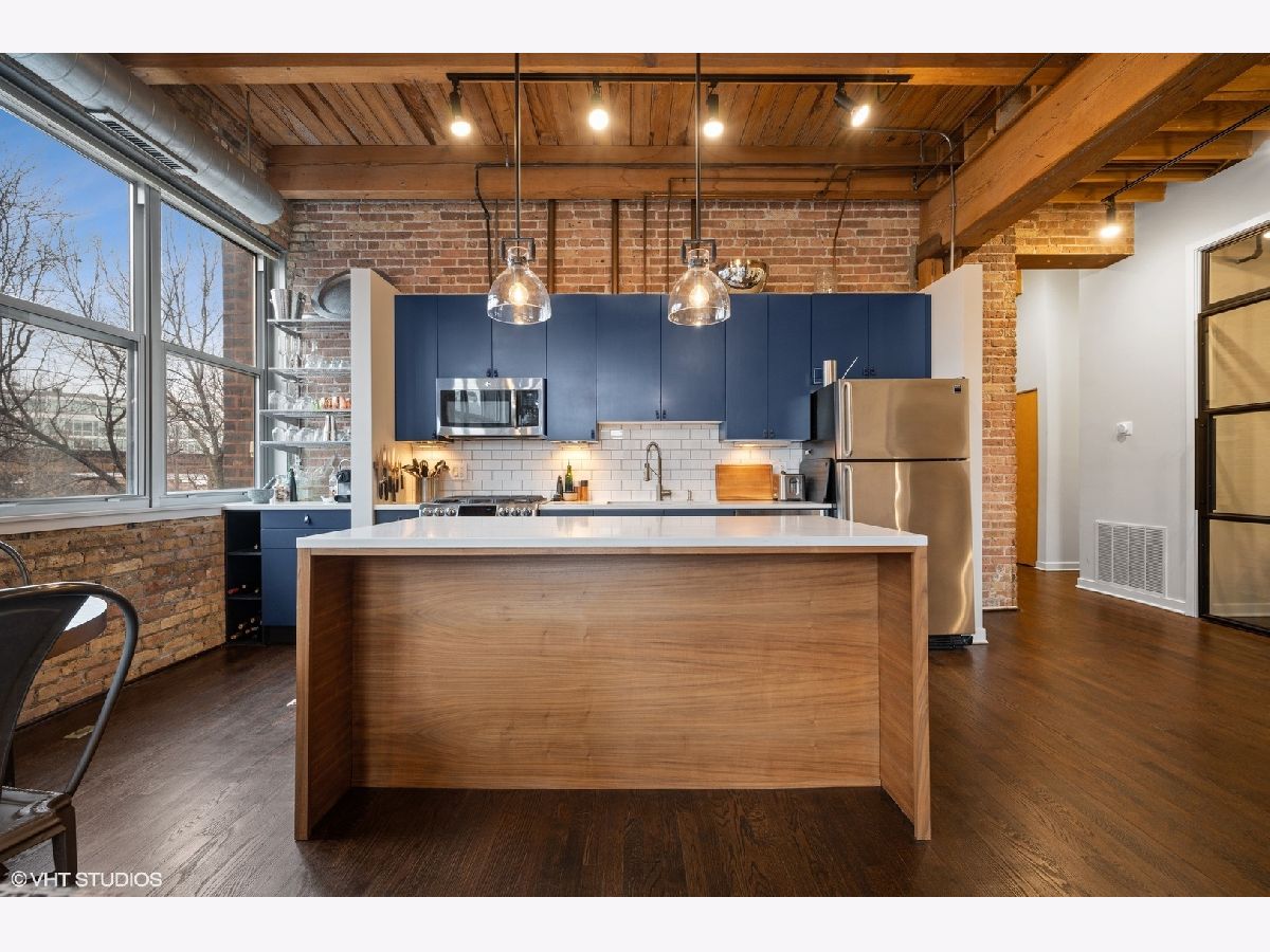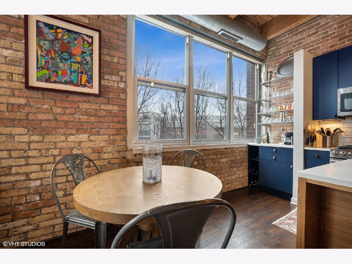 WELCOME to ACME LOFTS, a three- story boutique loft building on the edge of Wicker Park and Bucktown. This converted industrial building houses 25 unique lofts with exposed brick, 14 ft. ceilings and original timber beams. But, this unit is anything but your standard timber loft Unit #10 is a handsome NW corner unit on the second floor, with big beautiful windows offering treetop views of the neighborhood and gleaming hardwood floors throughout. . It has been thoughtfully updated, adding style and sophistication to an already cool space. This condo loves people and provides a beautiful space for gathering with friends and family. The inviting open floor plan includes a spacious Living/Dining room, with wood -burning fireplace/ gas starter and a private balcony for grilling.. The renovated kitchen boasts stainless steel appliances with new gas range (2021), wood cabinets with all new doors and hardware, painted a deep navy blue, beautiful white quartz counters, an expansive island wrapped in walnut and topped in quartz, a built-in prep bar area and new RH lighting. If you love to cook and entertain this is the space for you. The Primary bedroom is fully enclosed and includes walk-in closet and en-suite spa bath with new quartz counters and fixtures, marble shower and separate whirlpool style tub. The guest bathroom also has new quartz counter and fixtures. The second bedroom, currently used as an office, has been enclosed with a custom industrial style glass wall/doors....... a statement designer touch that allows light to pour into a previously uninspired room. Curtains or blinds can provide privacy for use as a bedroom. NEw RH Chandelier adds personality to this custom space. In-unit laundry, new HVAC w/humidifier (2017), storage locker and assigned parking spot in heated attached garage, complete this unique home. Did we mention that the location can't be beat? One block off of Milwaukee Ave., with all of its shops and restaurants; a dog park next door; entrance to the 606 nearby;2 blue line el stops equidistant from home; Aldi and Olivia's Market within walking distance. Investor and Pet friendly.