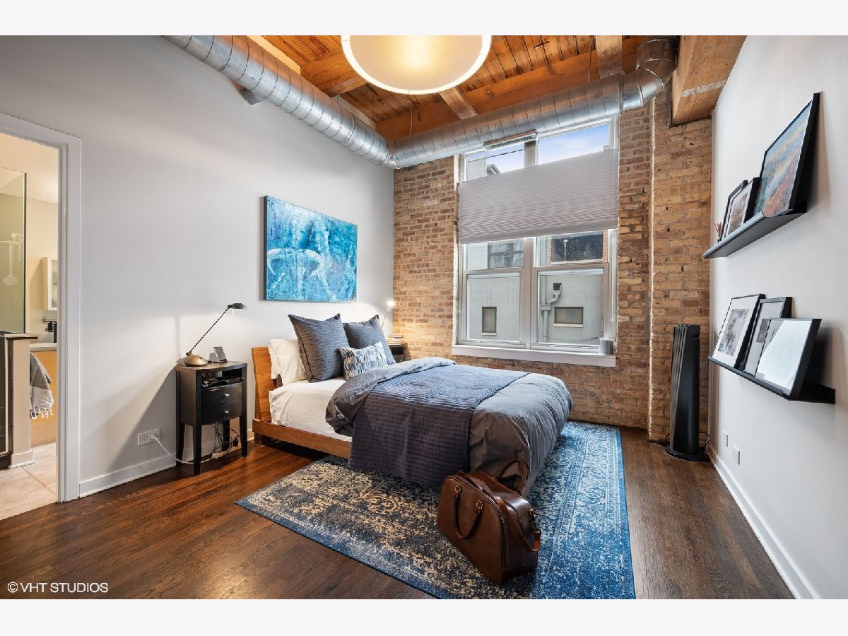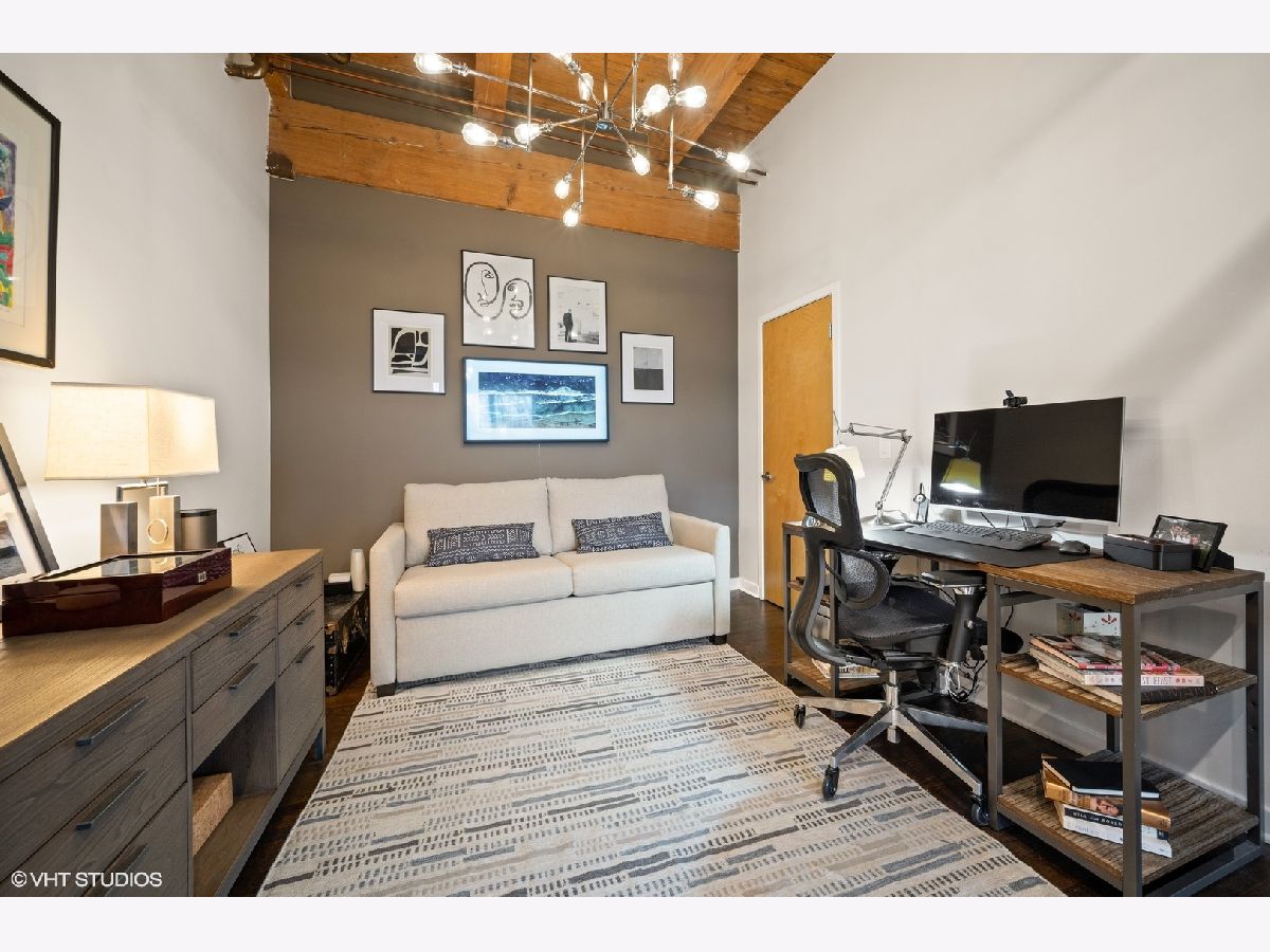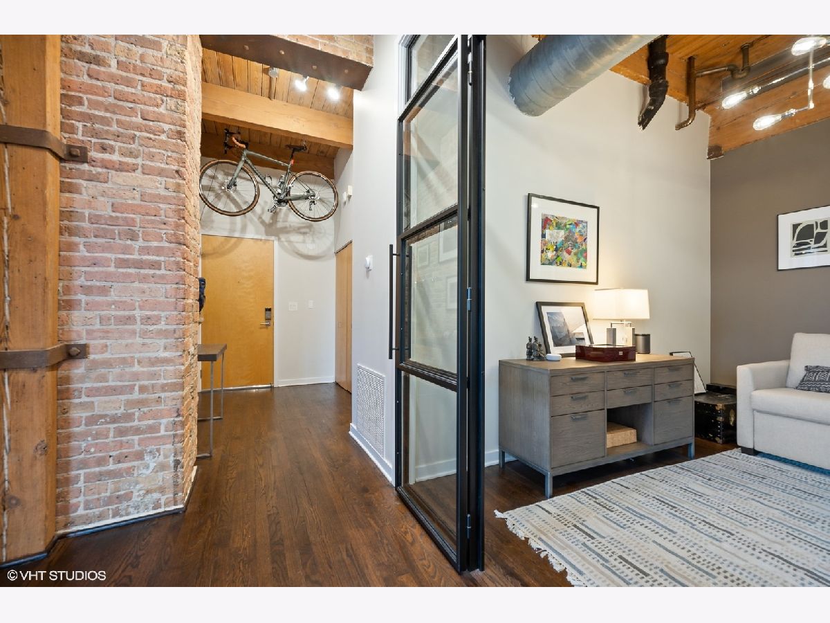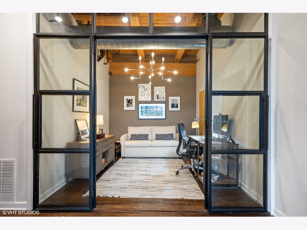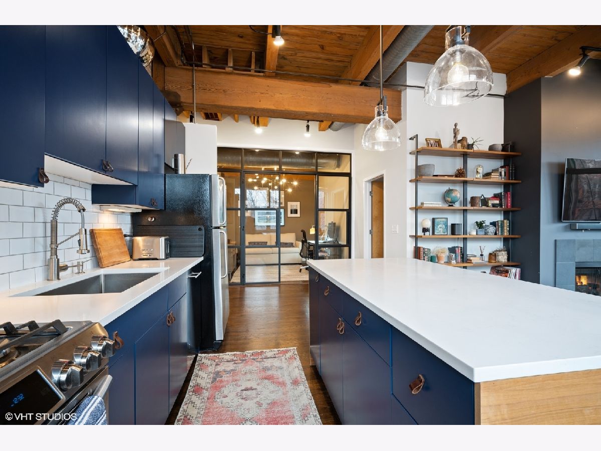 WELCOME to ACME LOFTS, a three- story boutique loft building on the edge of Wicker Park and Bucktown. This converted industrial building houses 25 unique lofts with exposed brick, 14 ft. ceilings and original timber beams. But, this unit is anything but your standard timber loft Unit #10 is a handsome NW corner unit on the second floor, with big beautiful windows offering treetop views of the neighborhood and gleaming hardwood floors throughout. . It has been thoughtfully updated, adding style and sophistication to an already cool space. This condo loves people and provides a beautiful space for gathering with friends and family. The inviting open floor plan includes a spacious Living/Dining room, with wood -burning fireplace/ gas starter and a private balcony for grilling.. The renovated kitchen boasts stainless steel appliances with new gas range (2021), wood cabinets with all new doors and hardware, painted a deep navy blue, beautiful white quartz counters, an expansive island wrapped in walnut and topped in quartz, a built-in prep bar area and new RH lighting. If you love to cook and entertain this is the space for you. The Primary bedroom is fully enclosed and includes walk-in closet and en-suite spa bath with new quartz counters and fixtures, marble shower and separate whirlpool style tub. The guest bathroom also has new quartz counter and fixtures. The second bedroom, currently used as an office, has been enclosed with a custom industrial style glass wall/doors....... a statement designer touch that allows light to pour into a previously uninspired room. Curtains or blinds can provide privacy for use as a bedroom. NEw RH Chandelier adds personality to this custom space. In-unit laundry, new HVAC w/humidifier (2017), storage locker and assigned parking spot in heated attached garage, complete this unique home. Did we mention that the location can't be beat? One block off of Milwaukee Ave., with all of its shops and restaurants; a dog park next door; entrance to the 606 nearby;2 blue line el stops equidistant from home; Aldi and Olivia's Market within walking distance. Investor and Pet friendly.