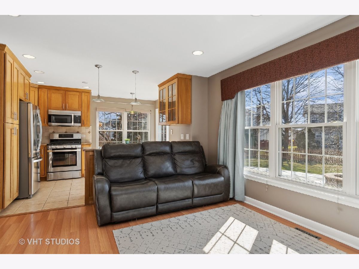 Introducing a stunning NORTH EAST-facing 3-bedroom, 2.5-bathroom home with a basement, nestled on a quiet cul-de-sac and boasting a fully fenced EXTRA-LARGE BACKYARD in the prestigious OAKHURST Subdivision. As you enter, you'll be greeted by a welcoming 2-STORY FOYER, leading seamlessly into the living room, a cozy retreat enhanced by a striking LINEAR GAS FIREPLACE, which is perfect for gathering with loved ones. The flow of wood laminate floors throughout the living, dining, and family rooms adds both style and durability to your living space. The updated eat-in kitchen is every chef's dream, with timeless FLOOR-TO-CEILING cabinets, featuring pull-out shelves for all your spices, elegant granite counters, a desirable gas range, a Lazy Susan, stainless steel appliances, a charming glass-front display cabinet, and luxurious porcelain tile flooring. On the second floor, you'll find the primary suite, which includes a spacious WALK-IN closet and a double sink bath with a luxurious whirlpool bathtub, providing the perfect spot to relax after a long day. The third bedroom, currently utilized as an office, features wood laminate flooring and a large WALK-IN closet. This home is perfect for Oakhurst living with TOP-RATED DISTRICT 204 SCHOOLS offering exceptional educational opportunities. Enjoy community amenities like tennis and volleyball courts, soccer and baseball fields, and a private swim club. Take leisurely strolls by Waubonsie Lake's scenic walking path, right on your doorstep. Conveniently located near Oakhurst Forest Preserve, shopping centers, METRA, and I-88, this home perfectly balances serenity with accessibility. Don't miss out on the chance to make this house yours!