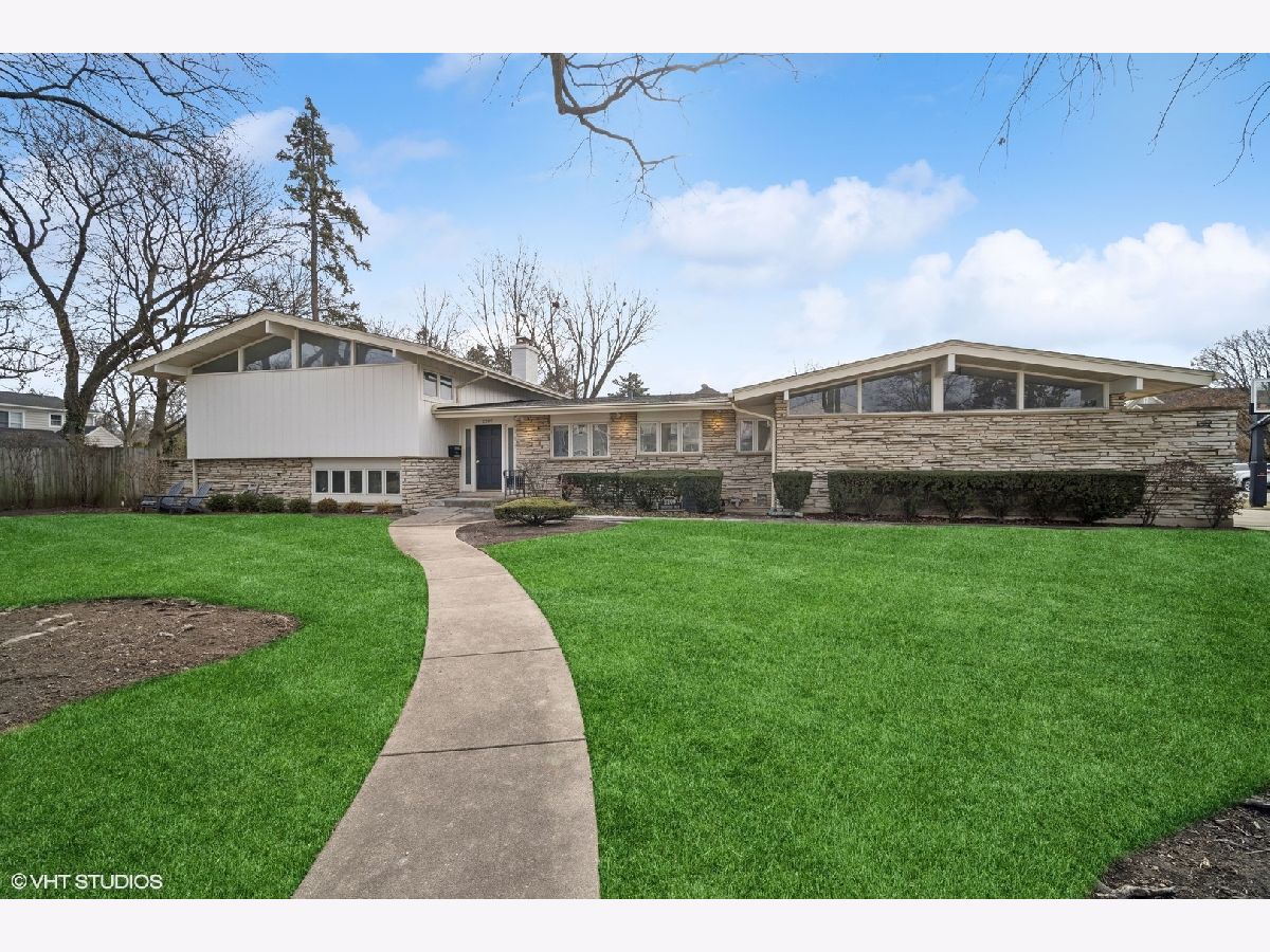 Welcome to 2209 Swainwood Drive - a stylish, midcentury-modern home in the coveted Swainwood neighborhood of Glenview, where you can walk to train, restaurants, shopping, Roosevelt park/pool/tennis, library. This move-in-ready, sprawling split-level home offers 4 bedrooms, 3 full baths, and nearly 3,500 sq ft of living space. The heart of the home is the large, eat-in kitchen renovated in 2023 with painted white cabinets, new quartz countertops and brass hardware, new Thermador 6-burner range with venting system, new backsplash, new sink, and new microwave. The sprawling first floor includes the XL dining room, living room, den, and office, all with hardwood floors, loads of windows, and functional built-ins. On the second level, you find the large primary bedroom with en suite full bath and two closets, two additional bedrooms, and the renovated hall full bath. The walk-out lower level included the cozy family room with remarkable stone fireplace wall, a fourth bedroom, the large laundry room, and third full bath. The basement was completely refinished in 2023 with new carpet/walls/ceiling/LED lighting/etc. The basement bonus is a HUGE storage/workshop room. Improvements include: New tear-off roof (2021), new furnace/ac (2023), kitchen remodel (2023), basement finished (2023), refinished kitchen/foyer hardwood floors (2023), new garage door (2018), underground sprinkler system with wi-fi (2022), new water heater (2024), and more. Nothing to do but move in and enjoy! Welcome home!