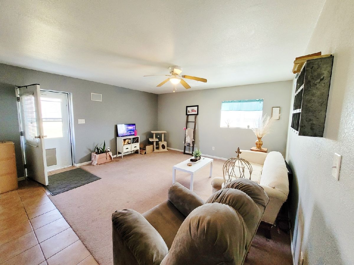 This 2-bedroom home offers, open kitchen/dining living room, master bedroom and bathroom have wide doorways for wheelchair access. Hunter ceiling fans in all rooms, plus 3 in garage. Laundry room. Garage with electric opener and two controls. Appliances including microwave, dishwasher, stove, refrigerator, washer & dryer will stay. Heavy gauge dog kennel with dog door. Partial fenced yard. Two 8' high garage doors. Cheap to heat! Corner lot