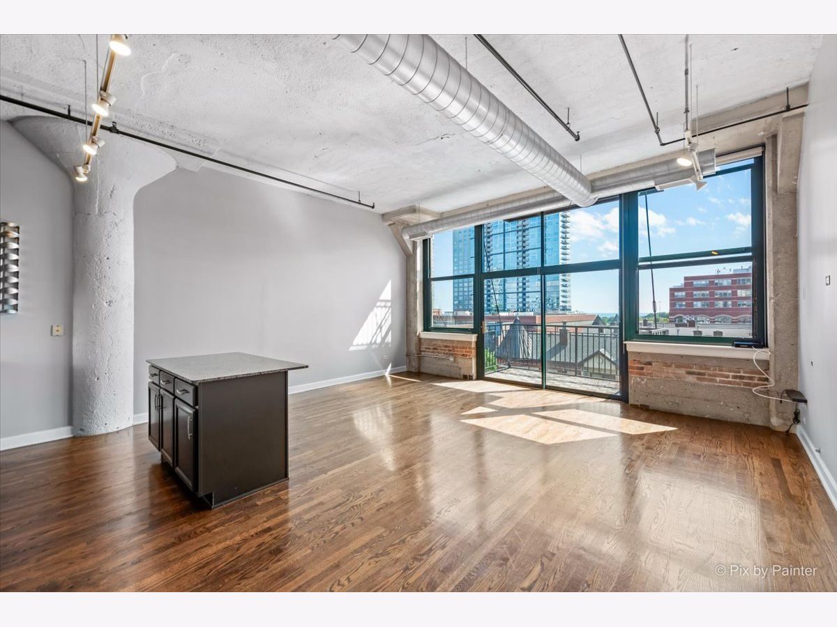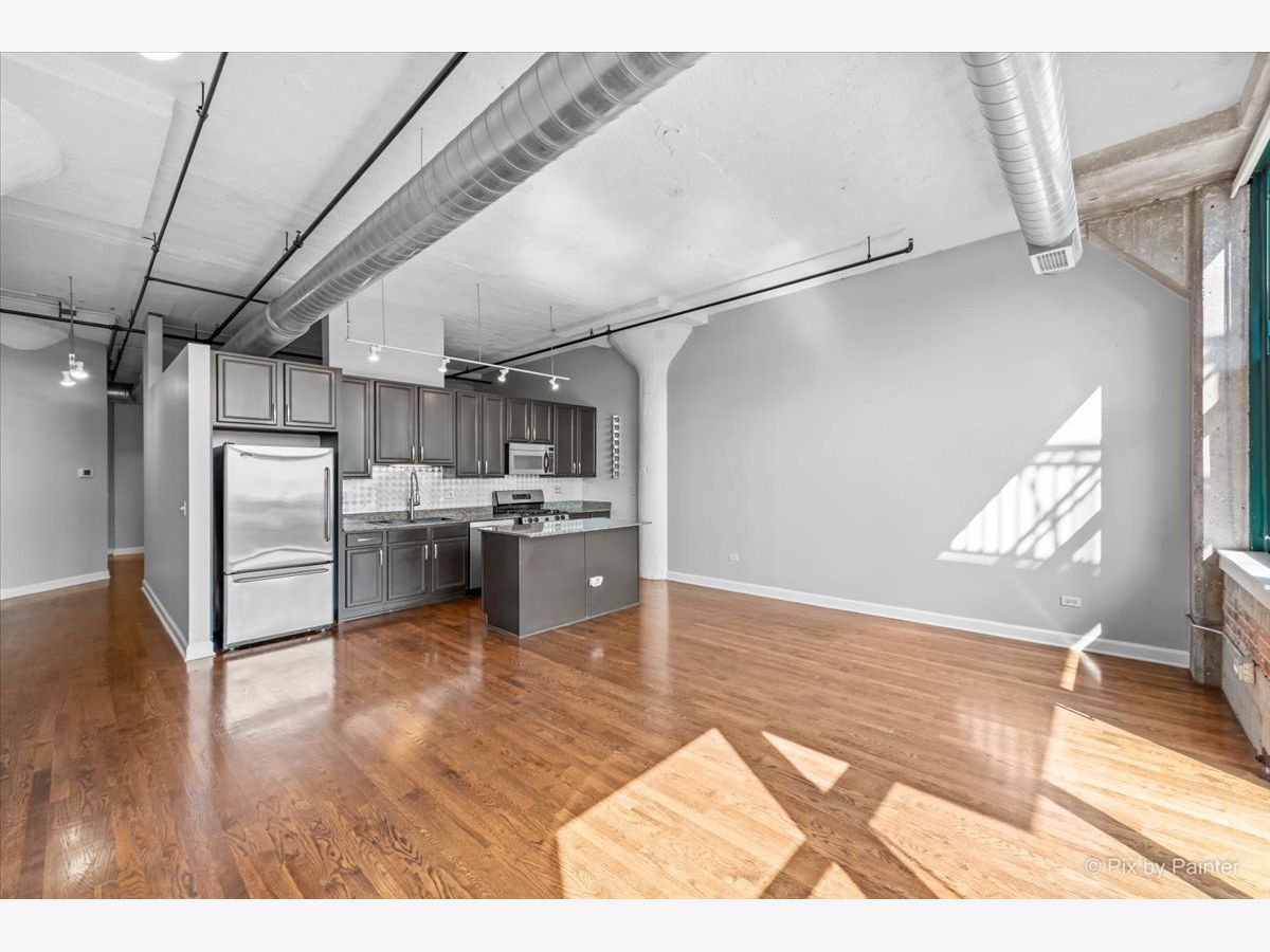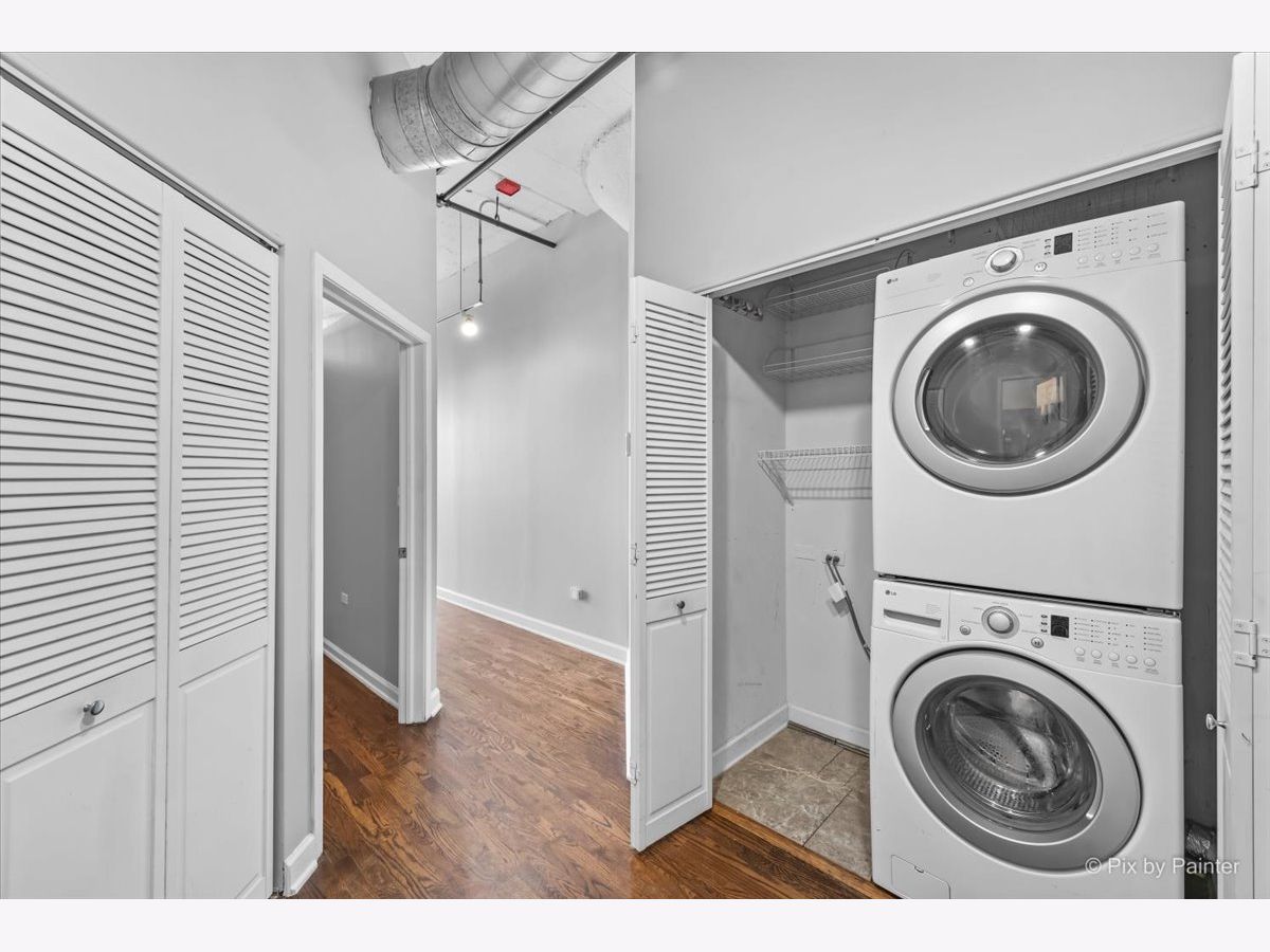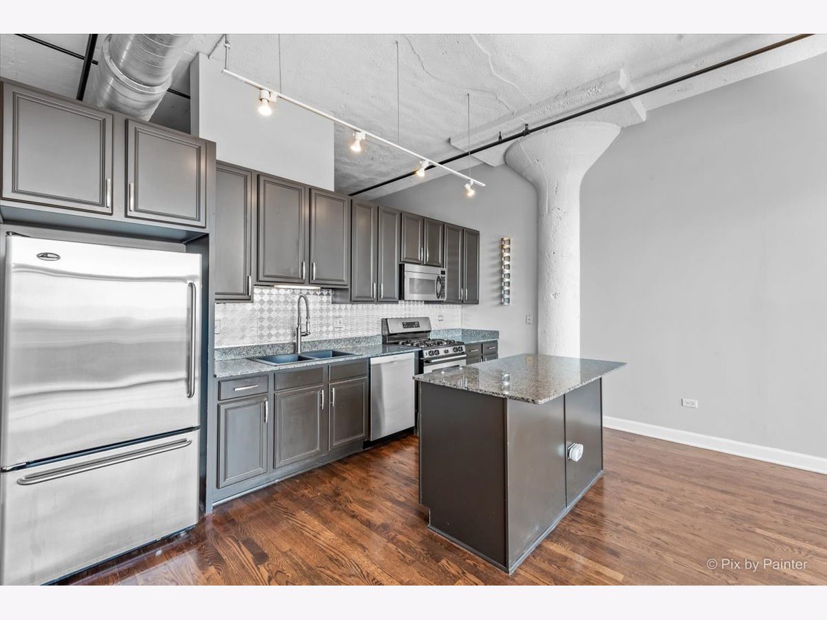 Sunny East-facing condo in popular Prarie Ave Lofts! This unit features a large balcony with a peek at Lake Michigan, 13ft ceilings, exposed brick, beautiful hardwood floors, granite countertops, custom backsplash, stainless steel appliances, and 42" cabinets. 10ft walk-in closet w/ barn door & built-ins. Updated bath with separate tub and shower, double sink vanity. High-efficiency in-unit washer/dryer. Storage locker on unit floor. Deeded garage parking an additional $25,000.