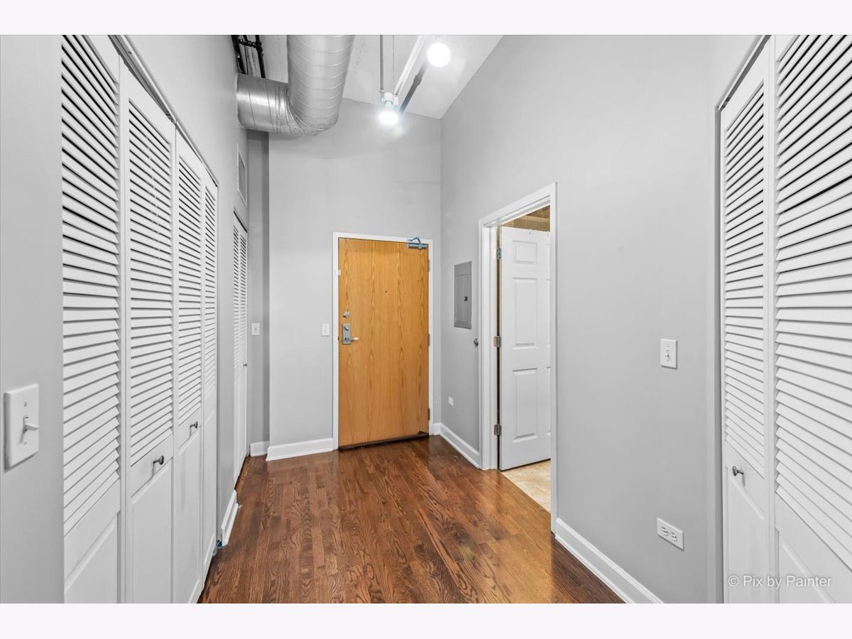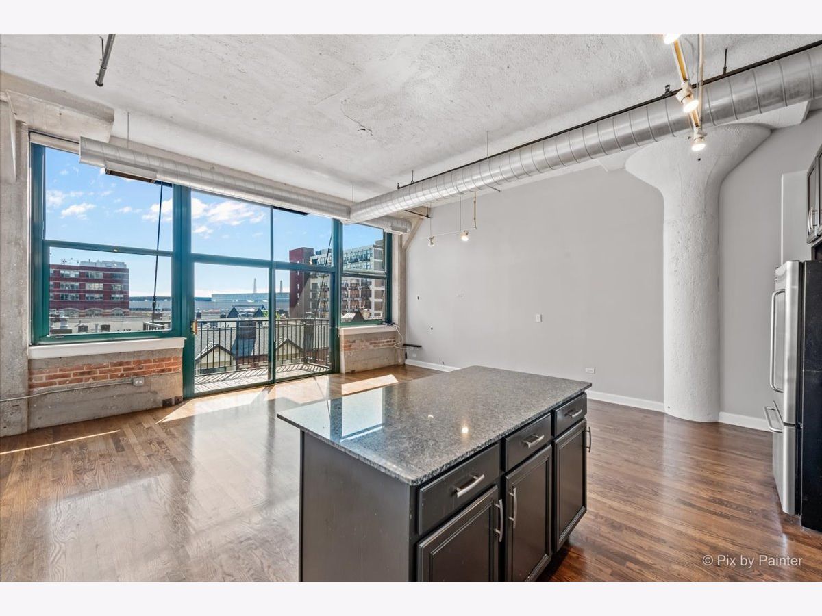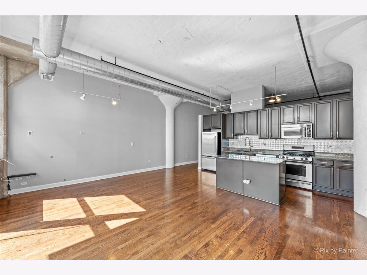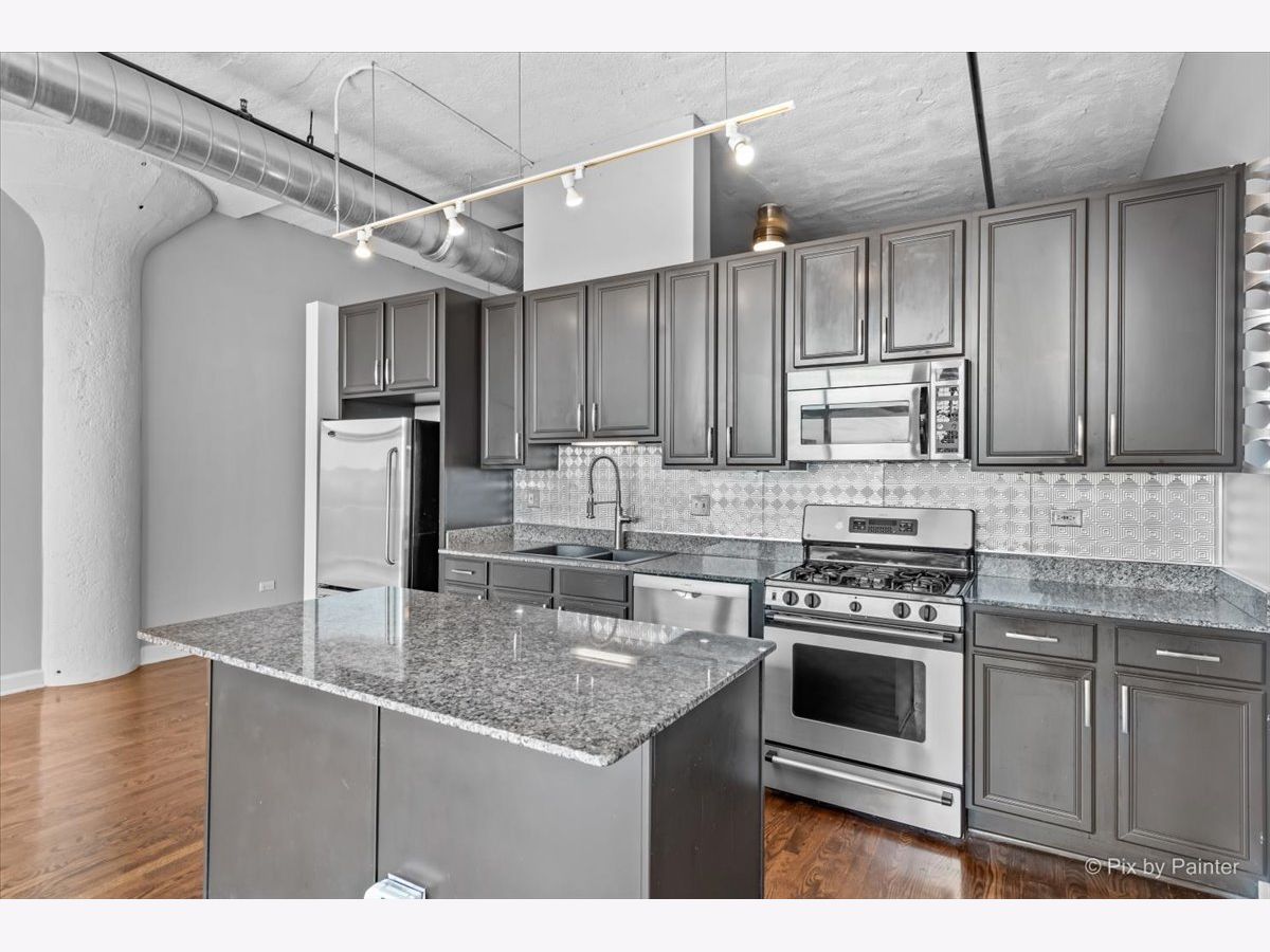 Sunny East-facing condo in popular Prarie Ave Lofts! This unit features a large balcony with a peek at Lake Michigan, 13ft ceilings, exposed brick, beautiful hardwood floors, granite countertops, custom backsplash, stainless steel appliances, and 42" cabinets. 10ft walk-in closet w/ barn door & built-ins. Updated bath with separate tub and shower, double sink vanity. High-efficiency in-unit washer/dryer. Storage locker on unit floor. Deeded garage parking an additional $25,000.