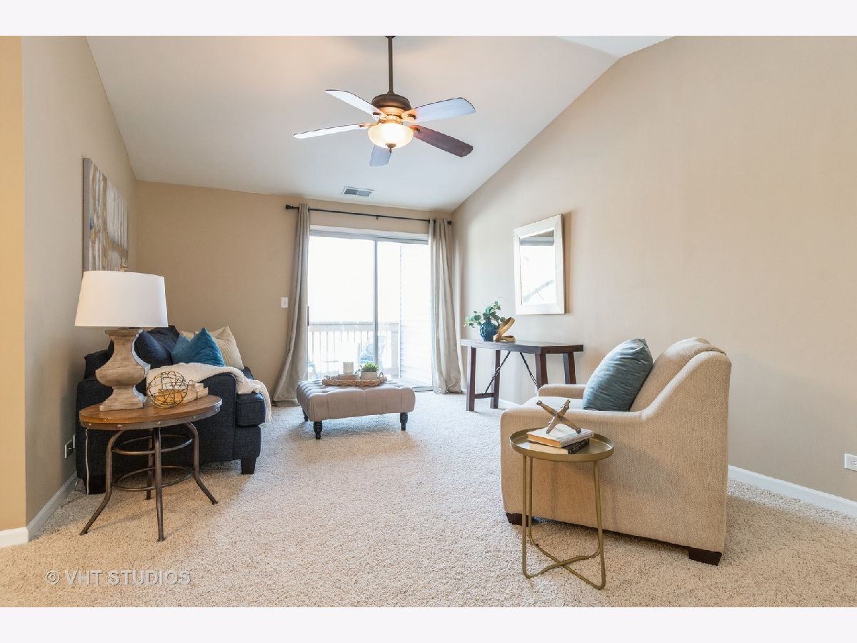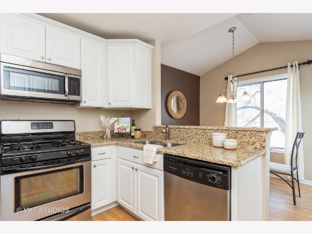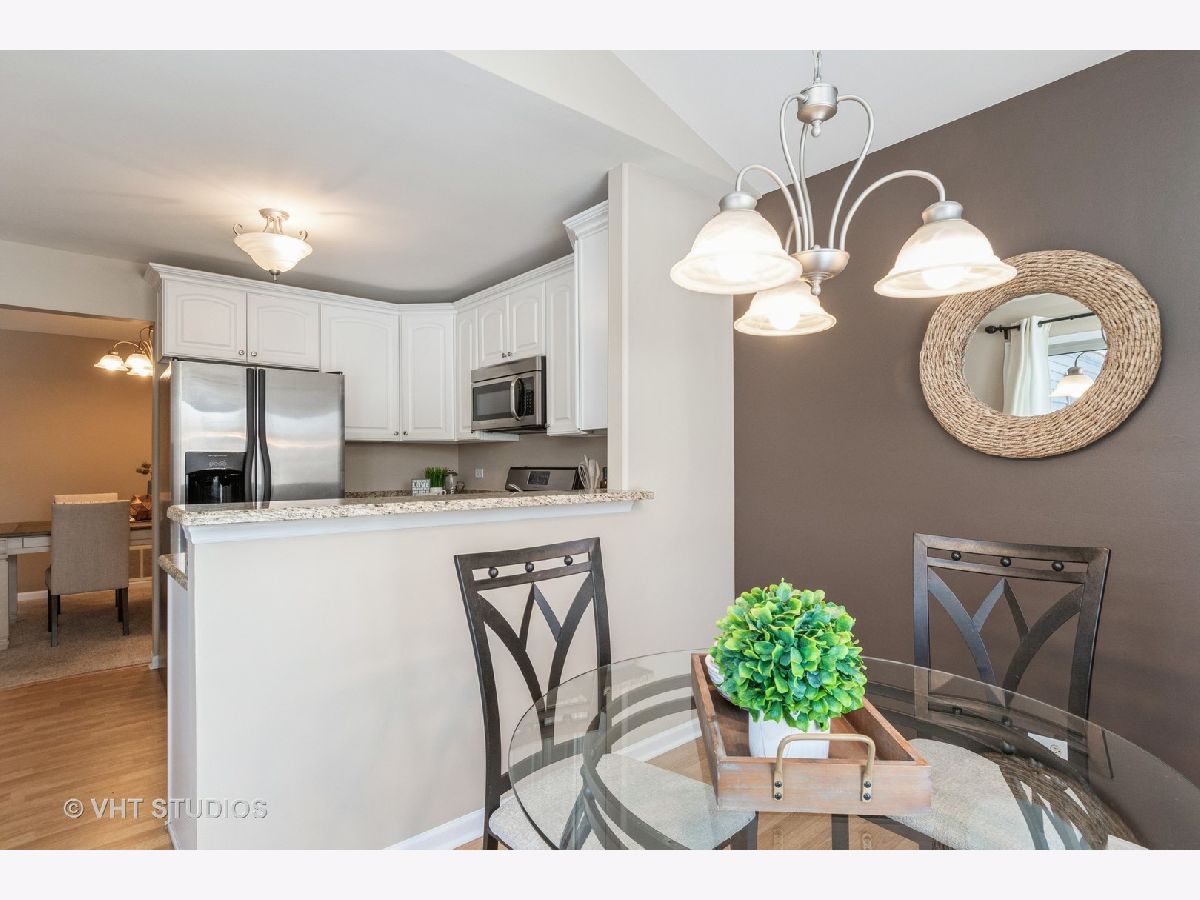 Grab this rare opportunity to enjoy a peaceful condo with a private view from its well-sized balcony. This second-level unit is super quiet thanks to no neighbors above you. Condition? Move-In-Ready of course! Some updated features include a white trim package with 6-panel white doors, neutral wall colors that work with any decorating color theme, light stained wood laminate flooring, unmarked & nicely padded neutral tone frieze carpet, satin nickel finish lighting, fixtures and hardware, stainless steel kitchen appliances (Frigidaire!), 42" white Kitchen cabinets tastefully graced with crown caps & constructed with solid dovetail corner joints on drawers, granite kitchen & MBTH counters. The vaulted & cathedral ceilings in the DR, LR & even the Kitchen eating area create that big-feel space. If you are hungry for storage you'll be satisfied here. The Kitchen has a wall full of custom installed storage cabinets with a granite butler bar that is NOT typical for this model. BOTH Bedrooms have REAL walk-in closets (one is 8'X5'). The big plus is the H-U-G-E attic above the Garage with convenient pull-down stair access. It's as good as having basement storage with zero risk of flooding! For a break from the indoors, step onto the balcony and enjoy a great view. Laundry here is a breeze with the in-unit private laundry room providing a full-size stack washer & dryer (Samsung!). Conveniently located on the southern border of the "central" Naperville area and attends highly ranked School District 203 (Kingsley Elem, Lincoln JHS & Naperville Central HS). Commuters, you're just minutes away from the Naperville Metra Train station or a quick hop onto I-355 that quickly connects to I-88. Best of all, no need to go to Chicago for an urban fix. You have your own vibrant downtown right here in downtown Naperville which is also only minutes away. This condo is PRICED TO SELL.