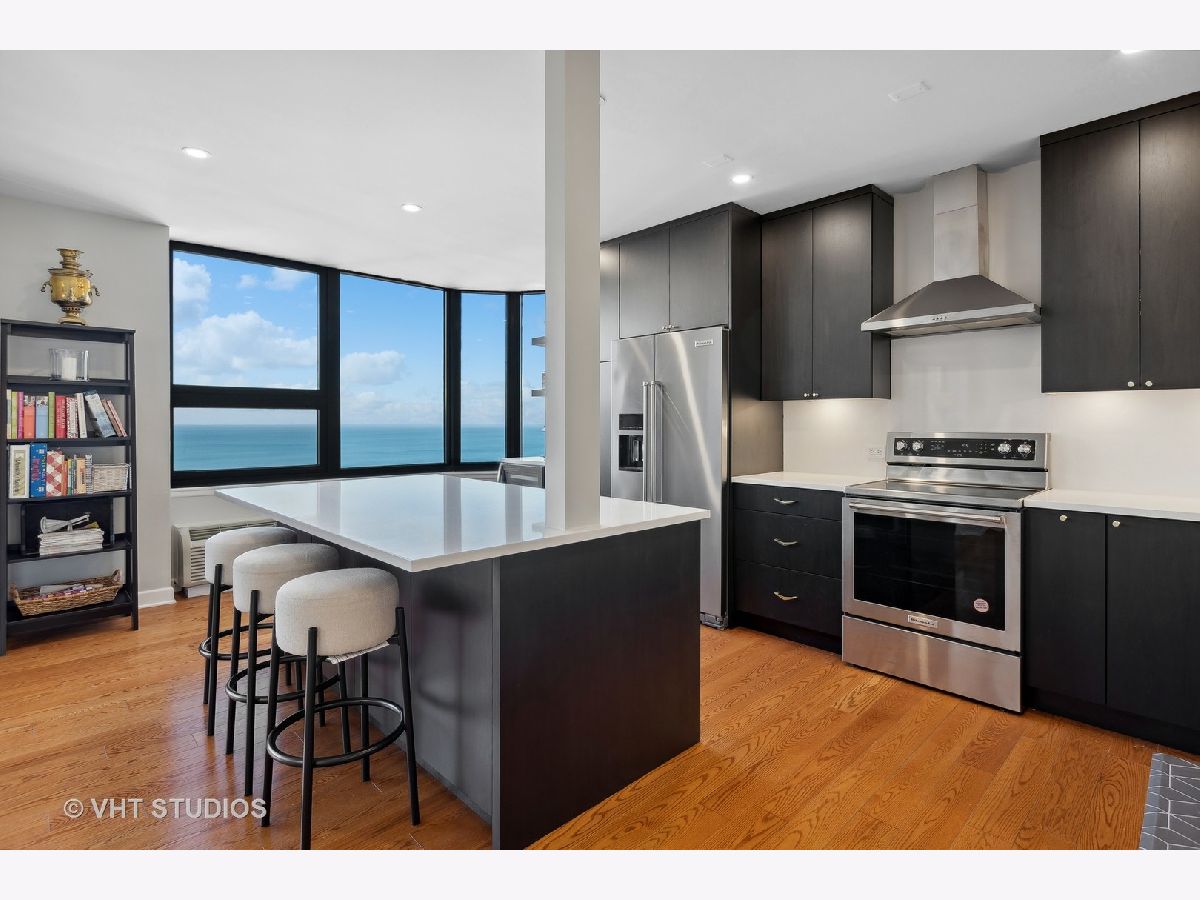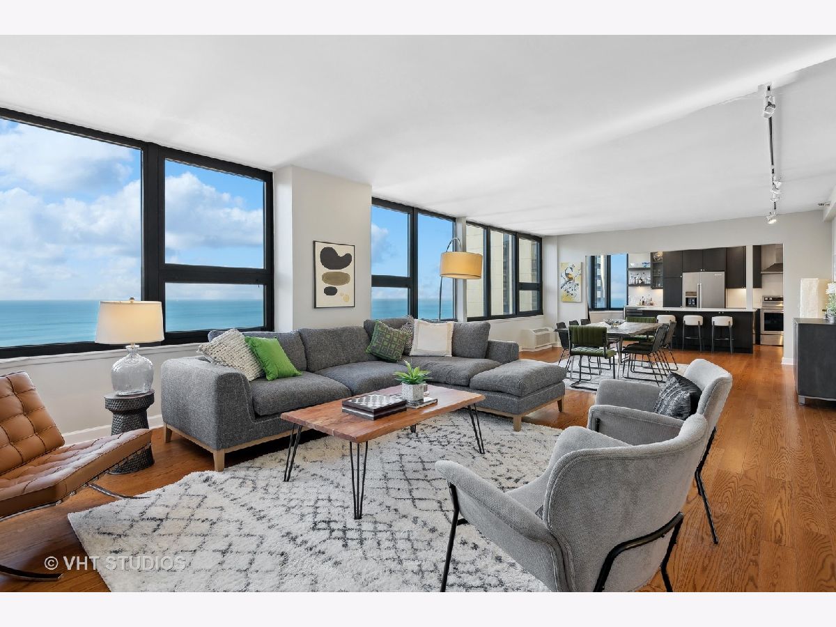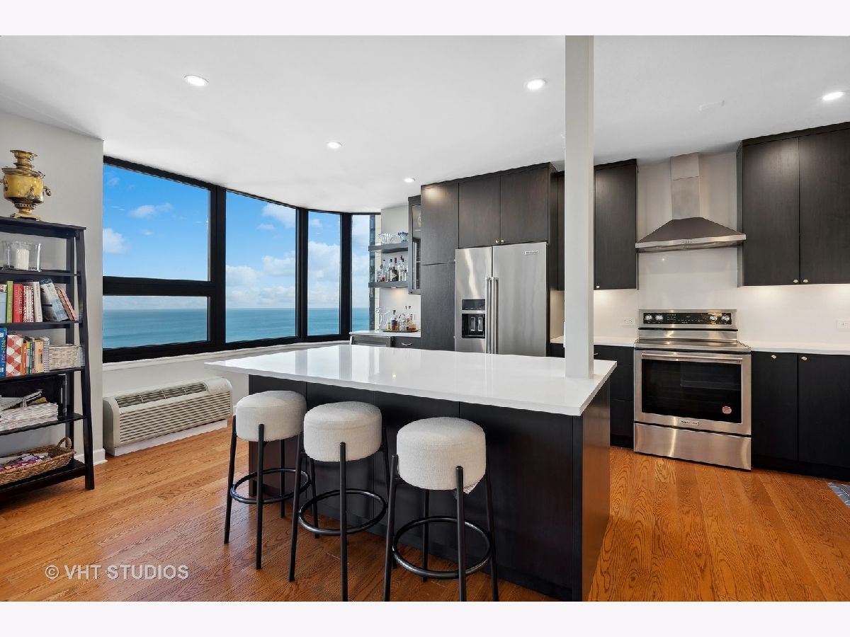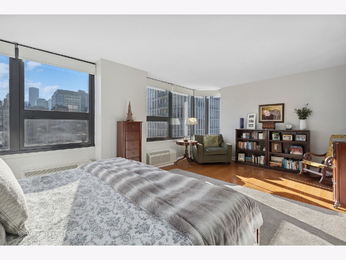 SEE MATTERPORT 3D TOUR and VIDEO TOUR of this amazing Gold Coast luxury home with lake views. With great light, this unit has the entire on the entire 19th floor exclusively with spectacular lake and city views. The elevator takes you to the private foyer, with two entrances into the main hall or into the kitchen area. The private elevator hall has newly renovated slate floors and custom wood slatted walls. The bright, large open concept living and dining room area have a wall of windows and is open to the brand new kitchen. The kitchen was renovated down to the studs and features walnut custom cabinetry, quartz countertops and back-splash, large island and all new appliances. The oversized primary bedroom suite and the additional two bedrooms have great closets, built ins and new motorized roller shades. Both the primary and second bath have radiant heated floors. Laundry room with ample storage and new full size Samsung washer and dryer. The entire unit has brand new pre-finished, engineered floating wood floors. 1 parking space in building's attached garage is available for sale at $35,000. This professionally managed boutique building recently invested $1.4+ million into improvements to the facade, elevators, garage, and other infrastructure. Amenities include a key fob access system, roof deck with grills, and storage. Pet-friendly, one large or two smaller dogs are welcome. Amazing location on beautiful Walton street just steps from the lake, Oak Street beach, the MCA, amazing restaurants, and Michigan Avenue! Truly walk to all location! This is a true gem!