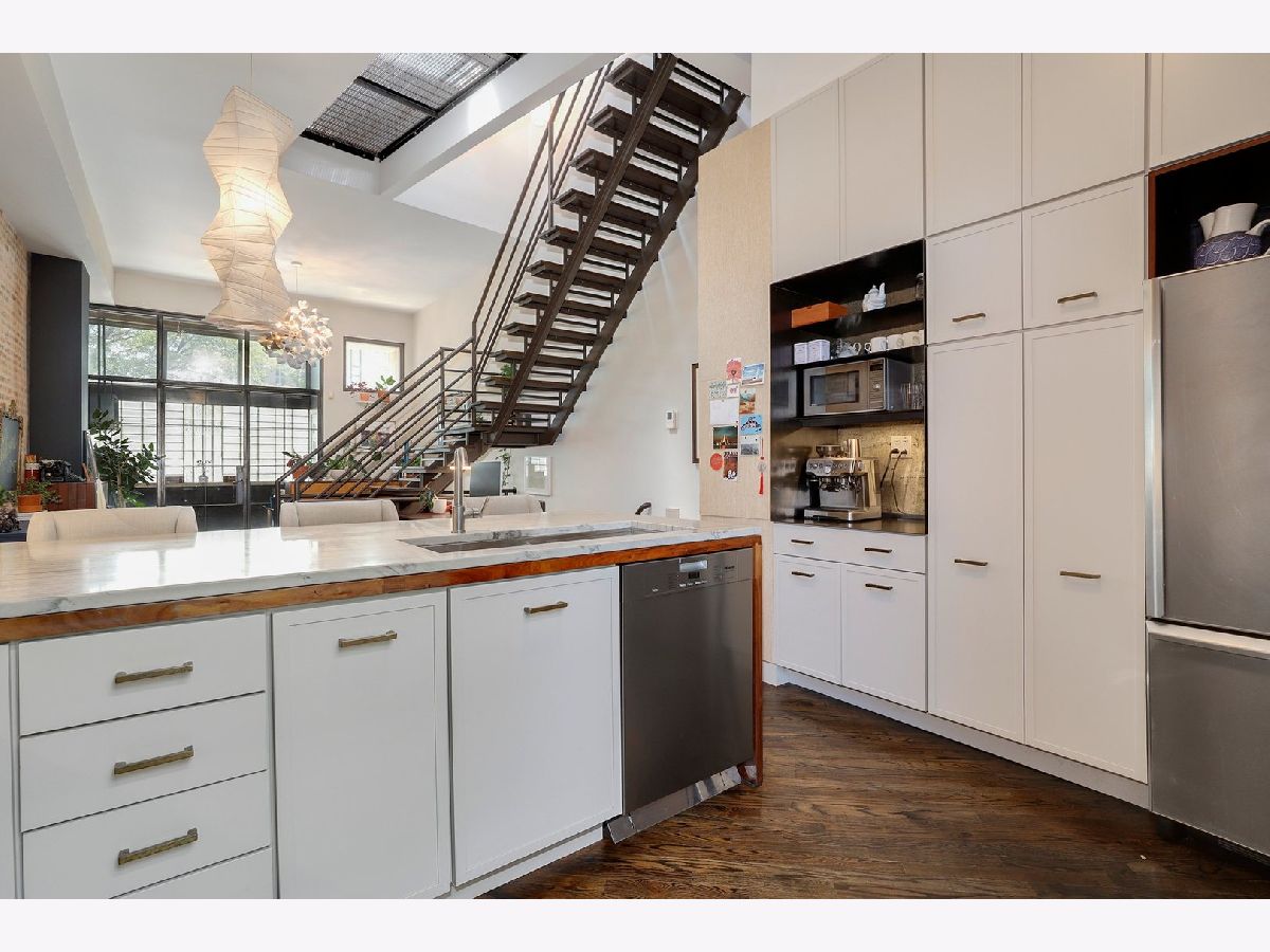 Are you seeking out that truly one-of-a-kind "WOW" factor home? Then look no further - this is the one! Ideally located on a quiet tree-lined street just moments from all the excitement of the Division Street entertainment corridor, this very special Wicker Park home offers the perfect blend of beauty, character, and functionality. Upon entering through the unassuming brick and glass block facade, you will be welcomed by a gracious foyer with custom (removable) glass-paneled doors that open into an incredible sun-filled great room graced with countless amazing architectural details. Exposed brick, 20' ceilings with skylights, dark-stained diagonal hardwood floors, a dramatic wood-burning gas fireplace, and a unique floating staircase combine with beautiful designer finishes and fixtures to create a truly spectacular living space. The chef's kitchen features two-tone custom cabinetry with pull-out drawers, marble and butcher-block countertops, a built-in bar and coffee center, floating display shelves, tons of smartly designed storage, and an oversized peninsula with a breakfast bar that overlooks the living and dining room. Just off the kitchen is your private terrace which is a true outdoor oasis complete with built-in planters and a wall of climbing hydrangeas. The second level of the home boasts a large primary bedroom with a full wall of custom organized closets and sliding doors that open to a private en-suite patio, as well as a designer bathroom with a modern floating vanity and extra-deep soaking tub, and a generous second bedroom that features a skylight with solar-powered shades. On the lower level of the home you will find a large family room/third bedroom with heated floors and built-ins galore, a second full bathroom, a front-loading washer & dryer, a storage room with built-in shelving, and another enormous storage room/mechanical room beyond that (not pictured). Super easy non-permit street parking right out front. Incredible Wicker Park location convenient to parks, transit (blue line, Division & Western buses, 90/94), groceries (Jewel & Target), the famous "6 Corner" intersection where Wicker Park meets Bucktown, and all of the great dining, nightlife, shopping, cafes, and entertainment this vibrant neighborhood has to offer! Don't miss out - this one will not last!