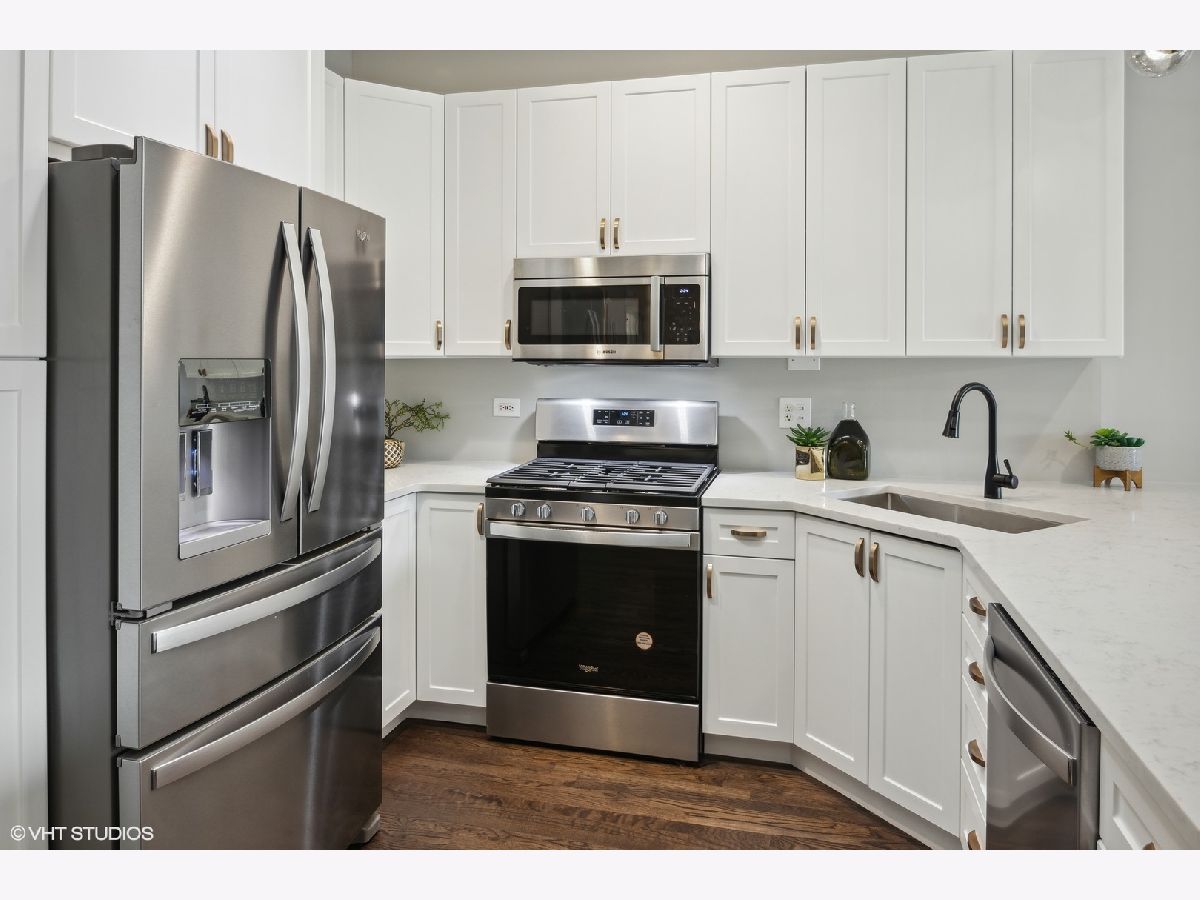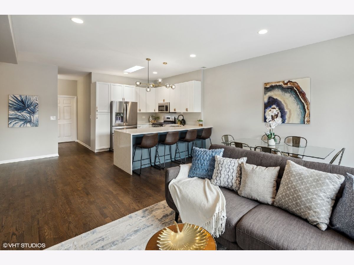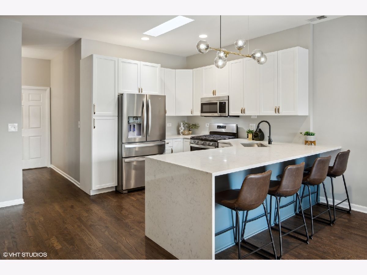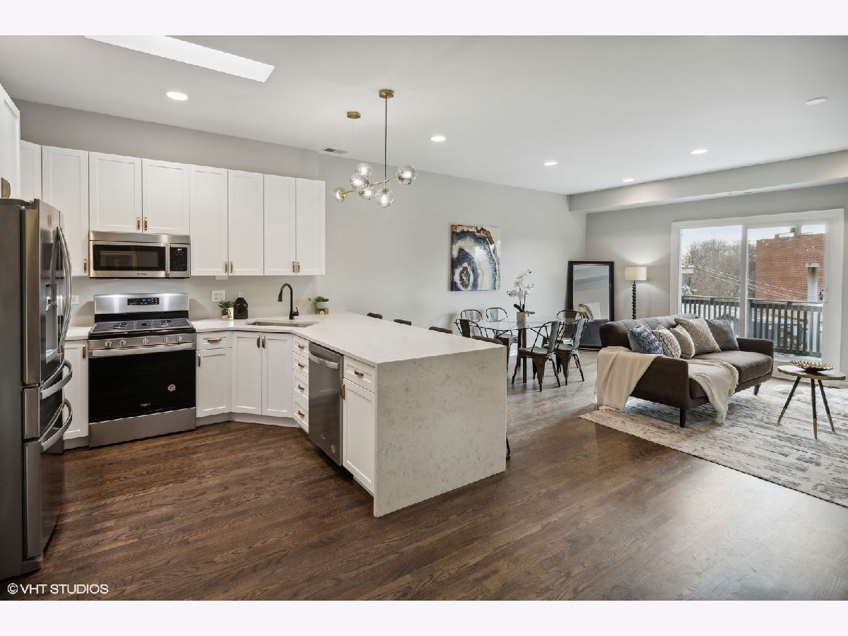 Welcome home to this bright and spacious 2 bed/2 bath top floor condo in the heart of Lincoln Park! The newly renovated unit features hardwood floors throughout and an open floor plan as well as a large deck with a skyline view. The kitchen boasts quartz countertops, updated cabinetry, SS appliances, new gold hardware, and an oversized breakfast bar with a waterfall edge. Easily entertain in or outside between the dining and living areas which flow right out to the deck. The spacious primary bedroom features a walk-in closet and ensuite bath with double vanity, soaking tub, and matte black fixtures. The second bedroom offers plenty of space with a walk-in closet, and the second bath has been updated with new ceramic tile floors and vanity as well as gold and matte black fixtures. Additional highlights include ample storage, new in-unit washer/dryer, brand new lighting throughout, freshly painted, new windows/sliding doors, and garage parking. Boutique elevator building steps from Oz Park and just blocks from shops and restaurants along Lincoln Ave, Halsted St, and Armitage Ave. A quick walk to Lincoln Park and the lake as well as the CTA El and buses. Do not miss this one - schedule a showing today!