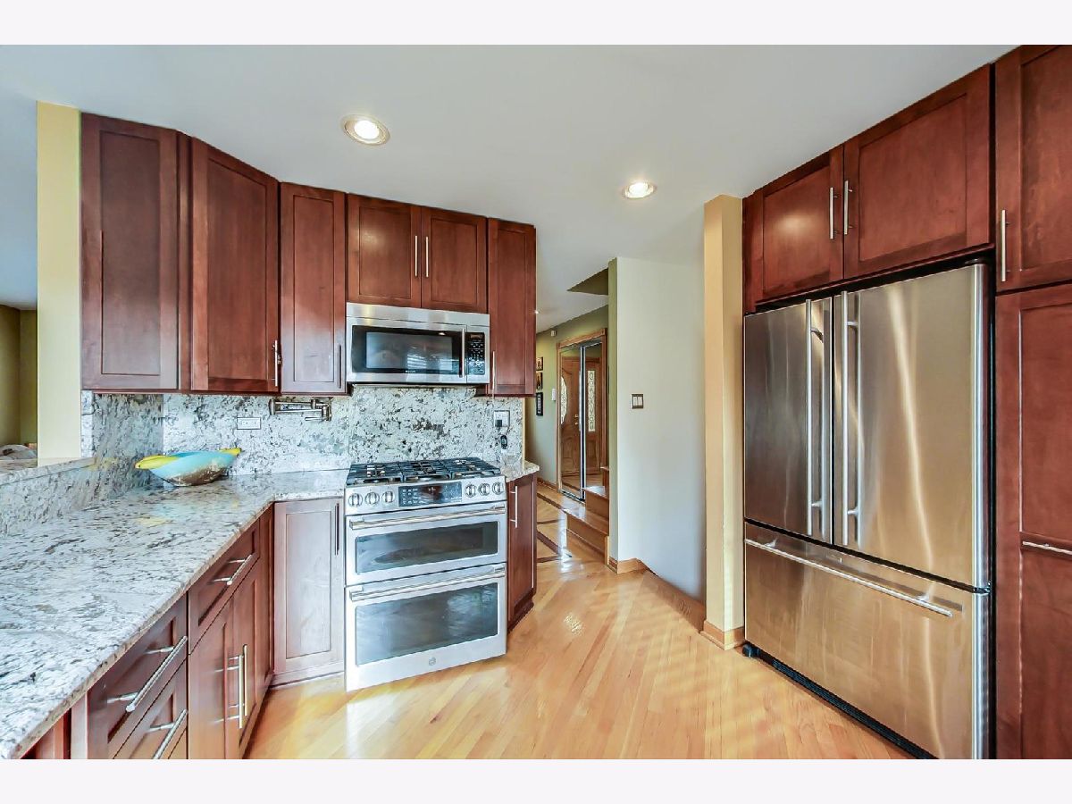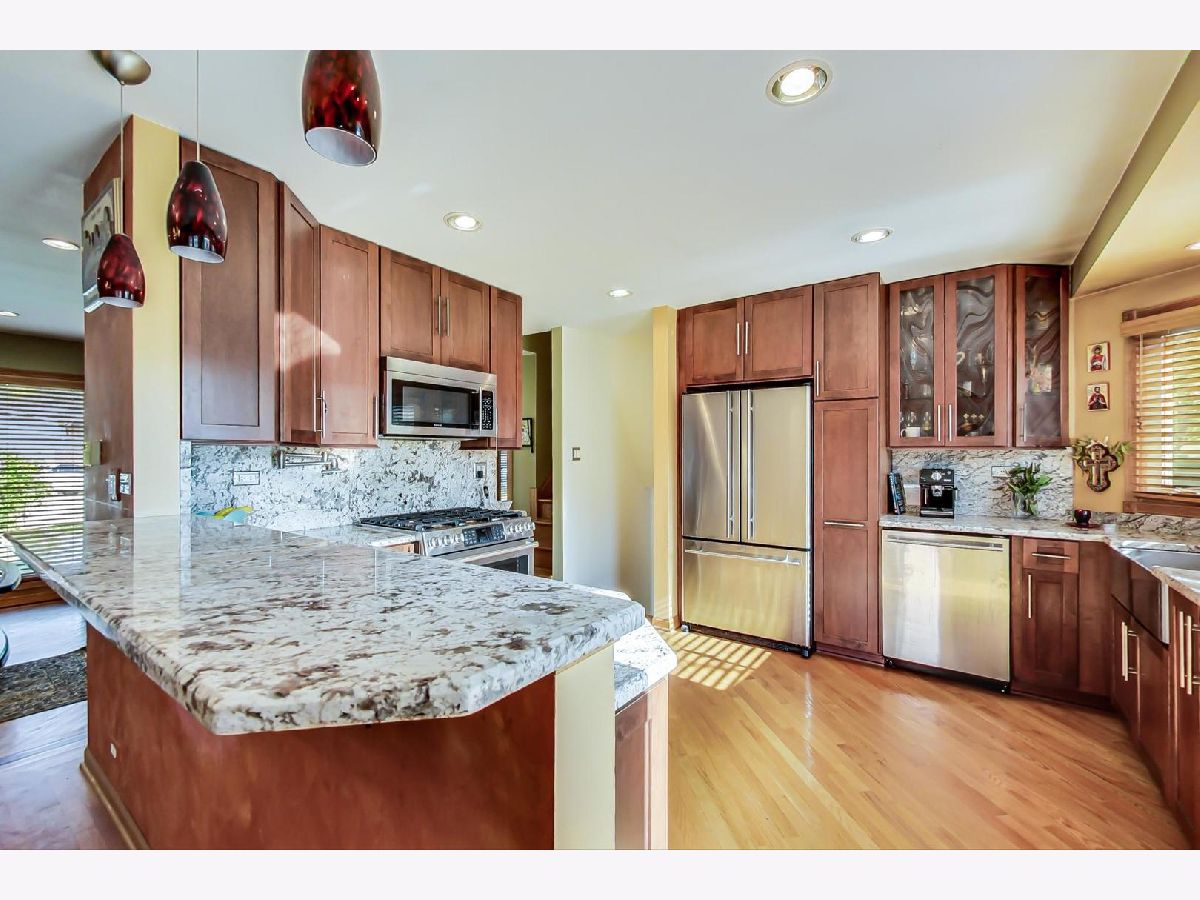 Bright & Spacious updated 3 bedroom, 2 bath split level in wonderful Brentwood Cul-de-sac location. Features include Updated kitchen with granite counter tops, 42' cabinetry, SS appliances, beautiful oak hardwood flooring w/inlay, oak doors and trim, recessed lighting and windows throughout. Sun drenched lower-level family room w/full bath, laundry & utility room with walk out to the huge back yard. Second level features 3 spacious bedrooms and a full bath. 2 car detached garage with side drive for extra parking. Beautifully landscaped with a new brick paver entryway. Close to schools, parks, shopping, expressways and more.