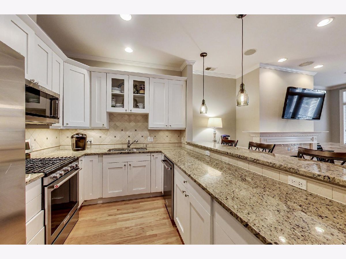 Bright and extra-wide 3 Bedroom/2 Bathroom 1,800 sq ft condo with MULTIPLE OUTDOOR SPACES, PARKING, and IN-UNIT LAUNDRY in the heart of Roscoe Village and Level 1+ Audubon School District! A functional floor plan boasts a spacious open-concept living room/dining room with fireplace, hardwood floors, crown molding, wainscotting throughout, and access to a large private balcony, perfect for summer entertaining. Seamlessly, you enter the kitchen featuring stainless steel appliances, crisp white cabinets, granite countertops, tile backsplash, and breakfast bar with plenty of room for seating. Down the hall, the primary bedroom is generous and features a walk-in-closet and access to the unit's second private deck. The spacious ensuite offers dual vanities with ample storage, and whirlpool. Rounding out this fabulous home are 2 additional large bedrooms, laundry closet, and a full bathroom. A common rooftop deck offers stunning city views. Unit has been freshly painted, additional features include: new Trex decking, new ceiling fans in bedrooms, Nest WiFi thermostat, and 1 exterior parking space. This home is ideally situated in Roscoe Village just moments to Hamlin Park and Audubon Elementary with close proximity to multiple bus lines, Kennedy Expressway, and all of the amazing shops, restaurants, and grocery options Roscoe Village has to offer. Pet Friendly! Must See!