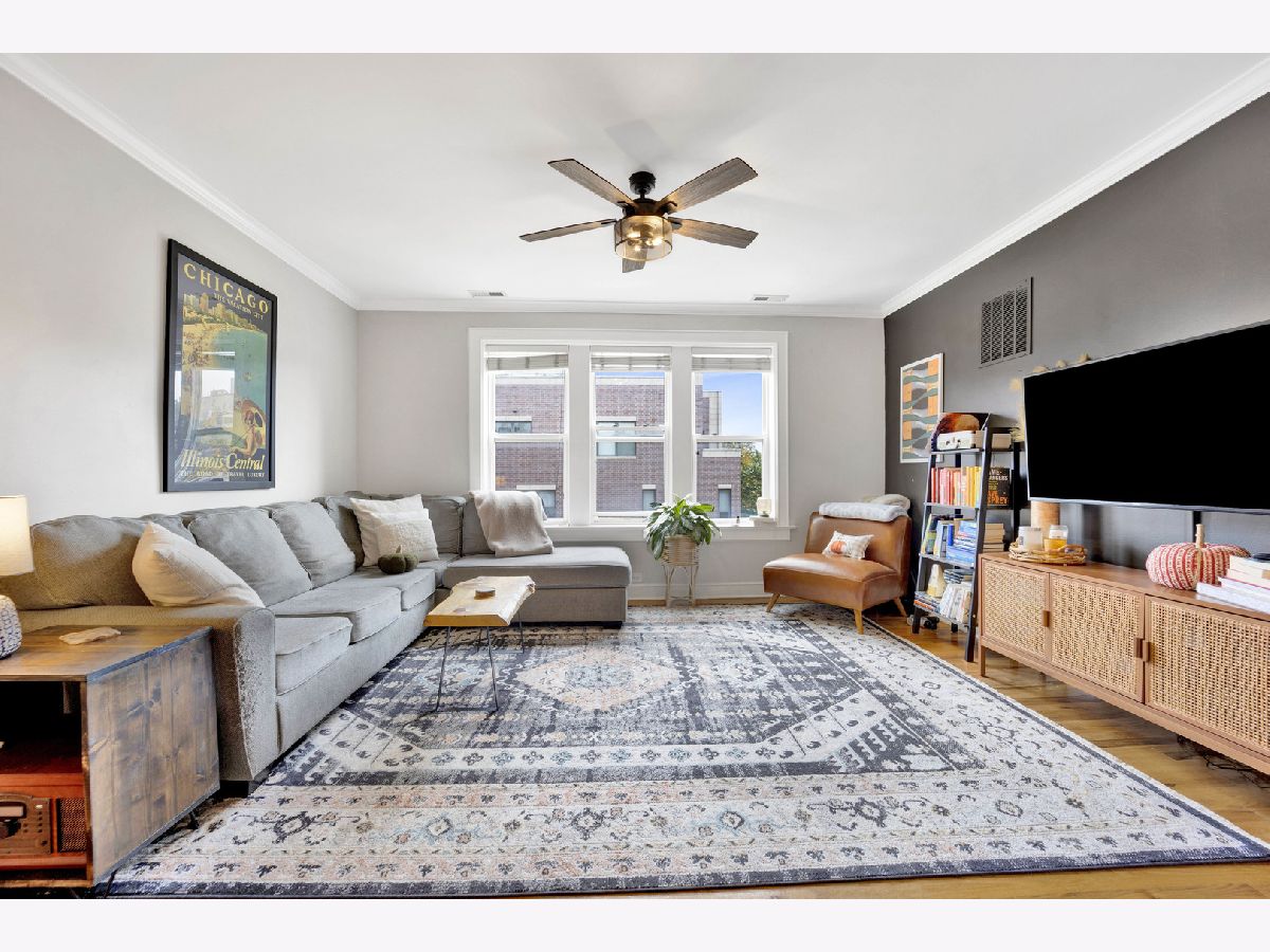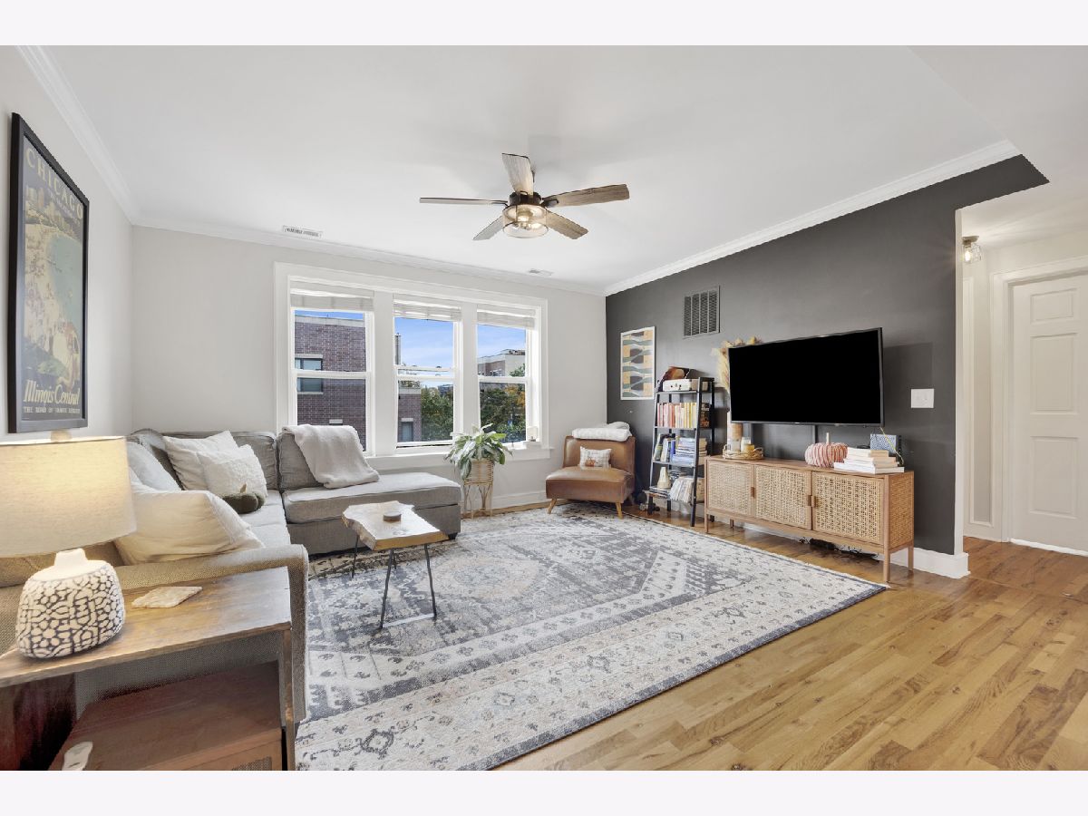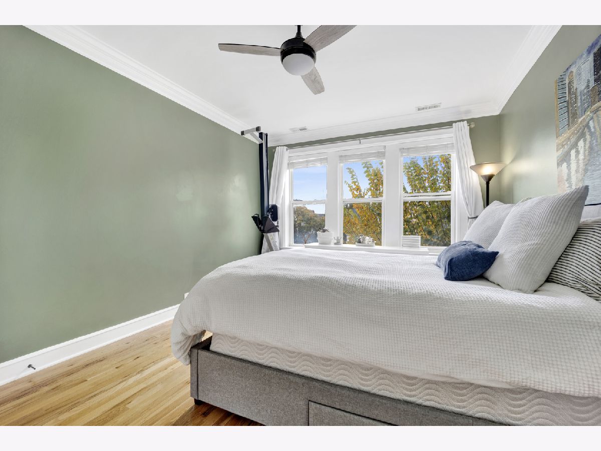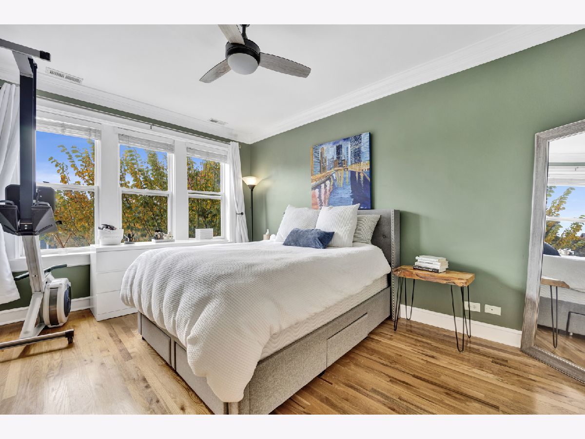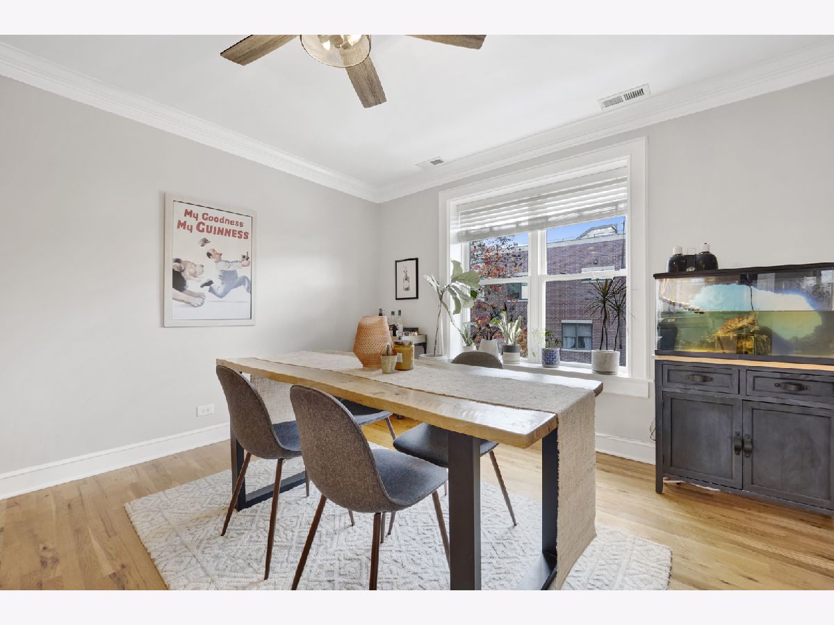 Incredible Roscoe Village corner unit penthouse! This 2 bedroom unit is the largest in the building and features hardwood flooring, crown molding, stainless steel appliances, a spacious breakfast bar, and formal dining room. Central AC, in-unit laundry, a large storage closet, and easy street parking sweeten the deal. Gorgeous bathroom renovated in 2022, water heater 2022, and AC 2021. Take full advantage of the shared deck for lounging in the fresh air! Located in the heart of Roscoe Village, this home immediately neighbors terrific dining and shopping options, and is minutes to the North Branch Riverwalk!