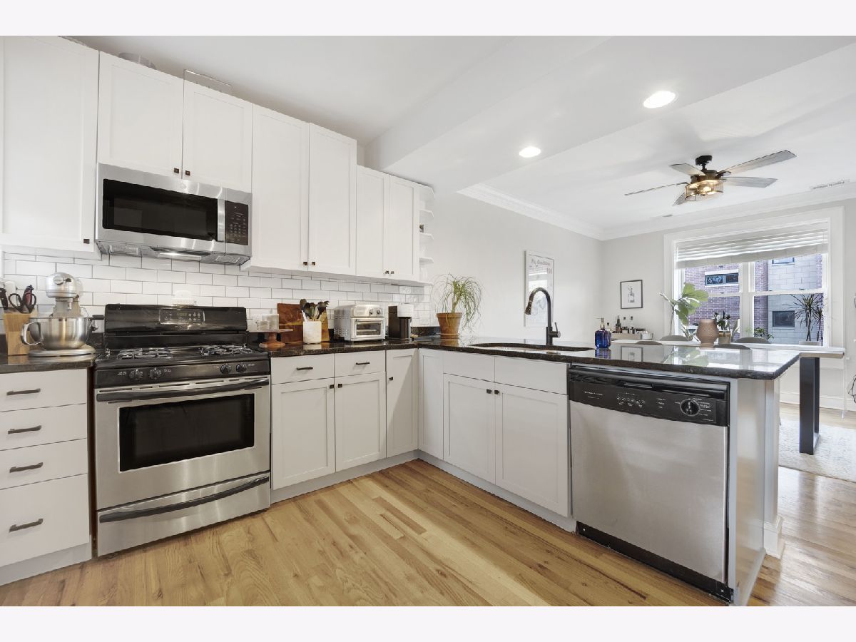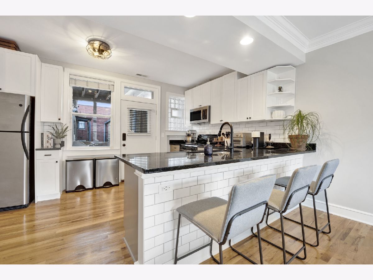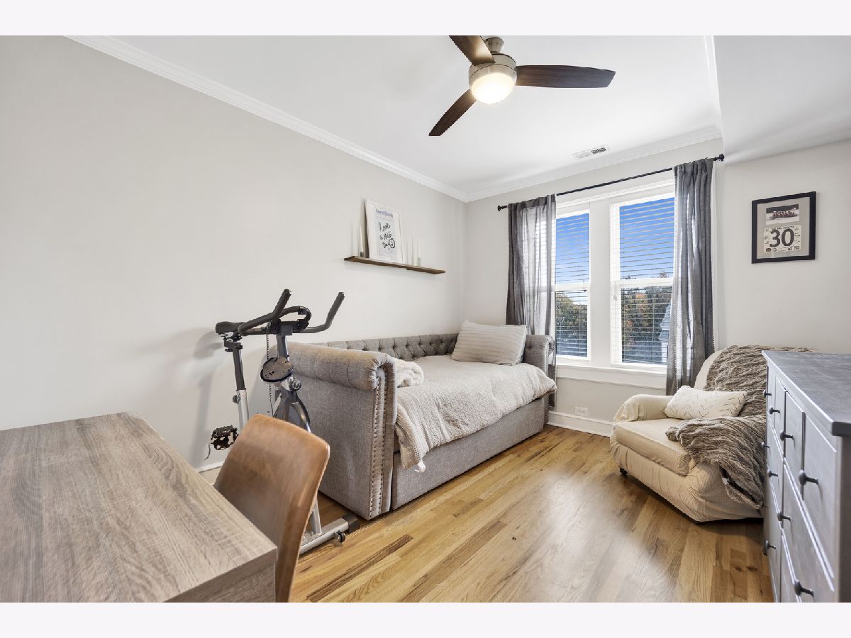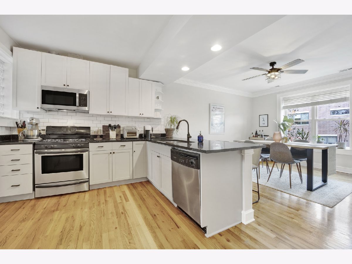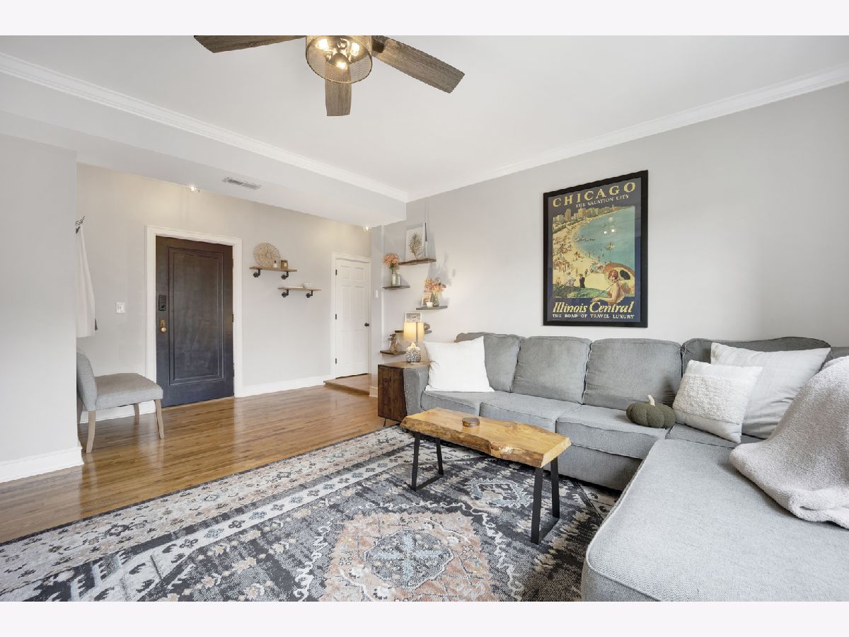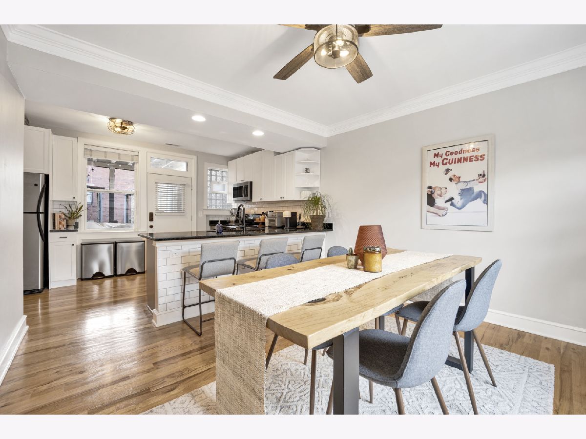 Incredible Roscoe Village corner unit penthouse! This 2 bedroom unit is the largest in the building and features hardwood flooring, crown molding, stainless steel appliances, a spacious breakfast bar, and formal dining room. Central AC, in-unit laundry, a large storage closet, and easy street parking sweeten the deal. Gorgeous bathroom renovated in 2022, water heater 2022, and AC 2021. Take full advantage of the shared deck for lounging in the fresh air! Located in the heart of Roscoe Village, this home immediately neighbors terrific dining and shopping options, and is minutes to the North Branch Riverwalk!