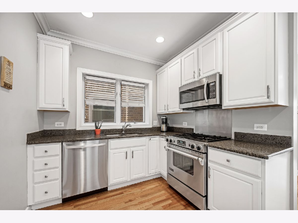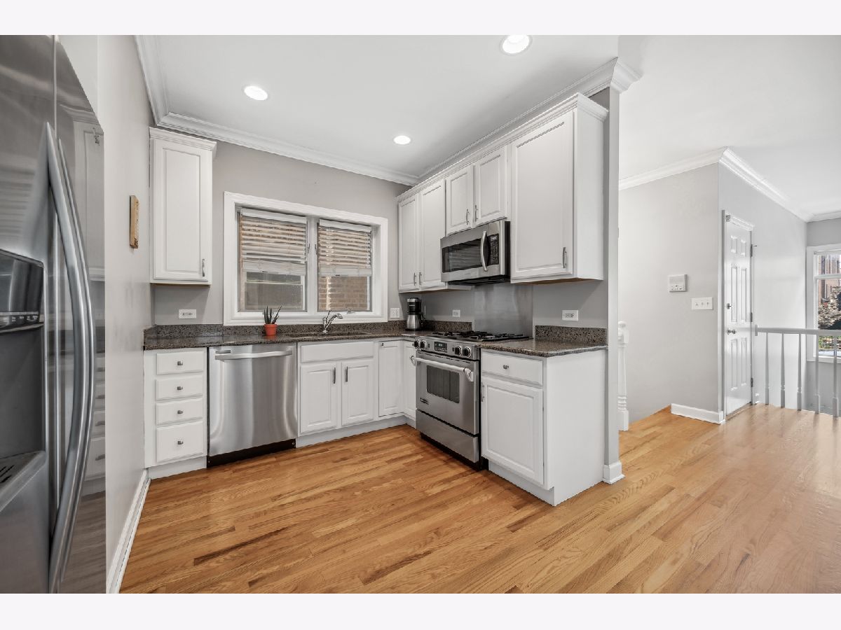 Welcome to your dream home in the heart of popular Bucktown! This stunning 3-bedroom, 3-full bathroom duplex down condo is nestled on a charming tree-lined street, offering both comfort and style. As you step inside, you'll be greeted by two levels of bright and sunny living space, enhanced by cathedral ceilings and motorized blinds that allow you to control the natural light effortlessly. The kitchen is a chef's delight, boasting 42" white cabinets, sleek stainless steel appliances, and elegant granite countertops, making meal preparation a pleasure. The lower level boasts an expansive living area, where you can relax by the cozy fireplace or create a bonus sitting/recreation area for entertainment and leisure. Working from home becomes enjoyable with a dedicated office nook that can also serve as a home gym to keep you fit and motivated. Step outside and revel in the beauty of the outdoors with multiple spaces to enjoy. A charming patio at the front of the condo provides a perfect spot for relaxation, while a large covered deck at the back offers a private retreat for al fresco dining and entertaining. The primary bedroom is a serene oasis with a spacious walk-in closet and an en-suite bathroom, ensuring you have all the privacy and convenience you need. The second bedroom is thoughtfully placed on the same level as the primary bedroom, while the third bedroom is downstairs, giving you and your guests the desired privacy and comfort. You'll find ample storage space throughout the unit with organized closets, and there's even a massive additional storage room outside the unit to accommodate all your belongings. Plus, no need to worry about parking, as the property includes one garage parking space. Other desirable features of this condo include convenient in-unit laundry, gleaming hardwood floors throughout the main level, and a favorable location within the highly desired Pulaski Elementary School district (Level 1+), just a short half-mile away. Don't miss this exceptional opportunity to own a delightful duplex down condo in Bucktown, offering the perfect blend of urban living and suburban tranquility. Schedule a tour today and make this beautiful property your new home!