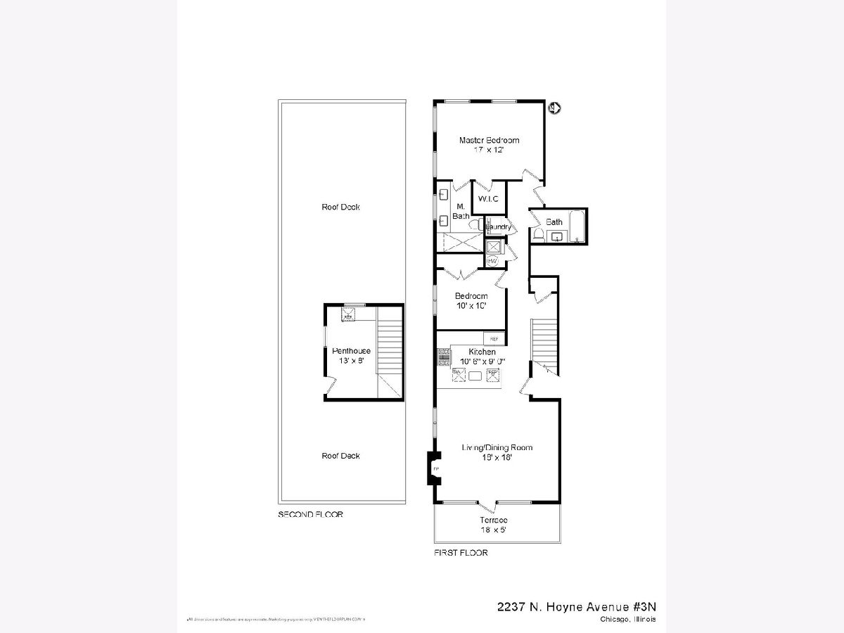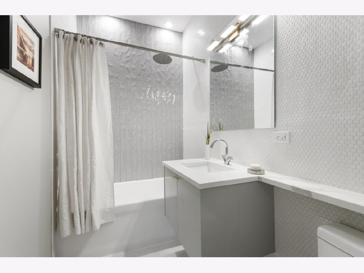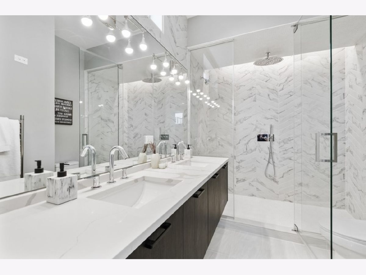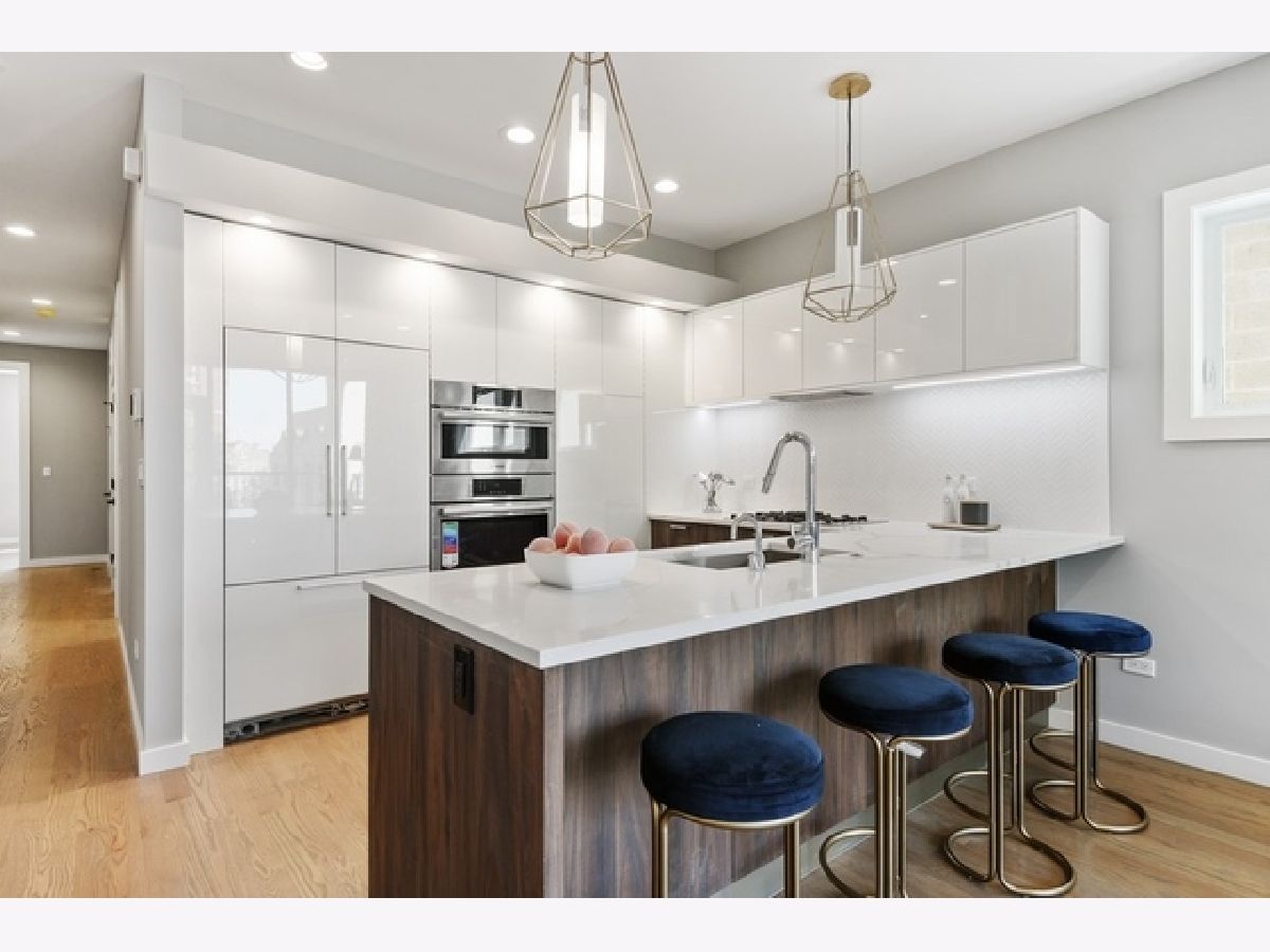 SOLD BEFORE PRINT Beautiful new construction modern penthouse designed by Halcyon Development! Well formed and highly functional kitchen featuring a mix of high gloss white and walnut color wood island, integrated premium appliance package, quartz counters, instant hot H20, and breakfast bar. Beautiful master bath with dual sinks, heated floors & heated towel bars. Floor to ceiling windows, porcelain tiles, 8' solid core doors, Modern Grey stained hardwood floors throughout, fully wired. Noise deadening triple paned windows. Front terrace off living room and private roof deck with unbelievable skyline views! Close to Holstein Park, Marianos, Midtown Athletic Club, transportation and more!