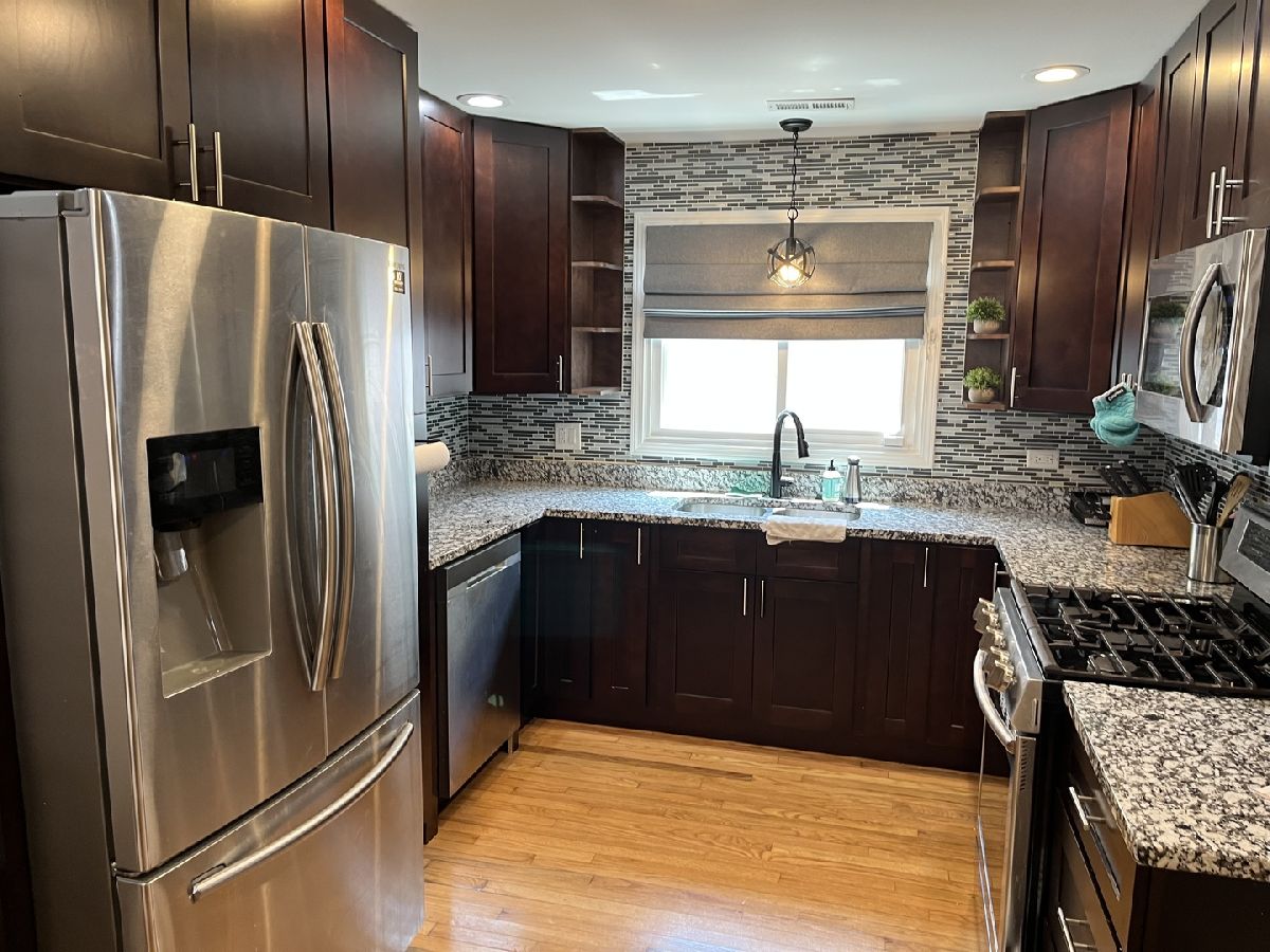 Thoughtfully & tastefully UPDATED 3 Bdrm Brick Ranch in attractive & charming Elmwood Park, IL !!!! You get a welcomed feeling when passing through it's tree-lined, well-groomed streets. Granite & stainless steel kitchen highlight this bright, airy and comfortable abode. Hardwood floors, walk-in closets w/organizers offer effective storage & predictability. Many of home's improvements & upgrades made in 2019, GFA Floor Furnace in attic, w/Central air unit, stainless steel refrigerator, stove, wall-mounted microwave, dishwasher, light fixtures, 200 Amp Electrical system, security system, home's addition & garage's vinyl-siding, side & backyard patio - area concrete, stainless steel front load washer & dryer & granite counters in spacious & bright utility area. A special home for growing family, empty nesters w/room for visiting family & friends, you get it. Although property is thoroughly well-maintained, to be "AS IS" Condition