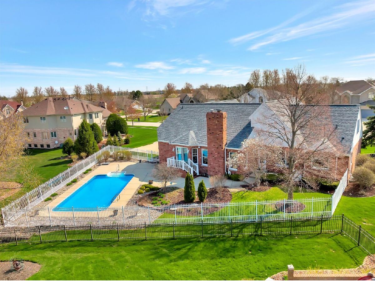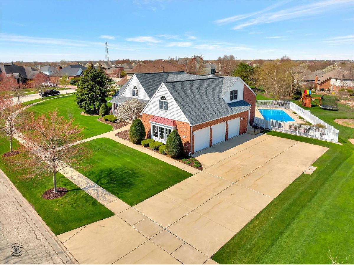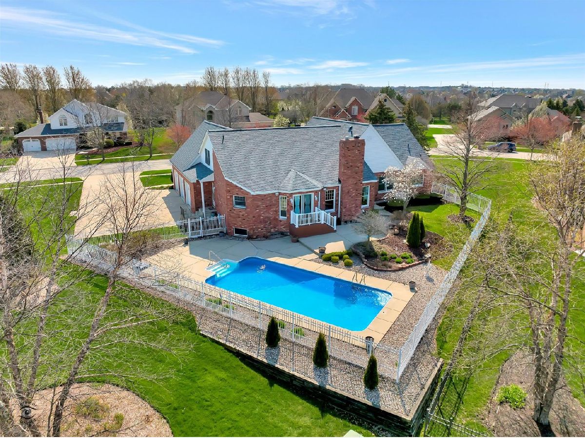 Captivate your senses at this inviting traditional-style Frankfort pool home with enduring charm! Gaze at its naturally lit, generously sized rooms and breathtaking soaring ceilings throughout. Arrive at the extra-long concrete driveway, leading to the three-car side-load garage and step inside the light and bright foyer, with dramatic views of the impressive oak staircase. You'll feel right at home in the over-sized open living room while the neutral colors, large windows, and an attractive fireplace with custom wood mantle provide a warm and welcoming feel. Entertaining will be a breeze with the home chef's dream kitchen which includes ample oak cabinetry, stainless steel appliances, center island with seating, a large walk-in pantry and bonus butler pantry adjacent to the craftsman style dining room with gleaming hardwood floor. The main floor owner's suite boasts two walk-in closets w/organizational shelves, glam bath w/jetted tub, separate shower & dual sinks. There is a work from home space that will be the envy of your Zoom meetings with admirable views of the backyard, built in shelving, large closet and French doors for privacy. This office space can easily be transformed into a main level bedroom! At the top of the stairs, you'll find a spacious loft with many useful possibilities. Another unique feature of this home is the dual stairs. The second stairway is located near the kitchen for easy access to the second floor. Summer memories will surely be made in the beautiful outdoor living space with a 16'x32' heated in-ground pool. All pool equipment conveys, including the mesh winter cover, and basketball & volleyball nets. The pool is 3 1/2 feet deep in the shallow and 5 1/2 feet in the deep end. If you're looking for added living space then look no further than the smartly finished basement which includes a full bath, lush carpet, built-in cabinetry, and a huge dedicated storage room. This home boasts many upgrades including new kitchen flooring, new roof in 2020, pool vinyl liner in 2018, central vacuum, ceiling fans throughout, reverse osmosis water tank, garbage disposal, furnace humidifier, radiant heated basement and garage flooring, fully fenced yard, and in-ground sprinkler system. All appliances convey. Let your new journey begin at 22402 Hughes Street, Frankfort!