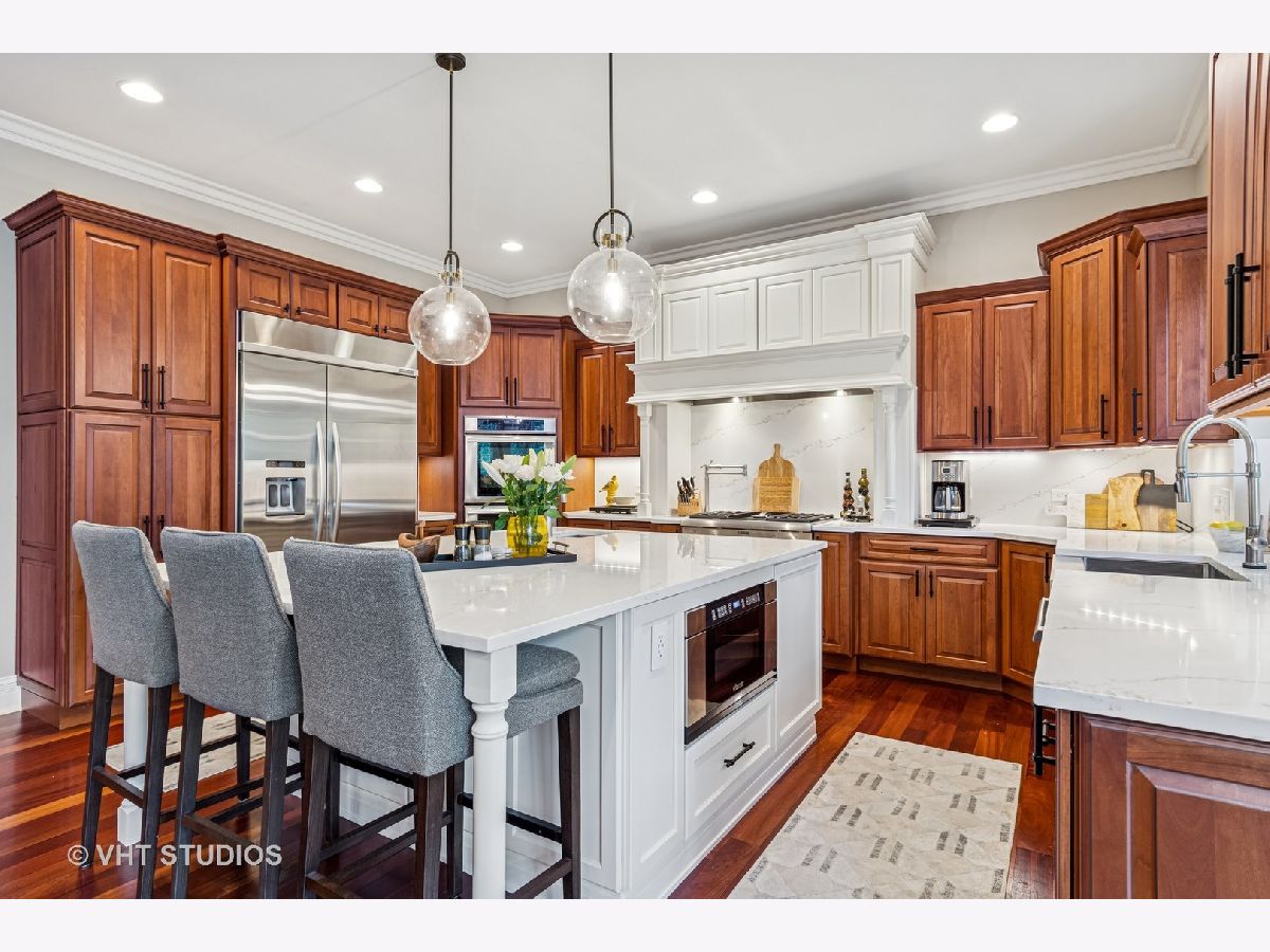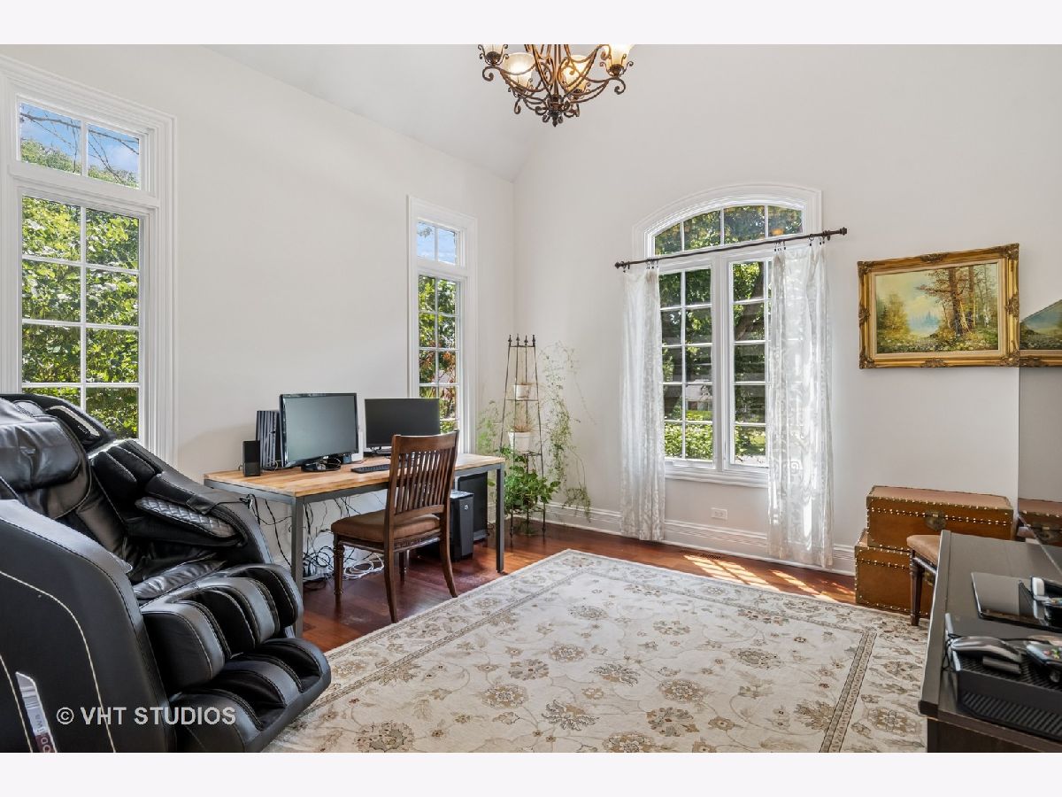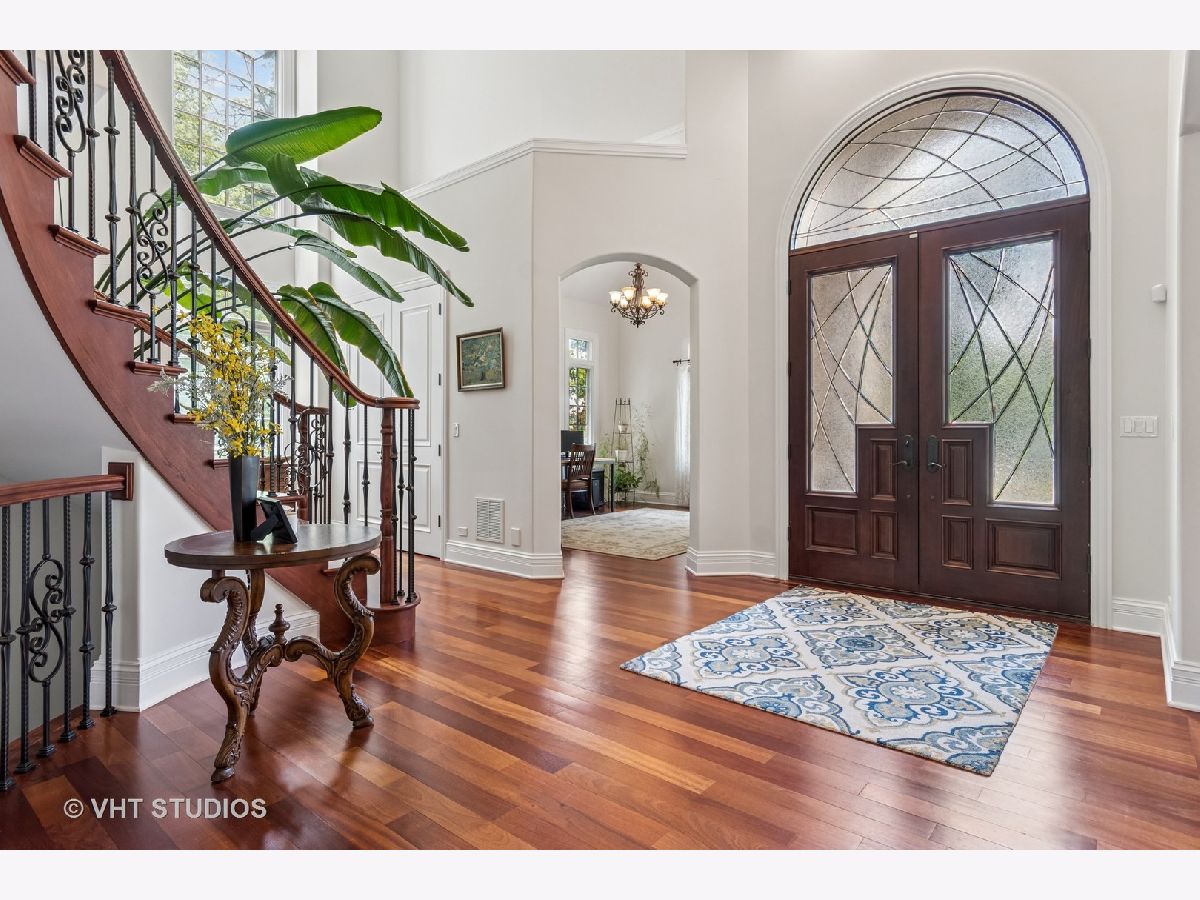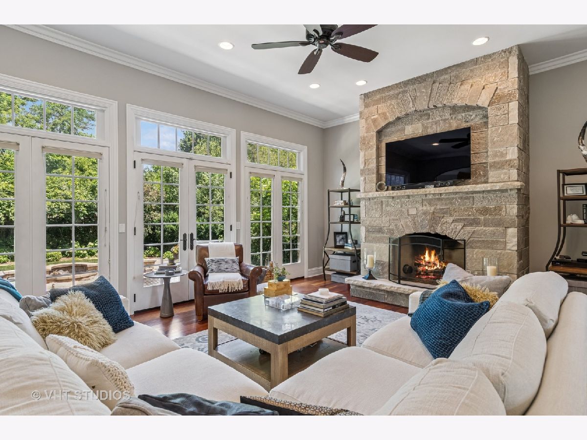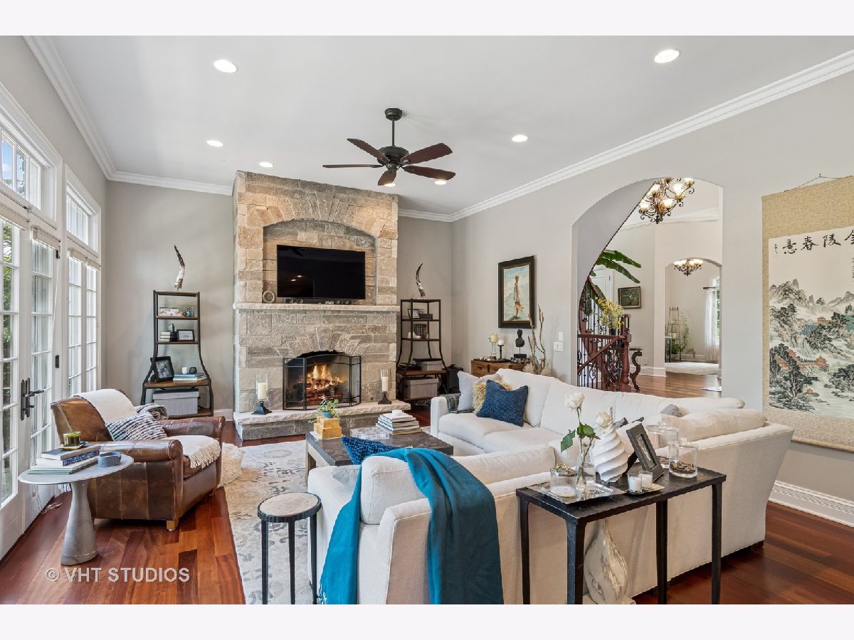 Welcome to this exquisite custom-built home in highly sought-after Glen Ellyn, featuring timeless all-brick and stone exterior, a 3-car garage, and over 6,200 sq ft of living space (4,233 sq. ft. above grade plus 1,982 sq ft in the partially finished basement). Inside, you'll find exceptional craftsmanship throughout, starting with the grand two-story foyer, curved staircase with wrought iron balusters, arched doorways, art niches, and wainscoting. The main level boasts 10 ft. ceilings, solid hardwood flooring, and an open-concept layout. A versatile living room/flex space, a formal dining room with custom detailing, and a wet bar set the stage for effortless entertaining. The gourmet kitchen features custom cabinetry, a new island with seating, Quartz countertops and backsplash, striking custom hood with Quartz backdrop, farmhouse sink, pendant lighting, Thermador range and built-in double oven, and a built-in KitchenAid refrigerator. The adjoining eating area flows seamlessly into the show-stopping family room with a custom stone fireplace and a wall of windows overlooking lush landscaping. A main floor guest suite with full bath provides ideal accommodations for visitors. The spacious mudroom off the garage offers a practical everyday entry. Upstairs, the luxurious primary suite is a true retreat with double doors, fireplace, tray ceiling with accent lighting, two walk-in closets, and a spa-like bath featuring heated floors, a large steam shower, soaking tub, dual vanities, makeup station, and water closet. The second bedroom is a private en-suite with vaulted ceiling, walk-in closet, and heated-floor bathroom. Bedrooms three and four share a Jack and Jill bath, while bedroom four also features a sitting/study area and oversized walk-in closet. A full hall bath includes dual sinks, heated floors, and water closet. The finished basement offers even more space with a recreation room and custom stone fireplace, exercise room, game room, wine room, bonus room, full bath, and in-floor heating rough-in. Exterior highlights include a brick paver driveway, walkway, and patio with firepit, creating a seamless and elegant landscape design. Additional upgrades include dual HVAC systems, two tankless water heaters, whole-house generator, and two air cleaners. Thoughtfully designed with exceptional detail and quality throughout-this is truly a place to call home.