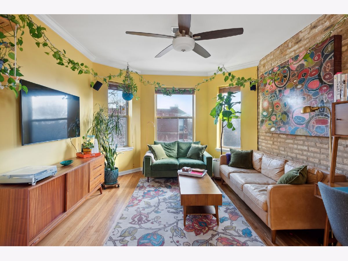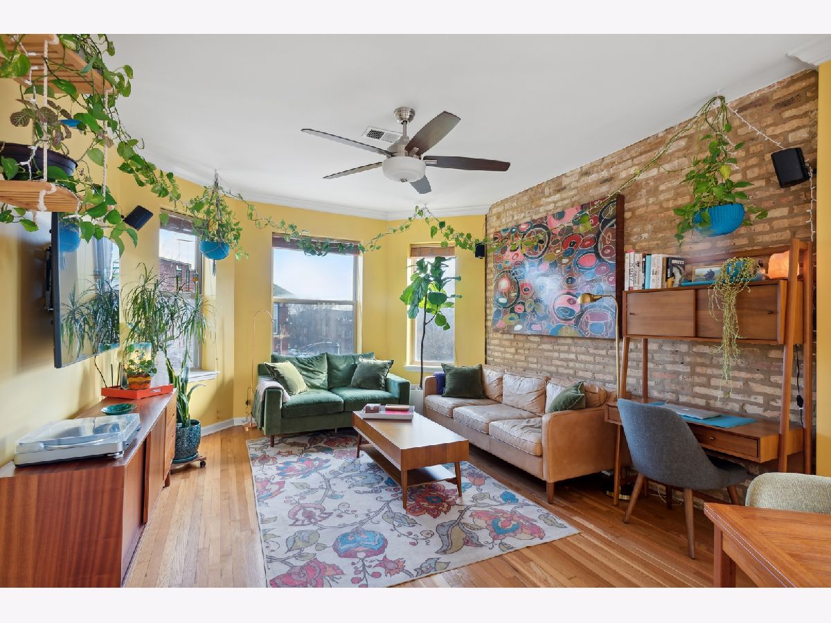 This super bright, updated top floor 2 bedroom/ 2 bath in Logan Square is not to be missed! Features include an open floor plan, exposed brick walls, and hardwood floors throughout. The open kitchen has 42" cabinets, all stainless steel appliances, granite countertops, tiled backsplash, and an island/breakfast bar which is situated next to a large south facing window that welcomes a ton of natural light. The serene primary bedroom has room for a king size bed, a wall of professionally organized closets, and an updated ensuite bathroom with a double vanity and shower with multiple sprays. The second bedroom features a built-in shelving system with wonderful storage perfect for its current use as a den/office. The back hall works like a mudroom with newer tiled floors and in-unit laundry, which leads to the private and spacious rear deck which overlooks a shared yard! Wonderfully maintained unit with a number of updates including the gorgeous 2nd bathroom that was gutted in 2020, new dishwasher and oven in 2021, and new A/C condenser in 2022. Includes a large designated storage space in the basement. Fabulous Logan Square location - a short walk to trains and buses, Palmer Square, 606 Trail, Logan Square Market, and many great restaurants and bars!