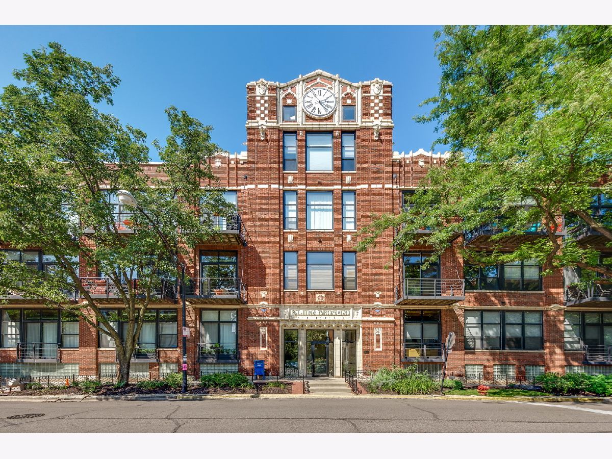 Stunning 2 bed 1.1 bath unit at Clock Tower lofts featuring rare 18X15 ft stone terrace! Large extra wide corner unit with high timber ceilings, hardwood floors throughout, and exposed brick! Living room with custom stone fireplace open to updated open island kitchen with double waterfall counters and stainless appliances! Fabulous lofted master bedroom with walk in closet plus built ins, and renovated master bath with Grohe fixtures, deep soaking tub and dual shower heads! Great second bedroom with full wall of closets opens to patio! Amazing custom stone terrace with built in bench, hose bib and tree! Perfect low maintenance outdoor space for entertaining! Garage parking and extra storage included! Popular Bucktown loft building includes exercise room and rooftop deck with city views! Perfect location close to the best of Bucktown, the 606 and public transportation! Must see!