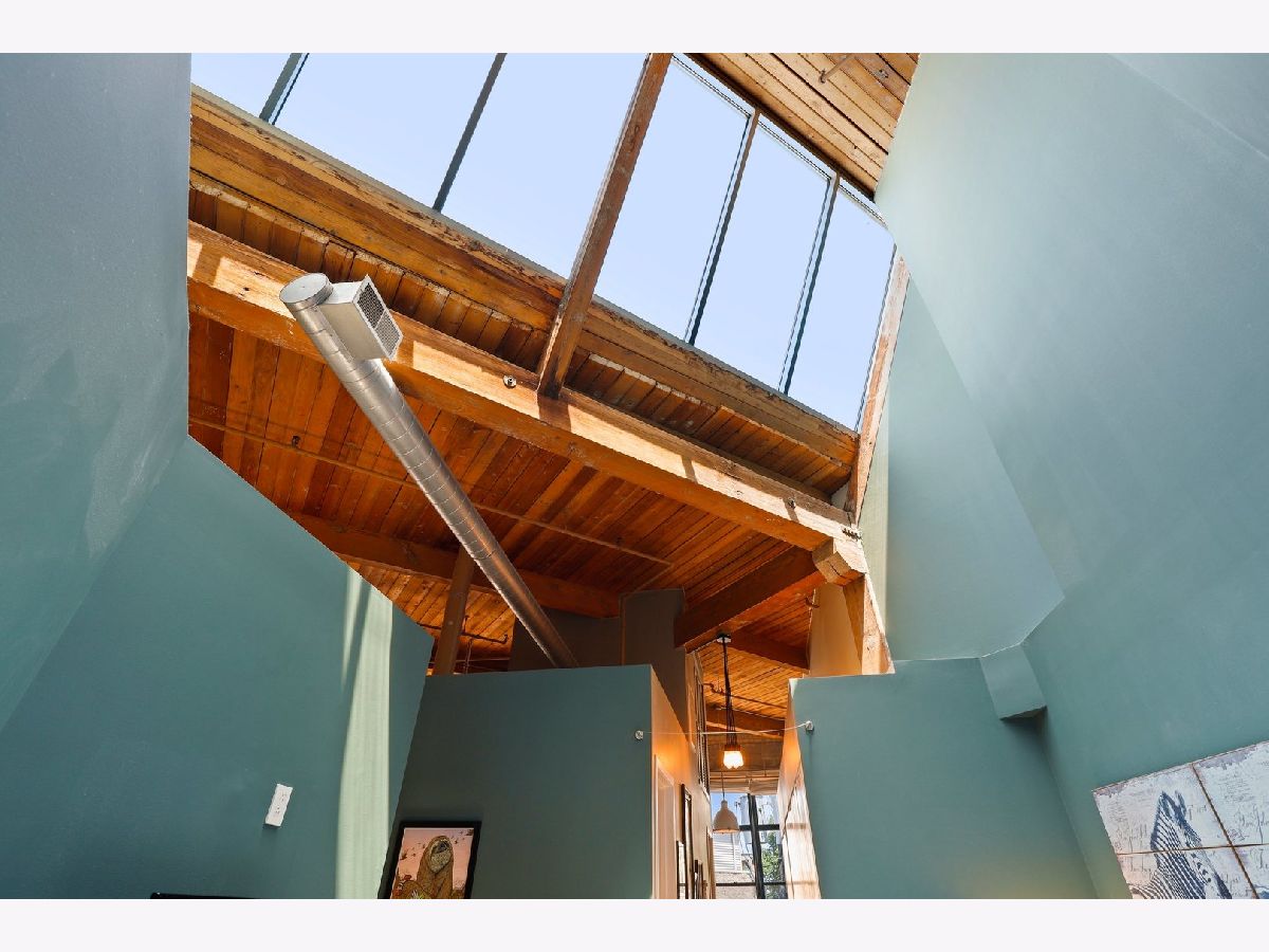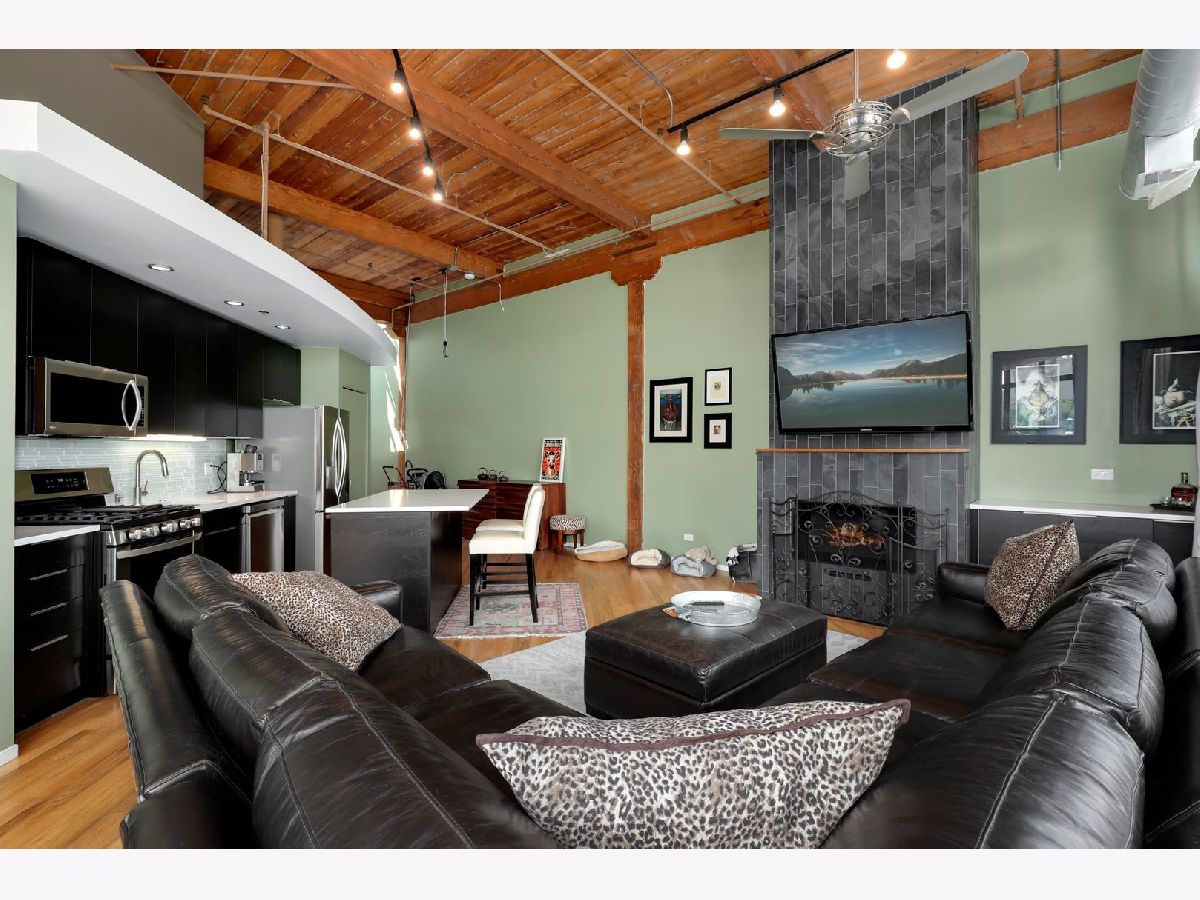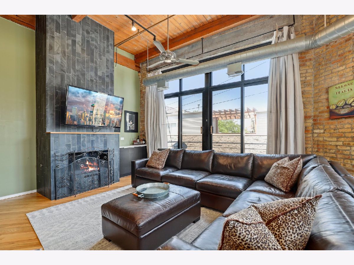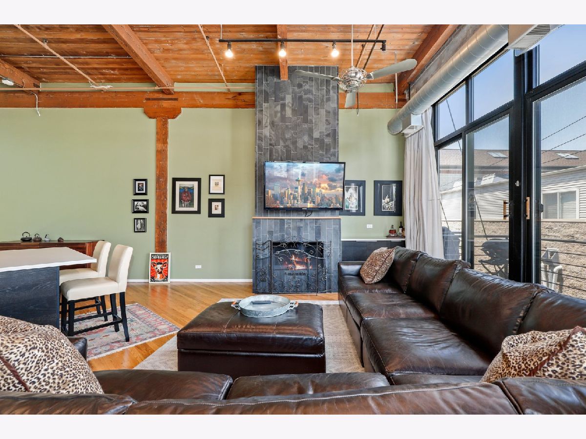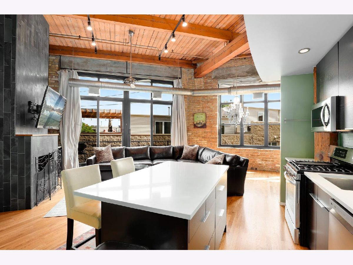 RARELY AVAILABLE TOP FLOOR BRICK AND TIMBER LOFT WITH SKYLIGHTS. Welcome home to Clocktower Lofts in prime Bucktown location close to everything! The 606, Western and Damen Blue Line access, parks, Robey Hotel, Piece Pizza, Big Star, Handlebar, Wormhole, shopping, dining and nightlife are all right outside your front door. Move-in and enjoy your summer on your own private, quiet north facing balcony or common rooftop deck. This split floor plan, two-bedroom home is one of the most unique units in the building and offers massive amounts of natural light all day long. Features include dramatic vaulted 16 ft ceilings throughout, and 20 ft ceilings in Master bedroom with skylights, beautiful exposed brick and ductwork, hardwood floors, gas fireplace with custom modern surround that reaches the ceiling, a full wall of windows with custom window coverings and private balcony. The kitchen is the center of the condo and has been updated with brand new stainless steel appliances and Quartz countertops. It offers a center island perfect for gathering and entertaining and is open to the living and dining room with a beautiful chandelier. Remodeled modern bathroom + guest bathroom, Bosch washer/dryer in unit and tons of closet space throughout. Heated, deeded indoor garage parking and storage unit included! Clocktower Lofts offers secured entry, exercise room and rooftop deck with 360 city views. Click on the 3D tour and take a walk around before booking your private showing. Contact-free or video showings available. Don't miss out on this wonderful opportunity!