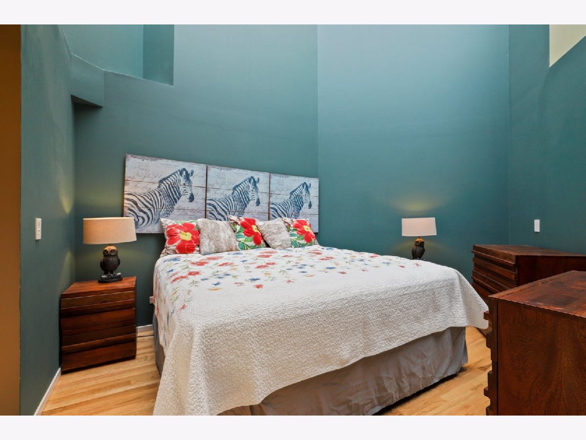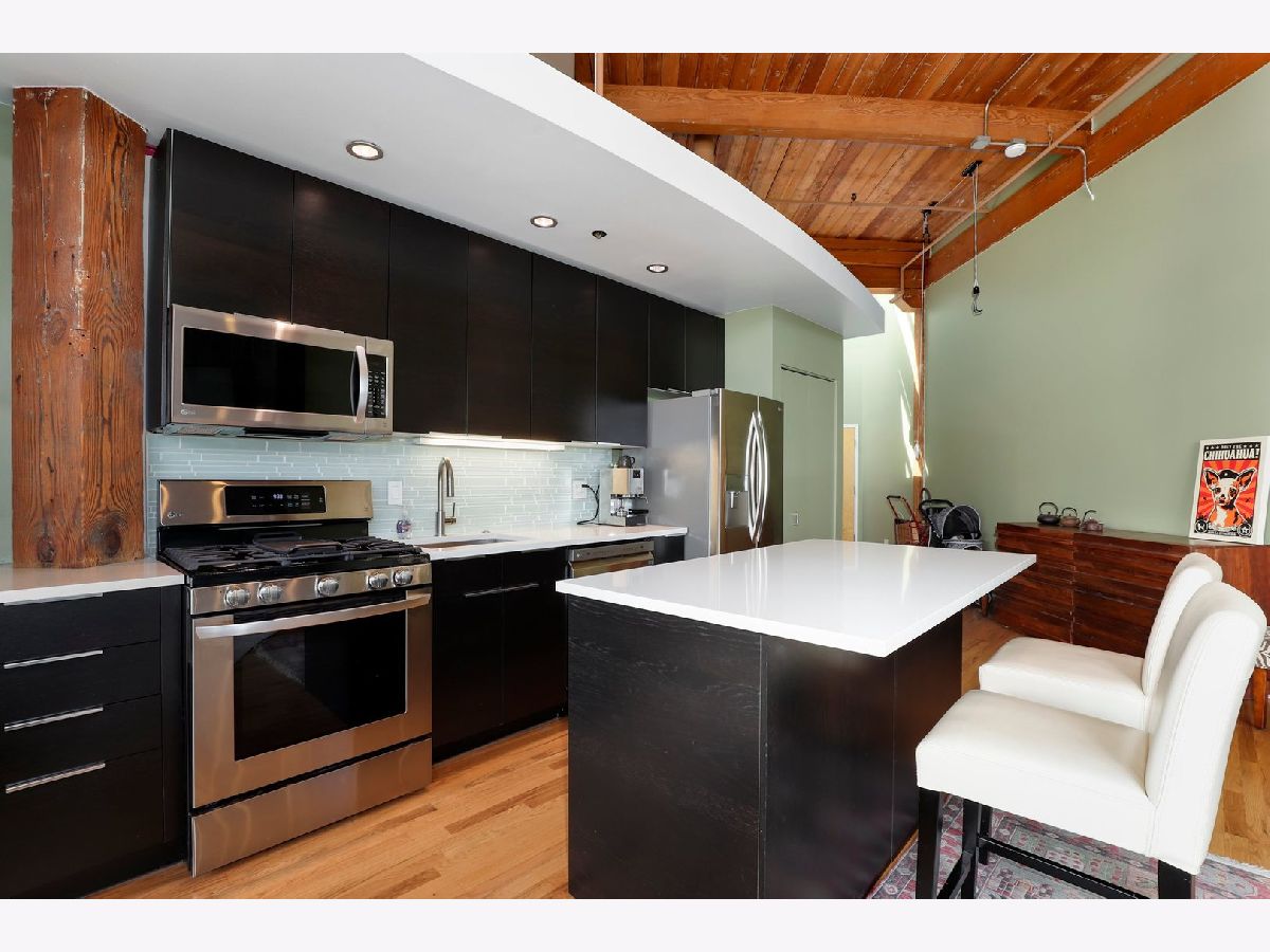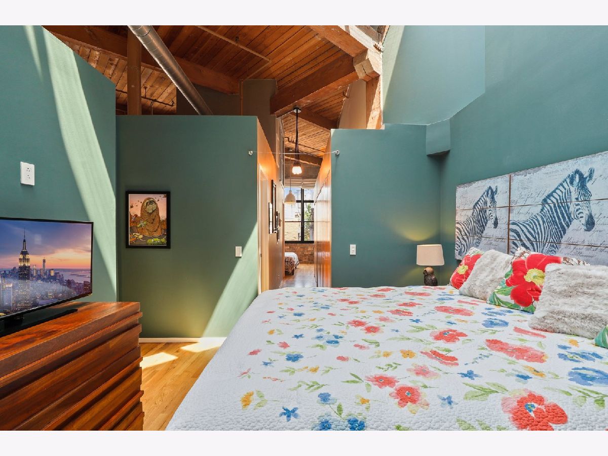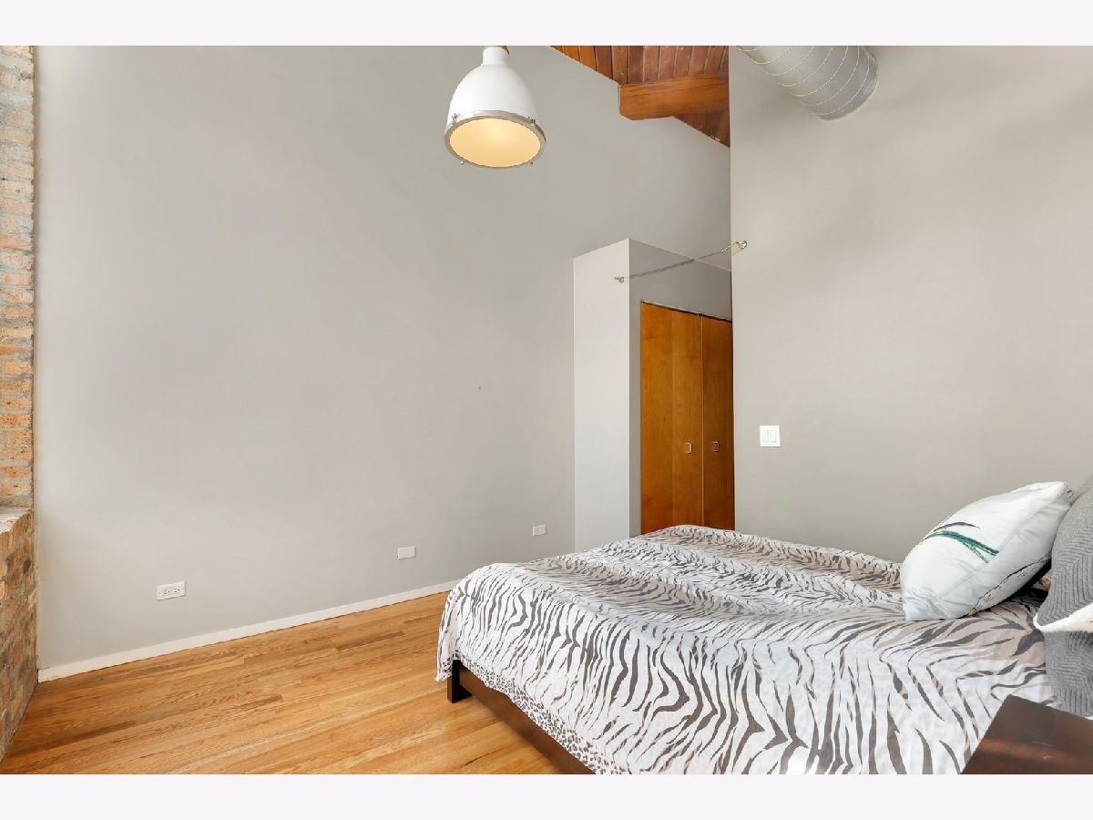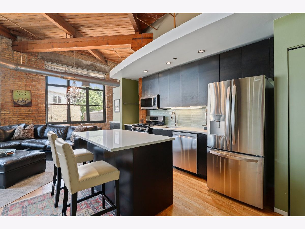 RARELY AVAILABLE TOP FLOOR BRICK AND TIMBER LOFT WITH SKYLIGHTS. Welcome home to Clocktower Lofts in prime Bucktown location close to everything! The 606, Western and Damen Blue Line access, parks, Robey Hotel, Piece Pizza, Big Star, Handlebar, Wormhole, shopping, dining and nightlife are all right outside your front door. Move-in and enjoy your summer on your own private, quiet north facing balcony or common rooftop deck. This split floor plan, two-bedroom home is one of the most unique units in the building and offers massive amounts of natural light all day long. Features include dramatic vaulted 16 ft ceilings throughout, and 20 ft ceilings in Master bedroom with skylights, beautiful exposed brick and ductwork, hardwood floors, gas fireplace with custom modern surround that reaches the ceiling, a full wall of windows with custom window coverings and private balcony. The kitchen is the center of the condo and has been updated with brand new stainless steel appliances and Quartz countertops. It offers a center island perfect for gathering and entertaining and is open to the living and dining room with a beautiful chandelier. Remodeled modern bathroom + guest bathroom, Bosch washer/dryer in unit and tons of closet space throughout. Heated, deeded indoor garage parking and storage unit included! Clocktower Lofts offers secured entry, exercise room and rooftop deck with 360 city views. Click on the 3D tour and take a walk around before booking your private showing. Contact-free or video showings available. Don't miss out on this wonderful opportunity!