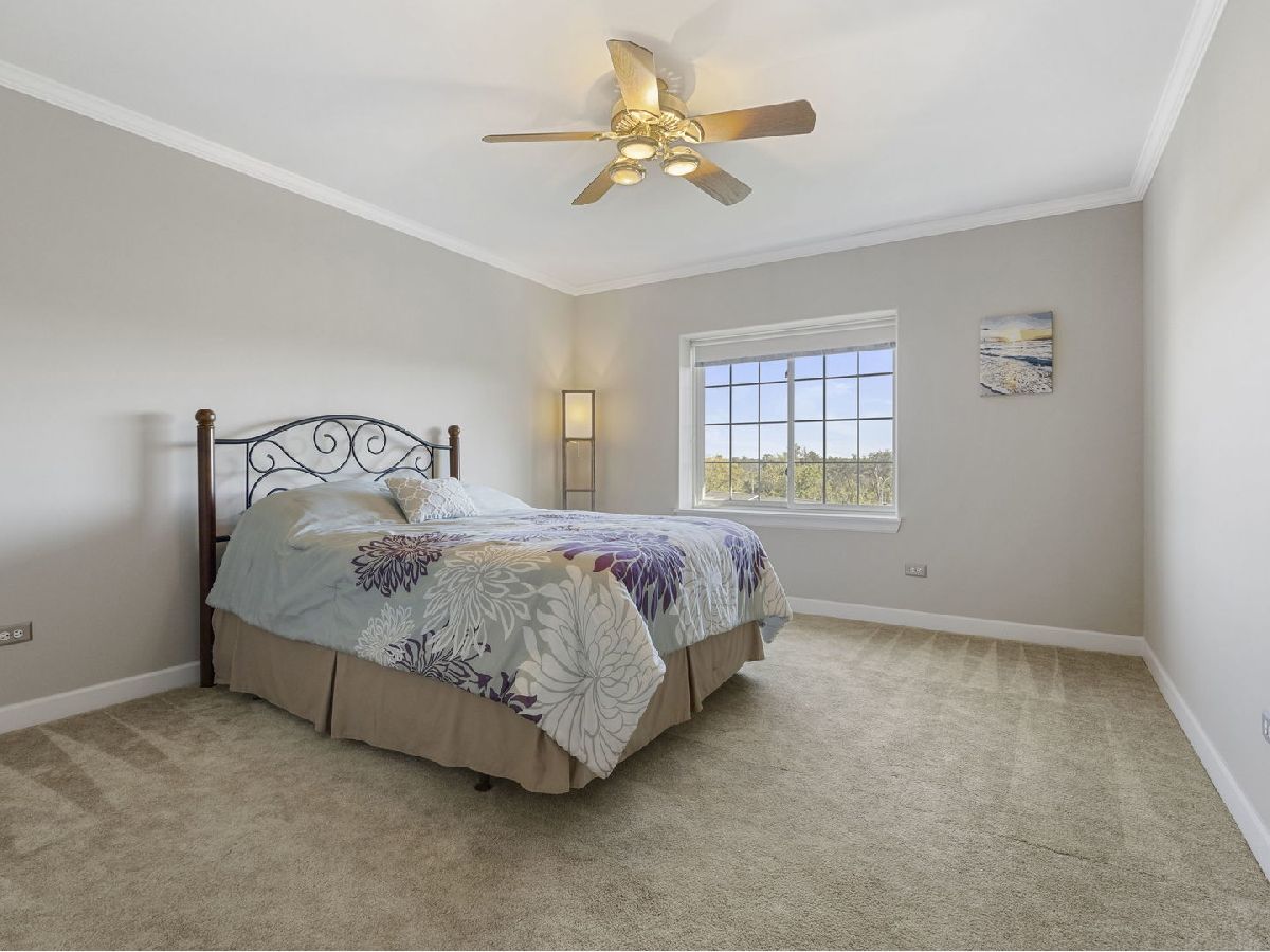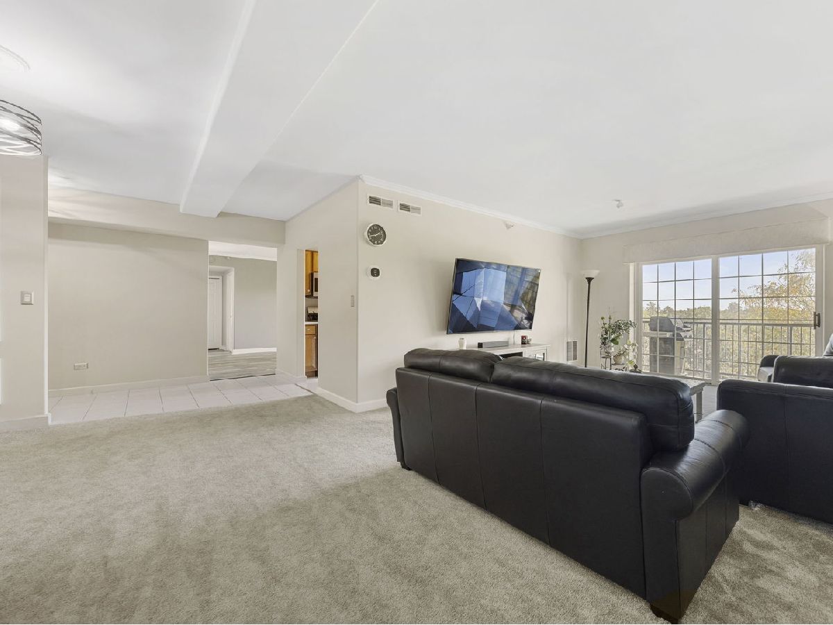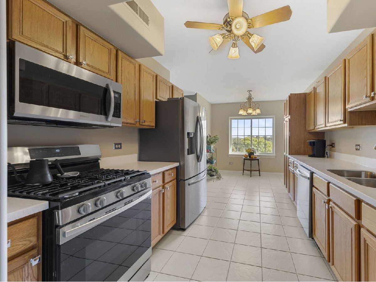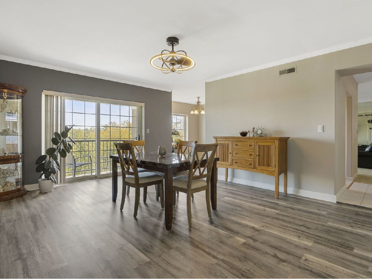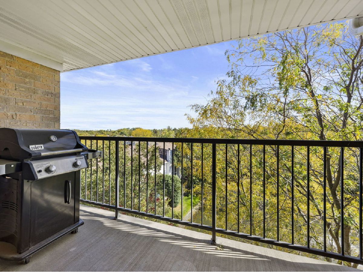 Welcome home to this fabulous Waterfall Glen penthouse condo! This corner end unit overlooks the serene forest preserve and a peaceful pond with fountain view. Coveted quiet southeastern exposure with tons of natural light. Unit boasts the LARGEST floor plan~ 1775 sq ft and feels expansive! Soak in the treetop views with the double balconies off both living and family rooms. All new stainless appliances (2022) and brand new Corian counters, undermount sink, and faucet (2024) installed in the recently painted kitchen (2024). The rarely available family room is a convenient flex space currently serving as eating space with newer vinyl laminate flooring recently installed (2022). Generous sized bedrooms; the primary suite offers spa like bath, walk in closet and the second bedroom is perfect for all your needs. Newest technology mirrors with lighting installed in both bathrooms (2024). Separate laundry room with cabinet storage off the family room. Furnace and A/C installed (2018). New modern lighting fixtures with fan features accent the unit (2021). Heated first floor garage parking plus secure elevator building convenience. Plenty of storage located both in the 5th level storage room and deep storage area by the parking spot #61 in garage. Enjoy the ease of expressways, restaurants, shopping, and all the beauty of the Waterfall Glen forest preserve!