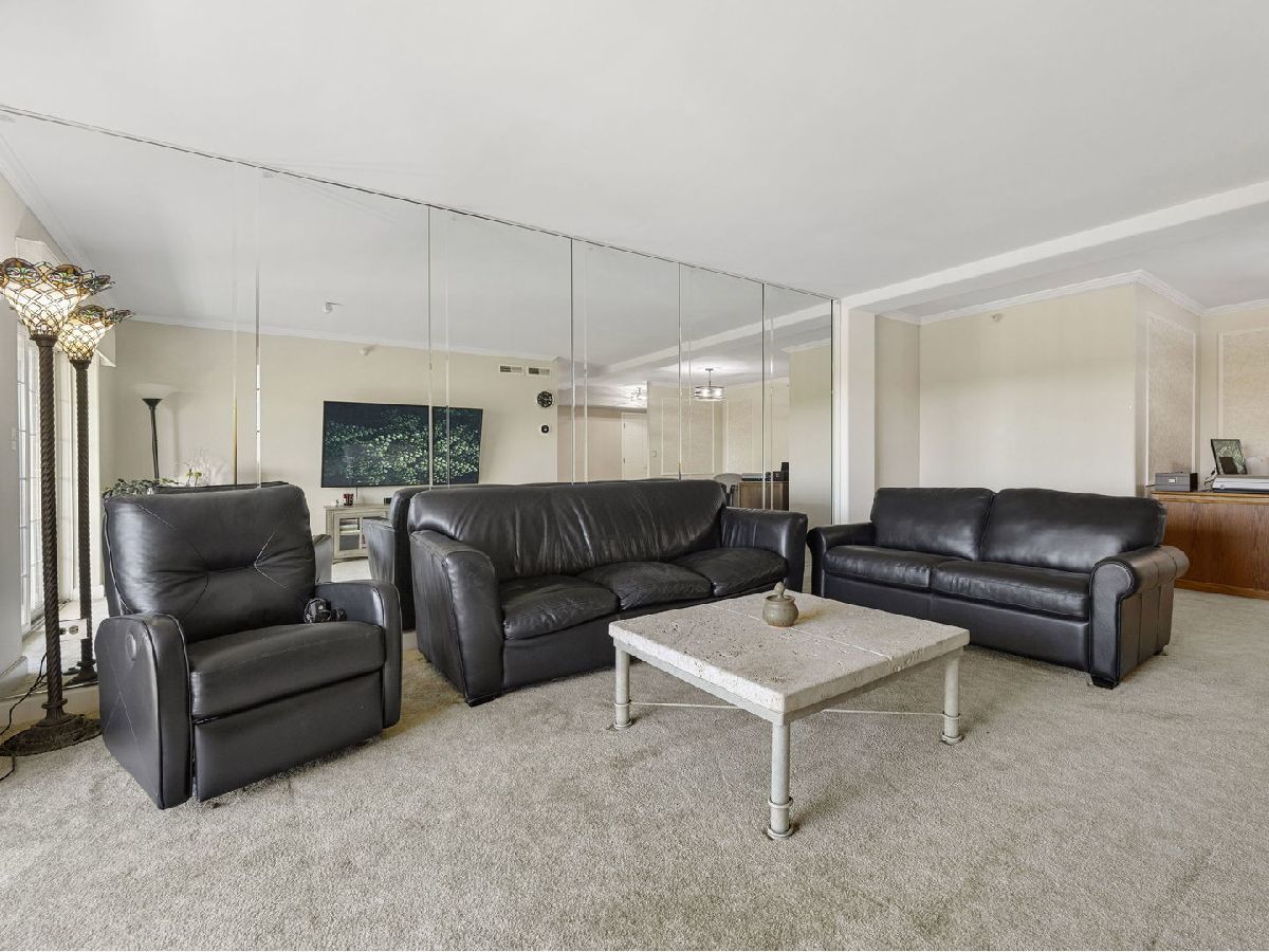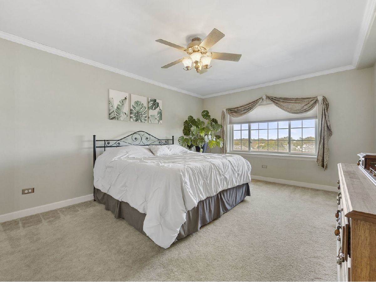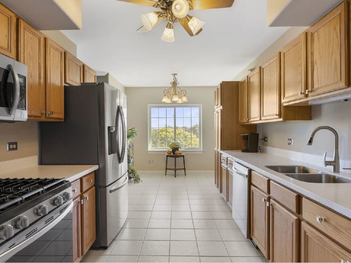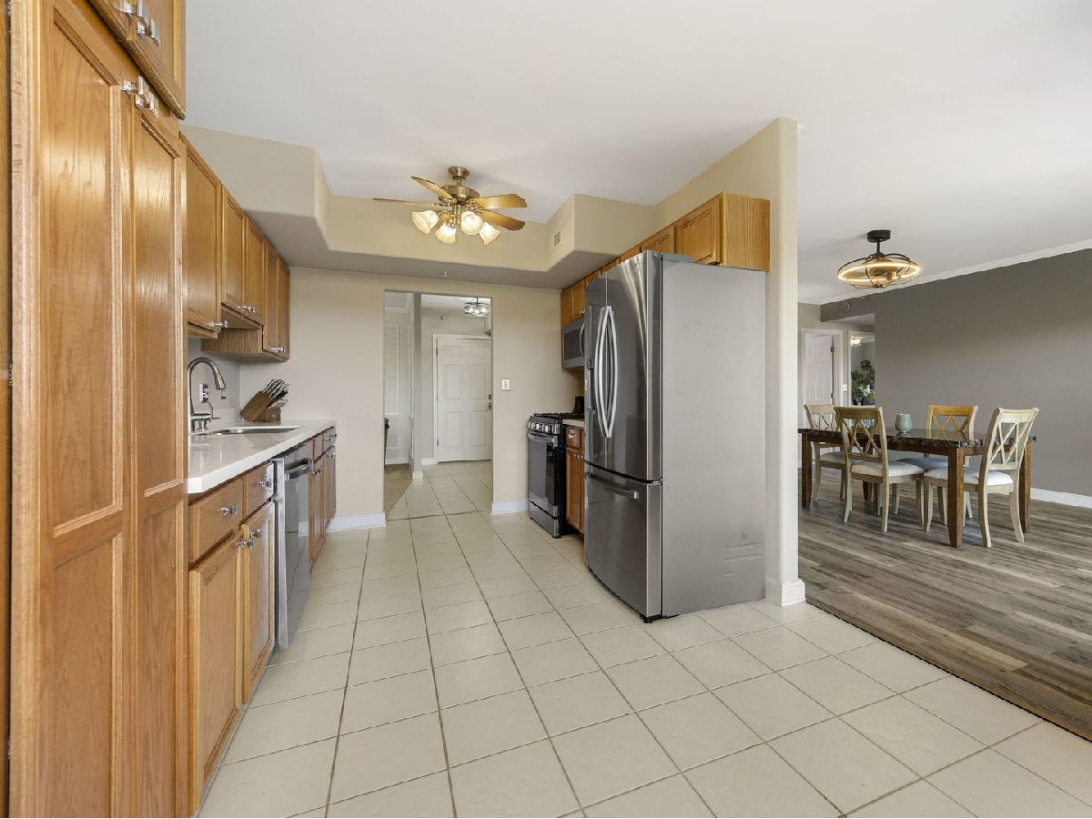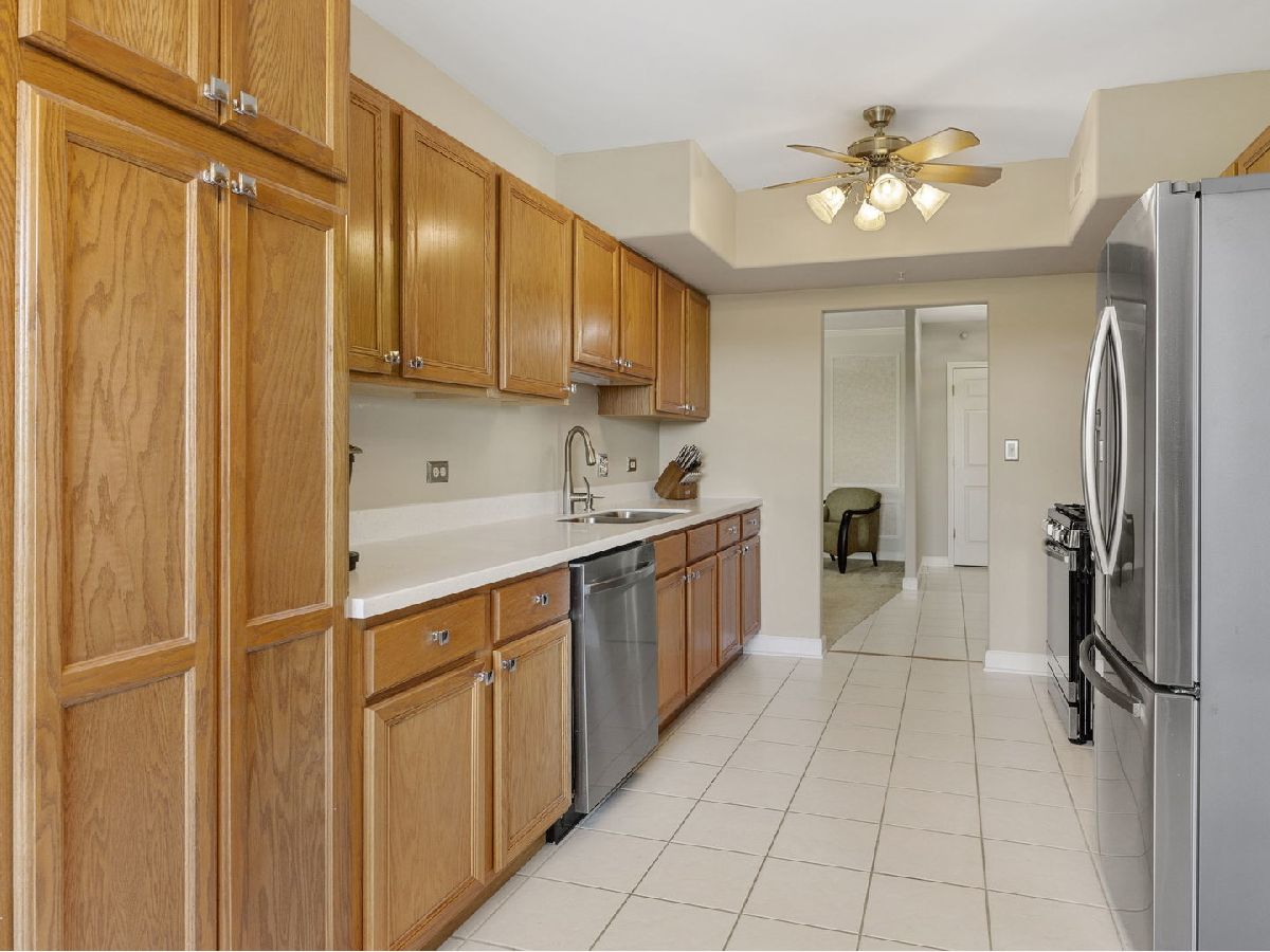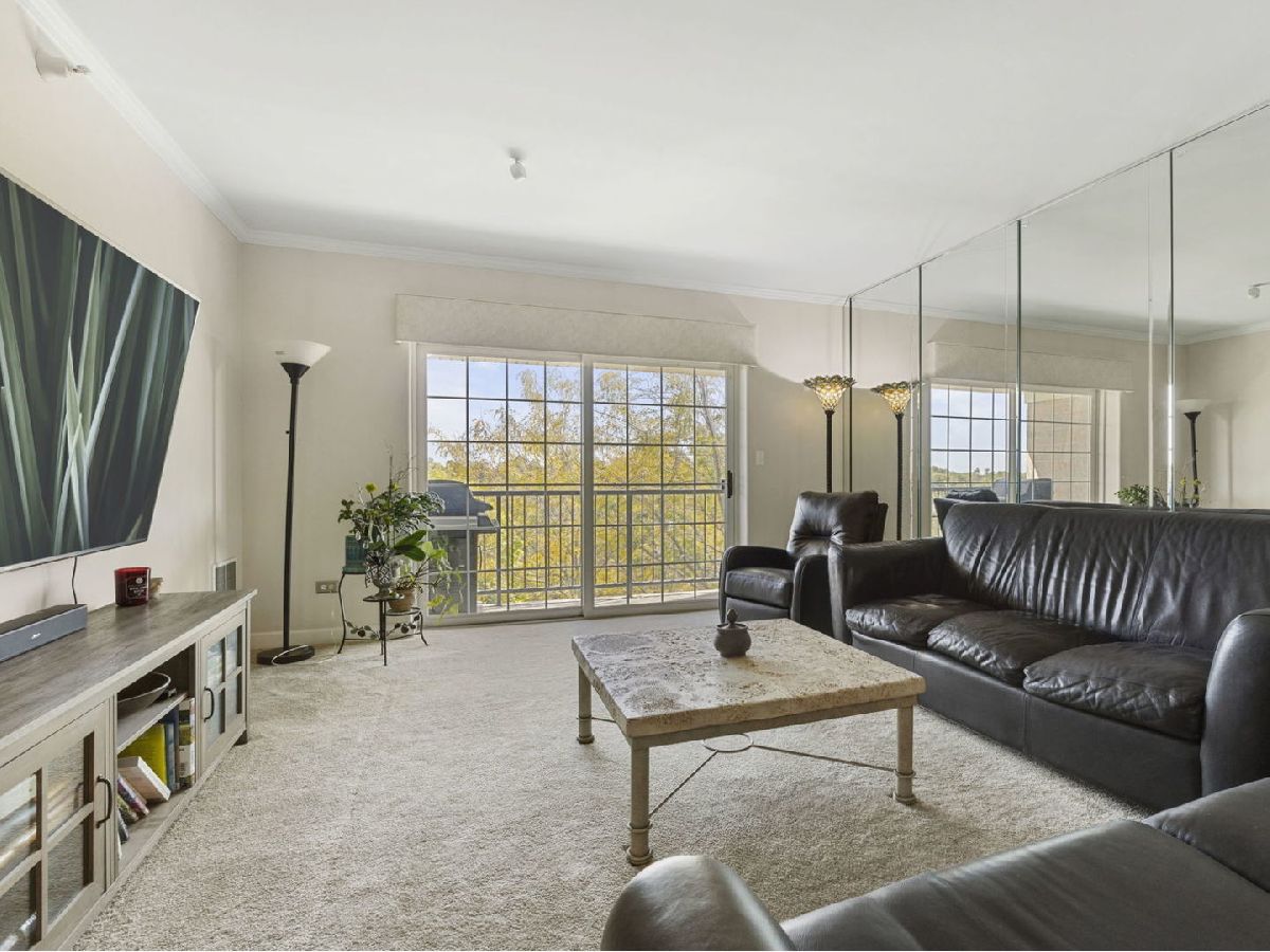 Welcome home to this fabulous Waterfall Glen penthouse condo! This corner end unit overlooks the serene forest preserve and a peaceful pond with fountain view. Coveted quiet southeastern exposure with tons of natural light. Unit boasts the LARGEST floor plan~ 1775 sq ft and feels expansive! Soak in the treetop views with the double balconies off both living and family rooms. All new stainless appliances (2022) and brand new Corian counters, undermount sink, and faucet (2024) installed in the recently painted kitchen (2024). The rarely available family room is a convenient flex space currently serving as eating space with newer vinyl laminate flooring recently installed (2022). Generous sized bedrooms; the primary suite offers spa like bath, walk in closet and the second bedroom is perfect for all your needs. Newest technology mirrors with lighting installed in both bathrooms (2024). Separate laundry room with cabinet storage off the family room. Furnace and A/C installed (2018). New modern lighting fixtures with fan features accent the unit (2021). Heated first floor garage parking plus secure elevator building convenience. Plenty of storage located both in the 5th level storage room and deep storage area by the parking spot #61 in garage. Enjoy the ease of expressways, restaurants, shopping, and all the beauty of the Waterfall Glen forest preserve!