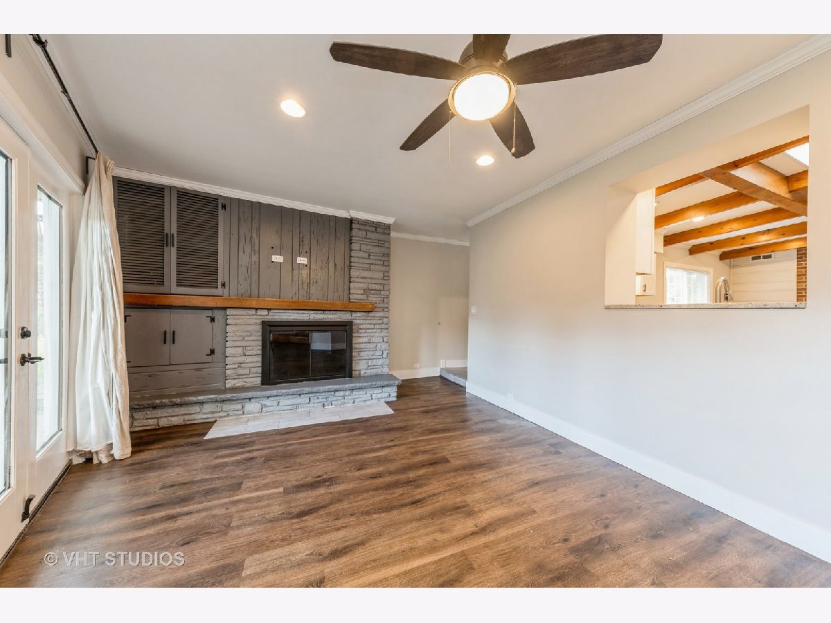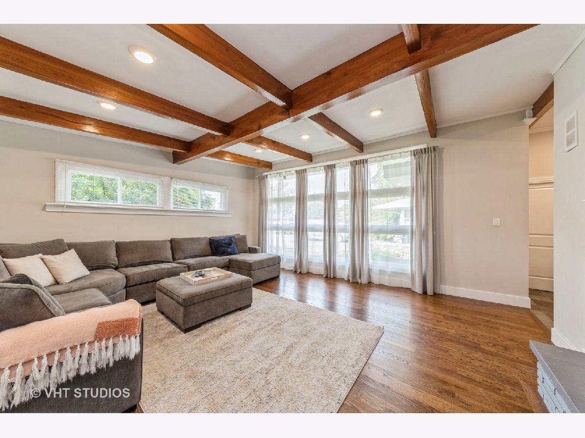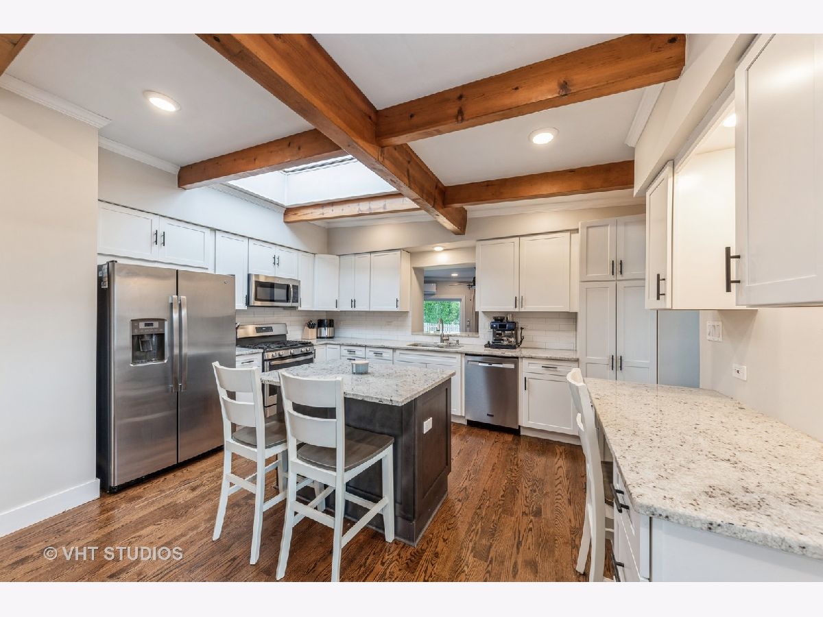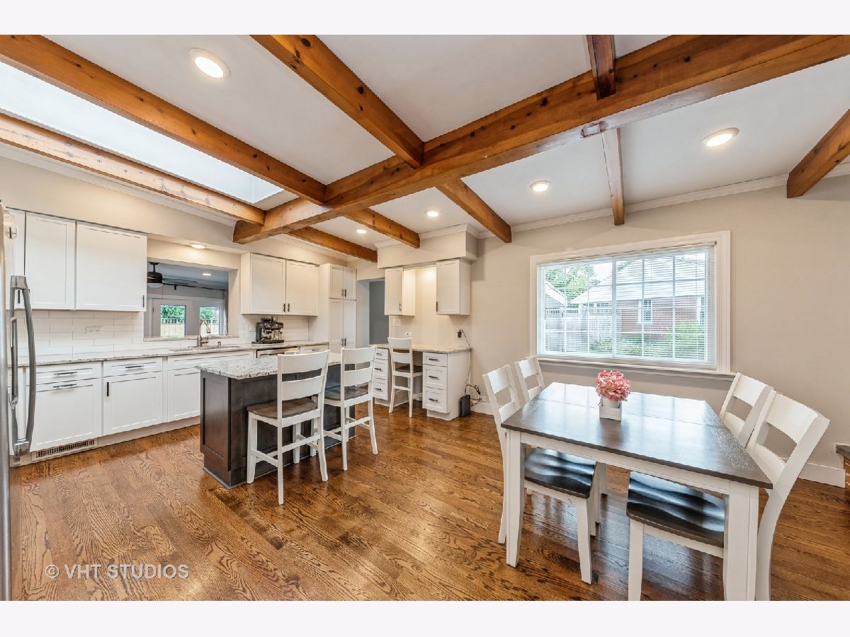 Modernized Mid-Century Modern! Enjoy the ease of one-level living in this updated, move-in ready ranch with NO BASEMENT near Downtown Glenview! The spacious family room features striking beamed ceilings, updated expansive windows, and a cozy wood-burning fireplace. Updated oversized kitchen further showcases beam ceilings and boasts ample white shaker cabinets contrasted with a dark island, granite countertops, a white subway tile backsplash, and stainless steel appliances and opens to the welcoming living room that overlooks the backyard. A sliding reclaimed wood barn door cleverly conceals the laundry room, complete with tile flooring, a mud sink, and front-load washer and dryer. This well planned layout features the bedrooms and bathrooms all on one wing of the home, with all three bedrooms offering hardwood floors, great closet space, and are conveniently located near two full hall bathrooms! One bath has a walk-in shower and double vanity, and the other with a tub/shower combo. Additional features include a spacious and fenced backyard with a huge patio, attached heated+insulated+drywalled two-car garage. Updates and upgrades galore, don't forget to check out the full list when seeing this home. Sought after Glenview Dist. 34 Henking, Hoffman, Springman and Glenbrook South Schools! Ultra-Convenient location near Swenson Park & Johns Park, Glenview Park Golf Club, Downtown Glenview Train Station, Glenview Library, and the re-imagined Downtown Glenview Area with tons of new restaurants just announced that are in the works plus many fabulous already established options. ~Welcome Home~ Just don't wait to see this one, or it will be someone else's home.