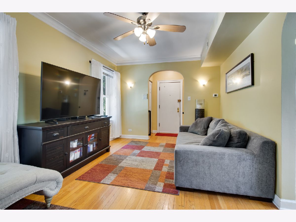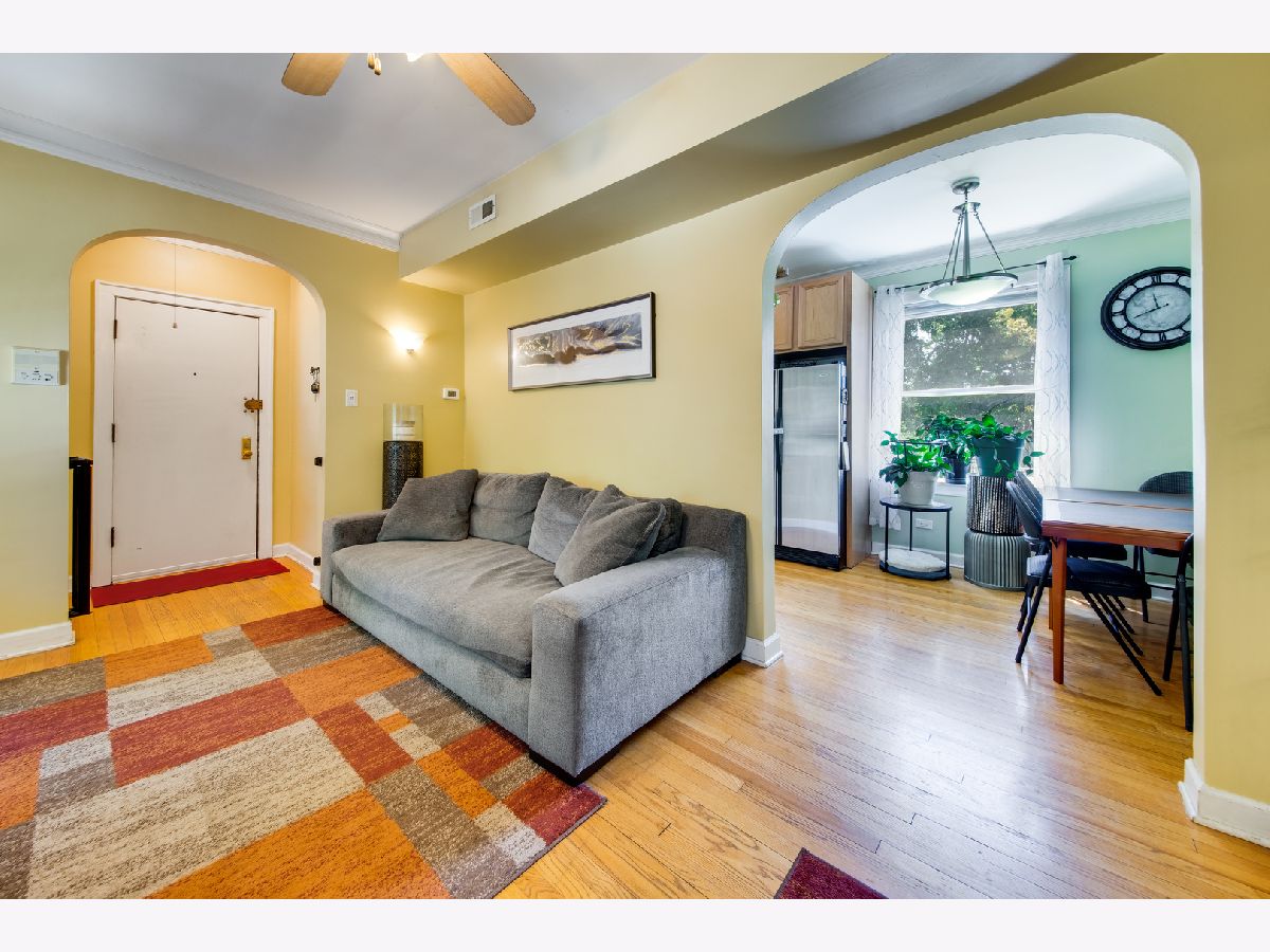 Welcome home to this charming and bright 2 bedroom condo with beautiful tree top views from every window/room in highly coveted Lincoln Square location. You are greeted into a foyer complete with coat closet and an architecturally interesting arched doorway into the sun-filled living room. The eat-in kitchen if equipped with SS appliances, 42" maple cabinets and granite counters. Both bedrooms are spacious and can easily accommodate queen sized beds. The bathroom was thoughtfully renovated with subway tile walls and hexagon tile floors for that timeless charm. This home also features hardwood floors throughout, central air and heat, private laundry, and shared back porch for grilling. Quaint Lincoln square area walking distance to Western/Lawrence L stop, Winnemac Park, and all the shops, restaurants and Lounges Lincoln Square has to offer!