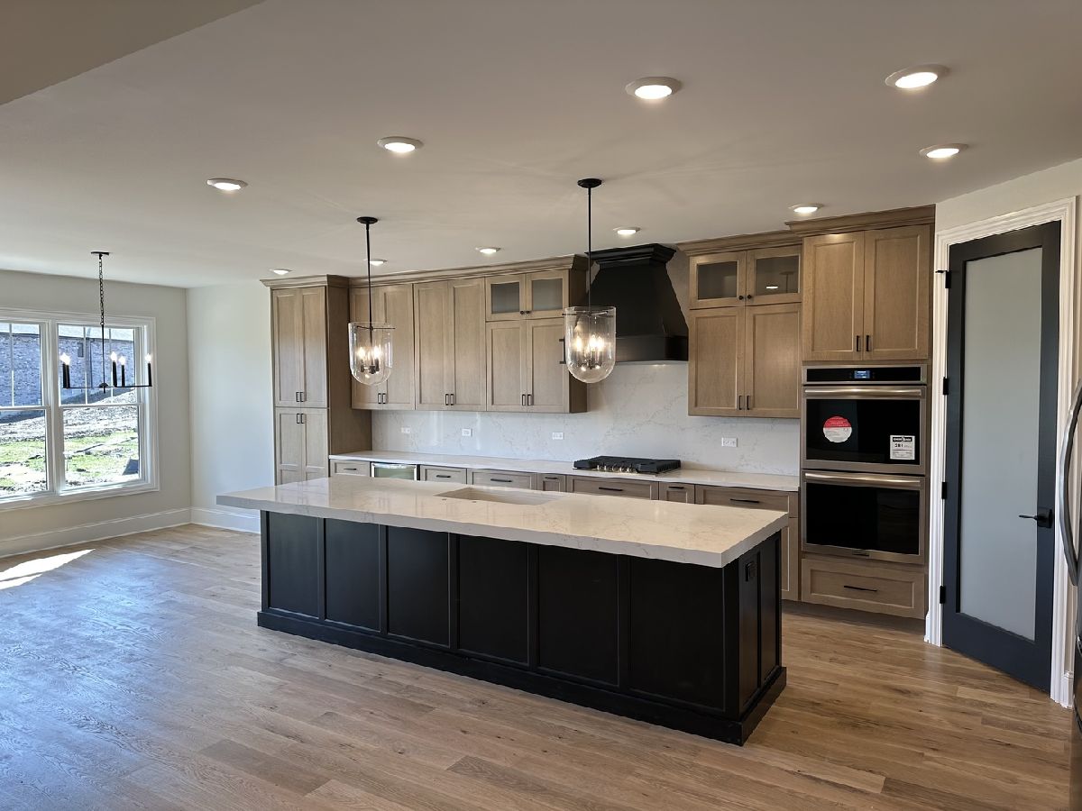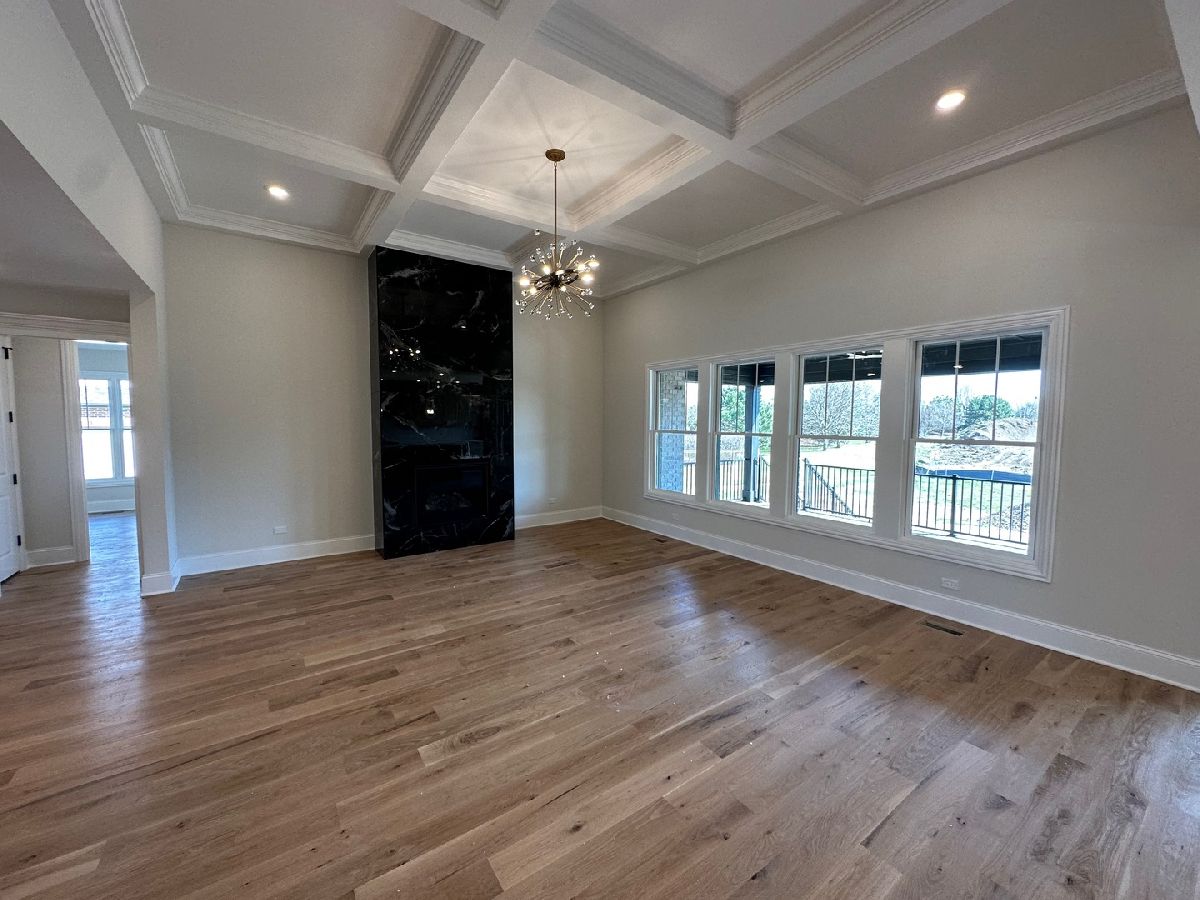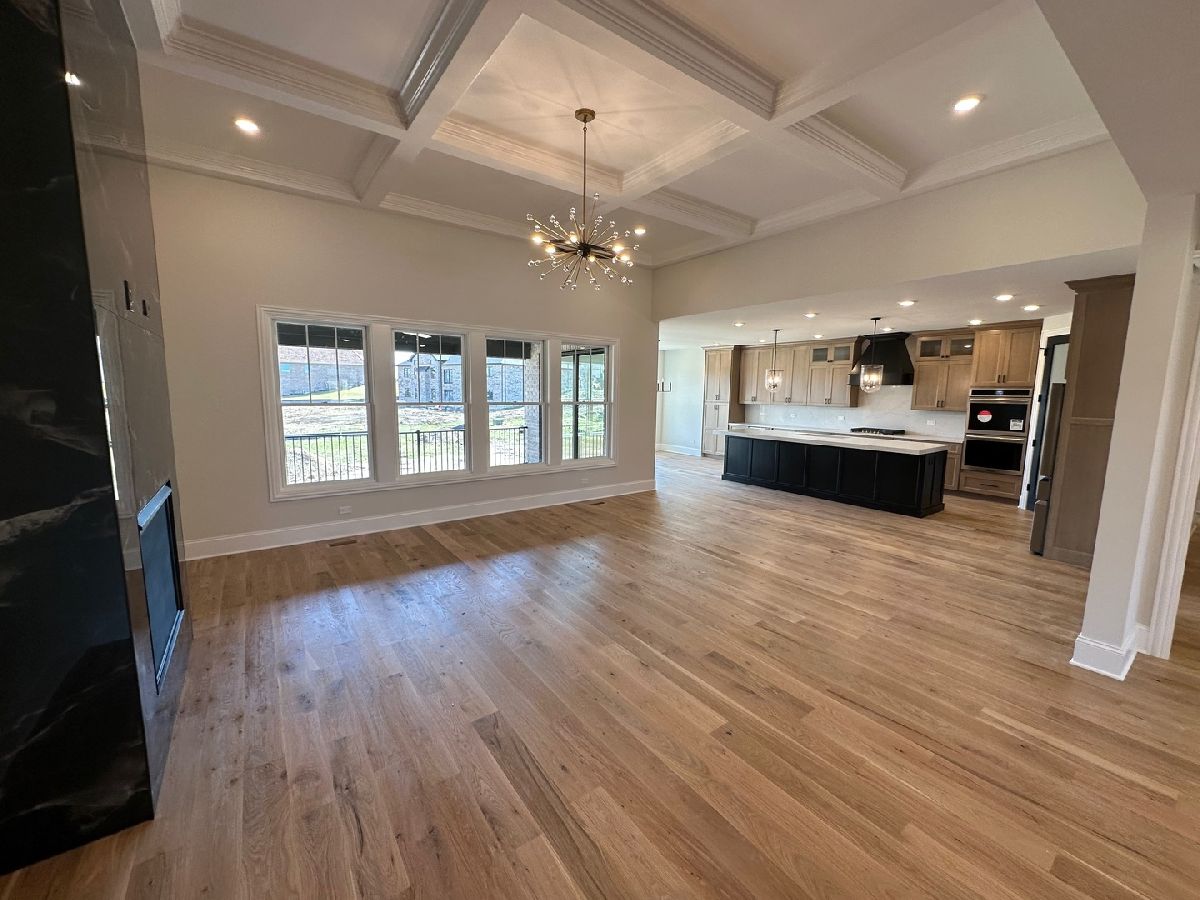 Welcome to your dream ranch home in Frankfort's Five Oaks subdivision. This brand new stunning new construction home offers luxury and comfort. The foyer leads seamlessly into the open concept family room with 14 ft high coffered ceilings, cozy fireplace, and windows overlooking backyard providing plenty of natural sunlight. The heart of the home is the gorgeous kitchen featuring two tone custom cabinetry with floor to ceiling cabinets, sleek quartz countertops and full height backsplash, pendant lighting, double oven and walk in pantry. The oversized island is perfect for entertaining! Sliding glass doors open to the covered deck which is the perfect spot for your outdoor patio set. Retreat to the master suite with spacious layout of ensuite bathroom with dual vanities, soaking tub, separate shower, and walk in closet. Additional highlights include 2 other bedrooms joined by Jack and Jill bathroom. Home office with accent trim wall & open formal dining room. Laundry room/mudroom off the 3 car garage. Entire home has 6 inch white oak hardwood floors throughout. No carpet! Lookout basement has 9 ft ceilings with rough in plumbing for future bath. With high-end finishes, and attention to detail evident at every turn, this home offers the perfect blend of sophistication and functionality. This true custom home is one you don't want to miss out on!