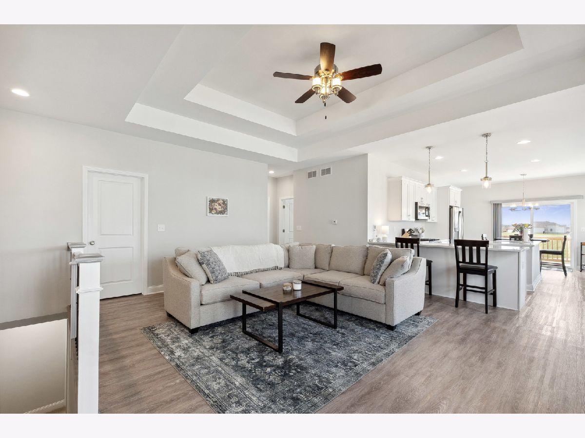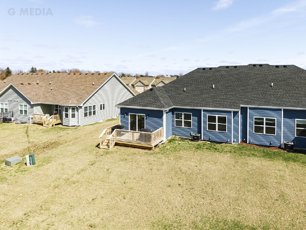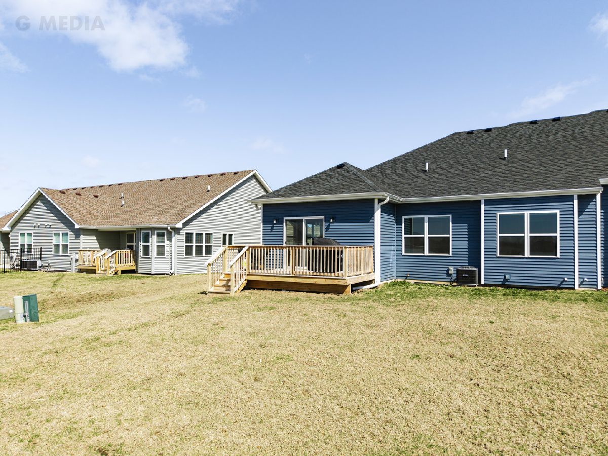 Discover a thoughtfully designed home offering 1,571 square feet of comfortable living space filled with natural light. This inviting residence features two spacious bedrooms, two full bathrooms, and a versatile den-perfect for a home office or flex space. High-end finishes throughout include 9-foot ceilings, oversized baseboard trim, two-panel doors, and durable luxury vinyl plank flooring. The family room's double tray ceiling adds an elegant touch, while the owner's suite is designed for ease with 36-inch doorways, a generous walk-in closet, and a beautifully appointed en-suite bath. The kitchen is both stylish and functional, featuring quartz countertops, dovetail soft-close cabinetry, a pantry closet, an island with a breakfast bar, and sliding doors leading to the deck-ideal for outdoor relaxation. A standout feature is the upgraded wrought iron railing on the stairwell leading to the full basement, which includes rough-in plumbing and 2 egress window-offering endless possibilities for customization. Additional perks include window coverings on all windows and the ability to install a fence in the backyard, providing added privacy and flexibility. Nestled in an established neighborhood with scenic walking and biking paths, this home offers a perfect blend of comfort, convenience, and future potential.