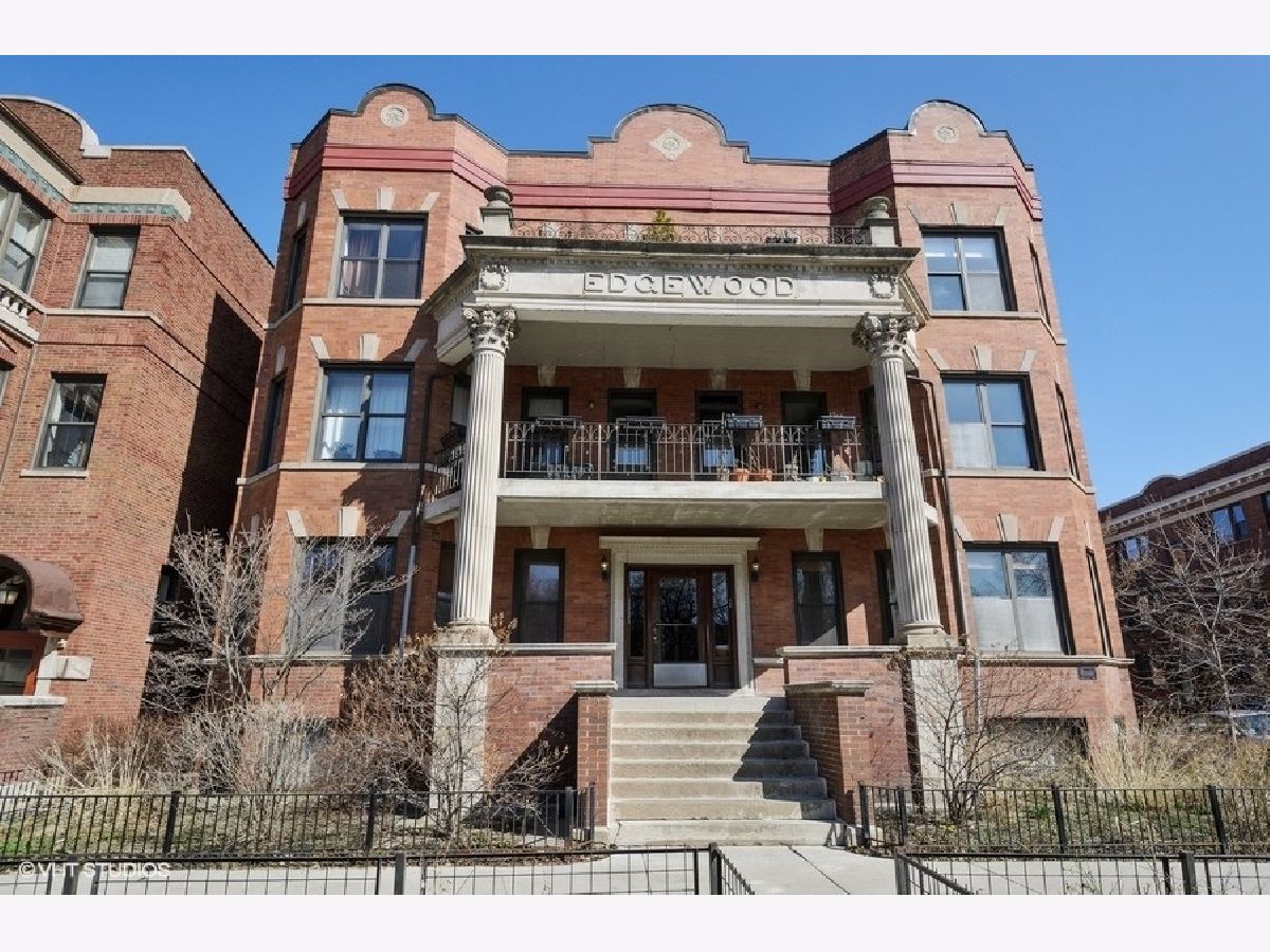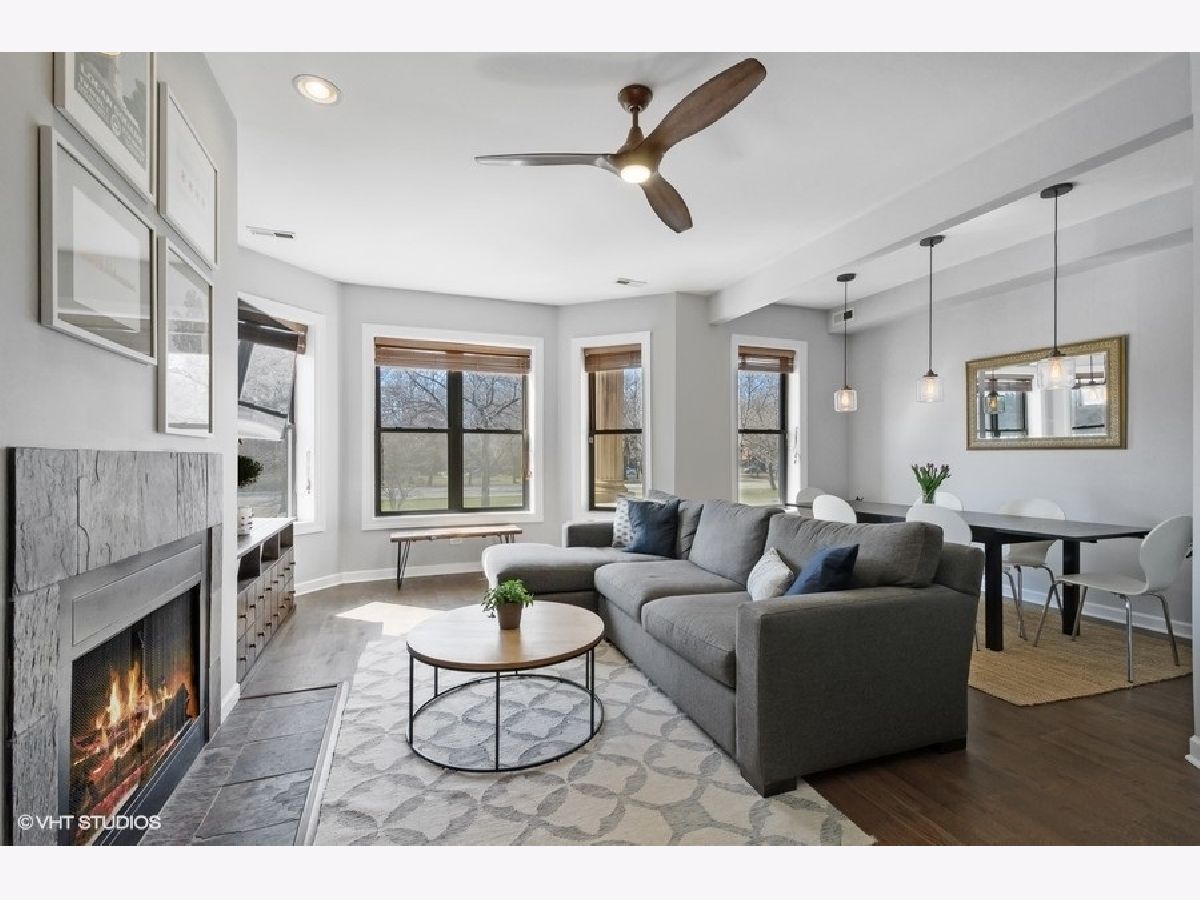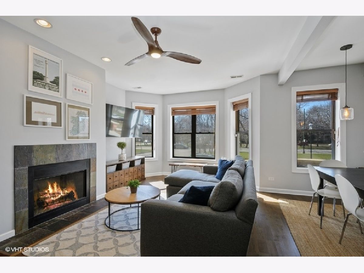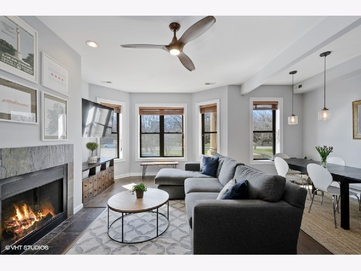 The Edgewood! All the natural light and space in the gorgeous vintage unit with great updating making it move-in ready for life in Logan/ Palmer Square! Have friends pop over to this ideal location off Kedzie Boulevard and serve them dinner at a dining table. Newer hardwood throughout and 2018/2019 freshened kitchen welcome in an open kitchen/ living/ dining vibe. The full length vintage mirror and built in hallway hutch have lasted 100+years and help fill the place with character. Kitchen highlights include double door pantry space with in-unit w/d, window in the kitchen with great cabinetspace, bright subway tiles, center island with bar seating for 4. Sunny dining space could also be a den or home office. Living room centers around a gorgeous gas fireplace with slate surround and built-in shelving. Gigantic primary bedroom suite with dual sinks and separate tub and shower. Both beds get great southern light and have good closet space. Sweet 2nd bed and full 2nd bath round out this amazing space. 2 XXL storage units in basement. Back metal shared deck space for grilling, sunny front porch is a great place to gather, people watch or enjoy the parkway flowers and greenspace. Quiet dead end street makes for easy street parking. Amazing walkability: park, farmers market, blue line, all the Logan Square greats!