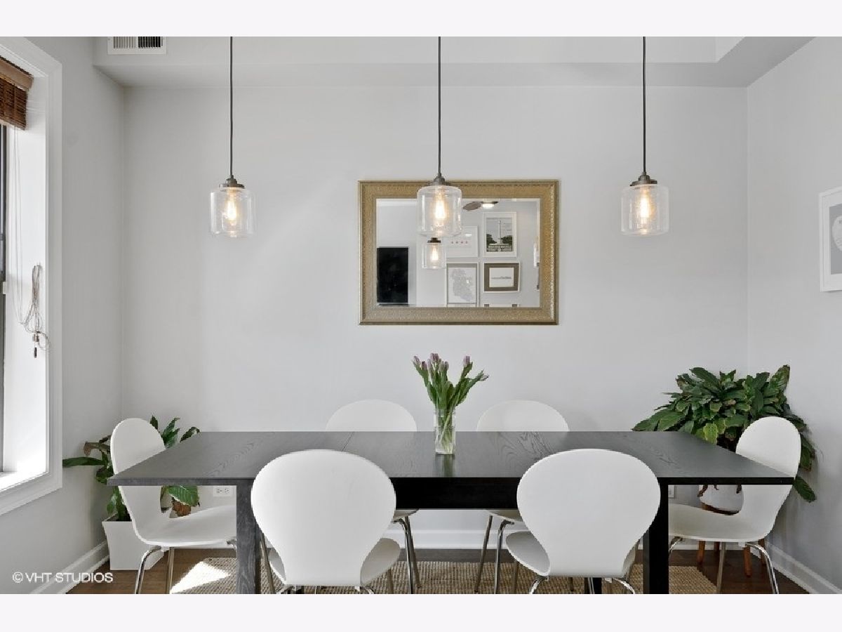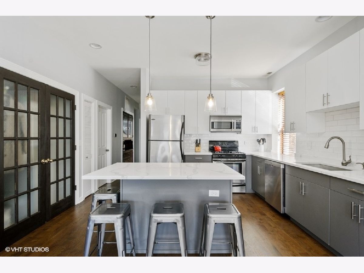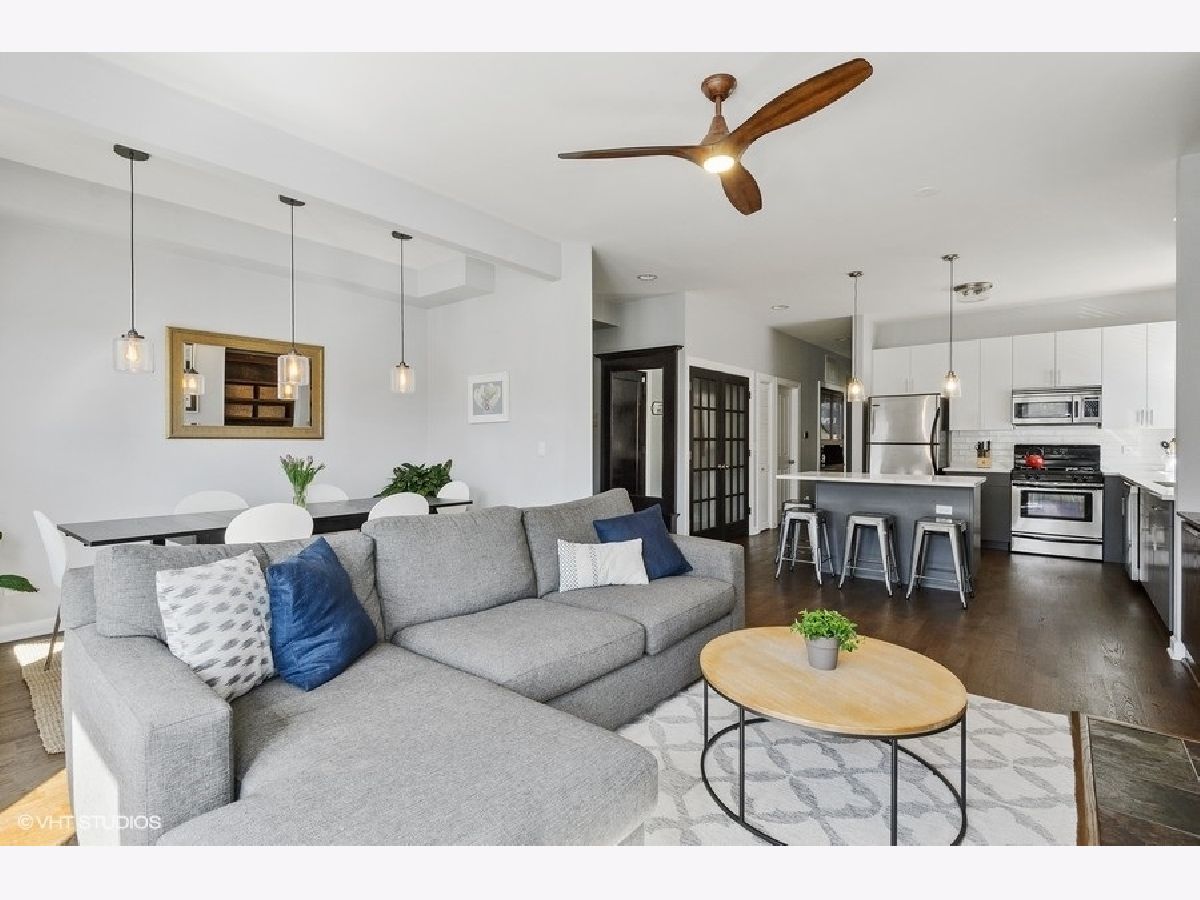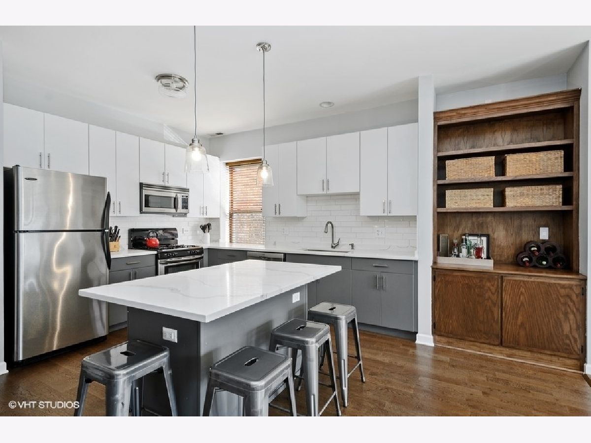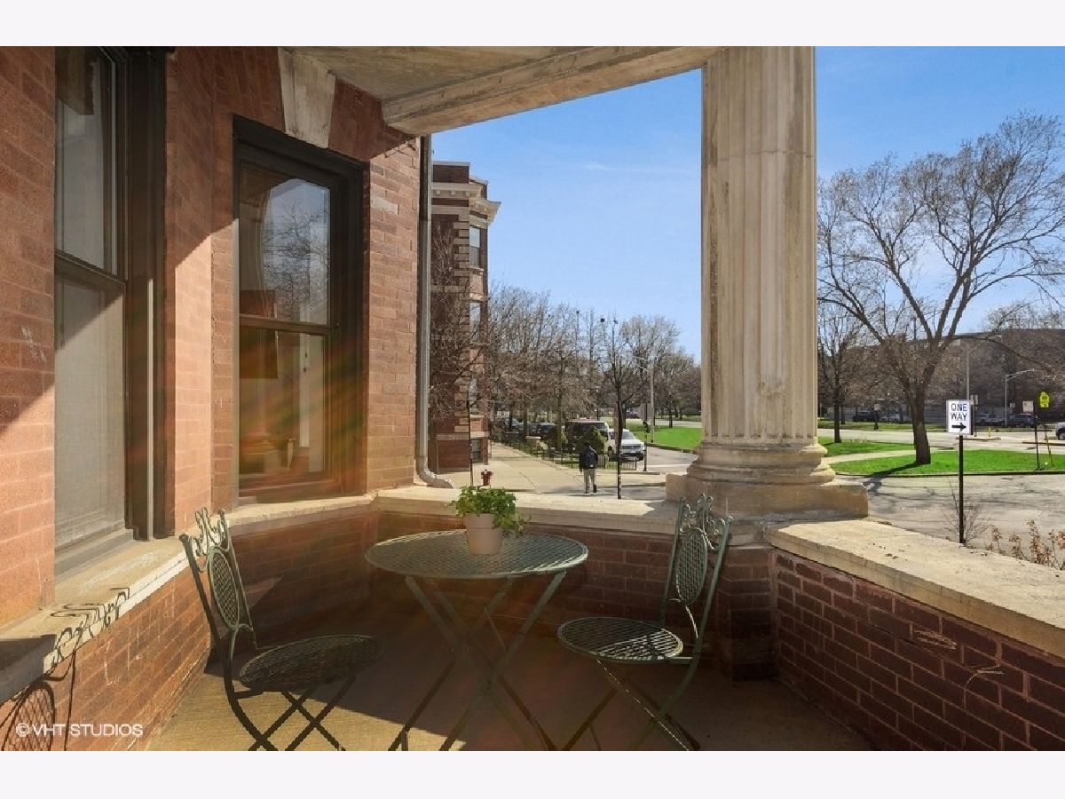 The Edgewood! All the natural light and space in the gorgeous vintage unit with great updating making it move-in ready for life in Logan/ Palmer Square! Have friends pop over to this ideal location off Kedzie Boulevard and serve them dinner at a dining table. Newer hardwood throughout and 2018/2019 freshened kitchen welcome in an open kitchen/ living/ dining vibe. The full length vintage mirror and built in hallway hutch have lasted 100+years and help fill the place with character. Kitchen highlights include double door pantry space with in-unit w/d, window in the kitchen with great cabinetspace, bright subway tiles, center island with bar seating for 4. Sunny dining space could also be a den or home office. Living room centers around a gorgeous gas fireplace with slate surround and built-in shelving. Gigantic primary bedroom suite with dual sinks and separate tub and shower. Both beds get great southern light and have good closet space. Sweet 2nd bed and full 2nd bath round out this amazing space. 2 XXL storage units in basement. Back metal shared deck space for grilling, sunny front porch is a great place to gather, people watch or enjoy the parkway flowers and greenspace. Quiet dead end street makes for easy street parking. Amazing walkability: park, farmers market, blue line, all the Logan Square greats!