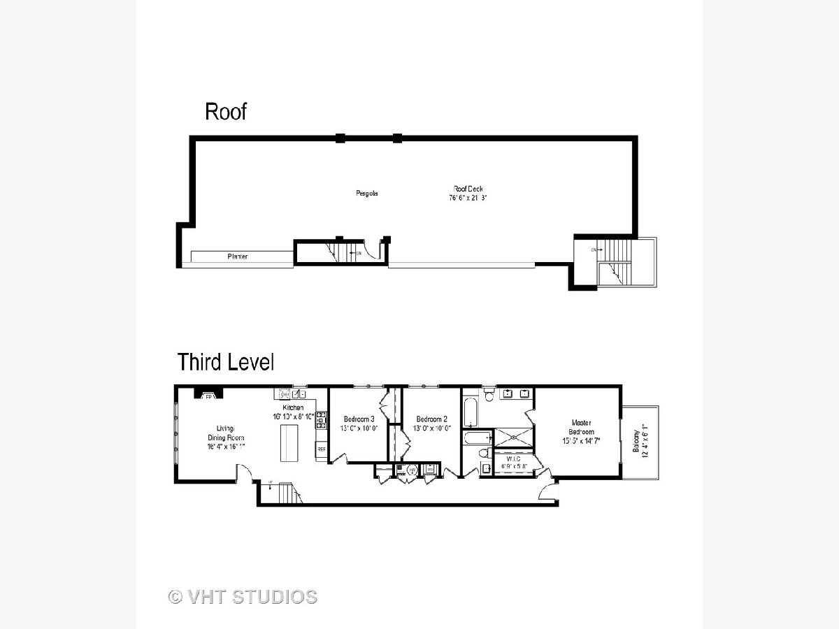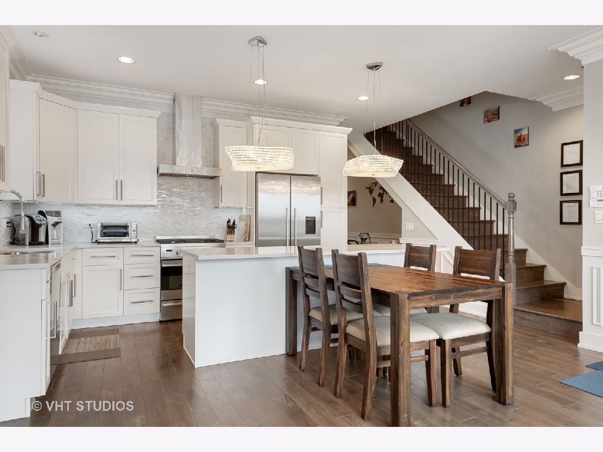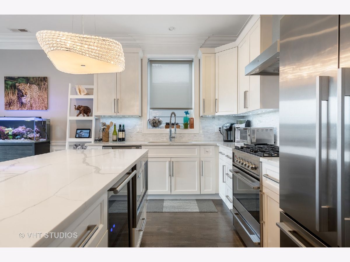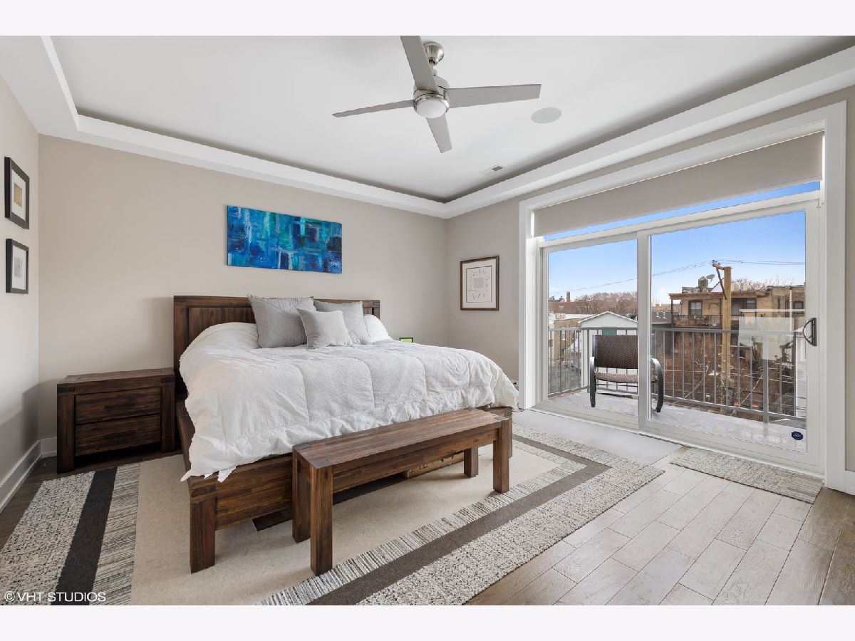 Spectacular 3 bedroom/2 bathroom PENTHOUSE with PRIVATE ROOFTOP DECK and GARAGE PARKING in the heart of Roscoe Village and Level 1+ Audubon District. This space is a perfect combination of sleek style and well-planned functionality. Rich hardwood floors and custom millwork, which are continued throughout the property, welcome you to the spacious open concept living/dining room complete with stacked stone fireplace, floor-to-ceiling windows, and custom window treatments. The space flows seamlessly into the pristine white kitchen with top-of-the-line Fisher Paykel stainless steel appliances, kitchen island, mosaic backsplash, and quartz counters. The master bedroom features dramatic tray ceilings, a private balcony. A luxurious master bathroom with heated floors, dual vanities with Grohe fixtures, whirlpool tub and separate rain shower with body spray, and a custom California walk-in closet complete this relaxing space. Two additional large bedrooms, and a full bath with soaking tub round out the main level. A stunning grand staircase leads upstairs to the private rooftop deck which spans the entire footprint of the unit and features a pergola, gas fireplace, grill, built-in planters, enough space for true outdoor living, and stunning city views. Additional features include: private storage space, wine cooler, custom kitchen cabinetry, WiFi thermostat, Sonance surround sound speakers, in-unit laundry. Fantastic Roscoe Village location with close proximity to schools, multiple bus routes, Hamlin Park, Mariano's, Jewel-Osco, Kennedy Expressway and all of the wonderful shops and restaurants Roscoe Village has to offer. Pet-friendly!