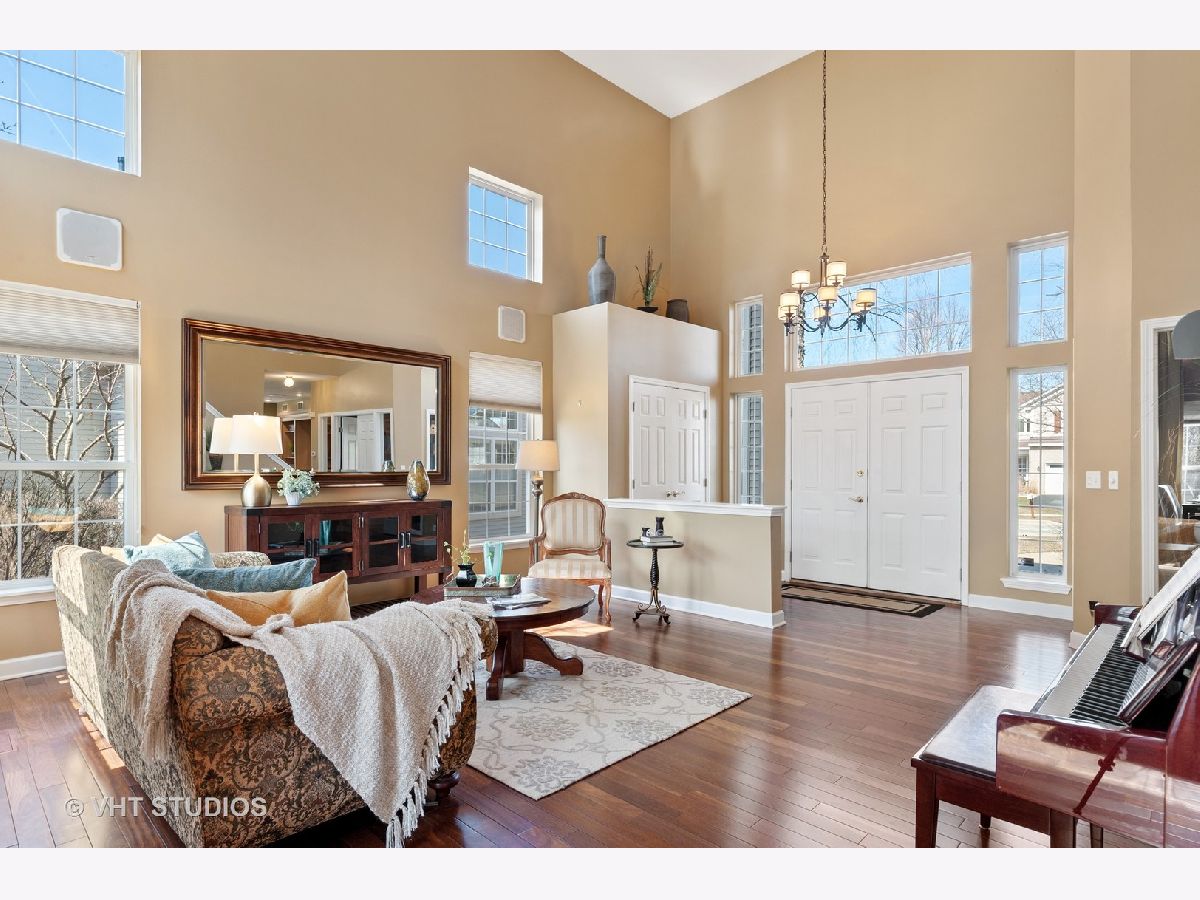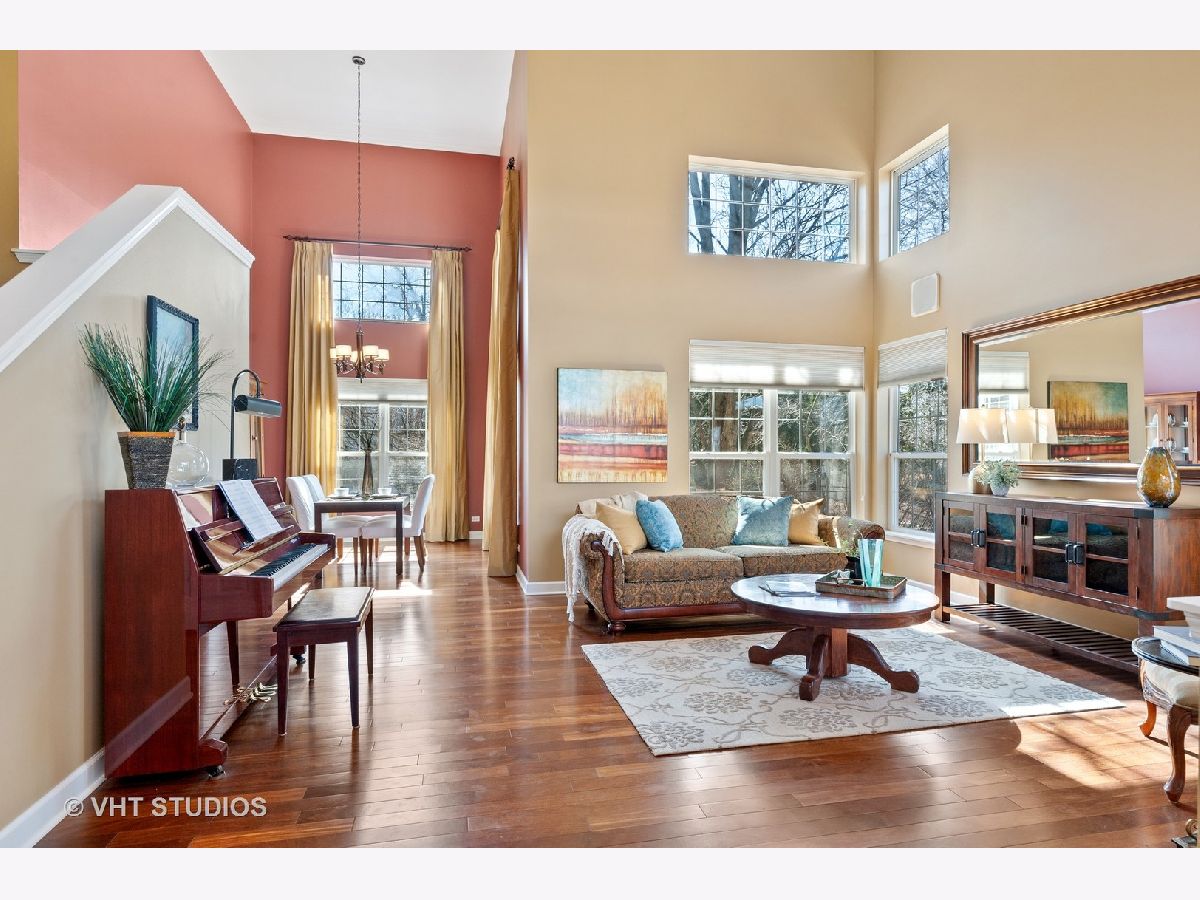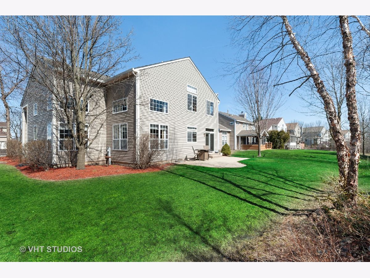 Stunning TWO STORY foyer, living room and dining room engulfed in natural light through UV PROTECTED WINDOWS. You'll be equally as impressed with the REMOLDED KITCHEN with maple wood cabinets, granite counters, SS appliances and the most beautiful ceramic basket-weave back-splash. Brazilian Oak HARDWOOD floors and 9' CEILINGS throughout the main level enhance the family room/great room that features CUSTOM BUILT-IN CABINETS and gas fireplace. Work from home or enjoy some quite time in the private 1st FLOOR DEN/OFFICE, with custom built-in wall of shelving, that can be accessed from foyer via french doors w/windows and sidelight. 2nd story has 4 generous bedrooms, connected by an extra wide hallway, including VAULTED MASTER BEDROOM SUITE with double sinks, separate shower and 2 WALK-IN CLOSETS. FULL FINISHED BASEMENT with 8' ceilings creates additional living space which could have many potential uses with a lower level family room, media/game room (with some more custom built-in cabinets), fitness room, workshop and yet plenty of room for storage. PRIVATE BACKYARD with paver patio and natural fence of MATURE TREES. LONG MEADOW PARK is located within this community and consists of a playground, ball fields, walking paths, pond and a gazebo covered picnic area available for rent. Located within miles of shopping (Super Target, Home Depot, TJMaxx Home Goods & Starbucks), schools, library, 3 Metra stops and a PHENOMENAL Park District WATER PARK/Spray Park with fitness/rec center w/indoor pool, ball fields, sled hill and the new Dunbar Rec Center with dance studios and cooking school. HIGHLY RANKED FREMONT Elementary and Mundelein High School districts with reasonable taxes. Check out the high school's STEM addition in the included community pictures. Newer Roof (2018), siding (2017) and slider (2018) to patio. A Great Buy in a Great Community!!