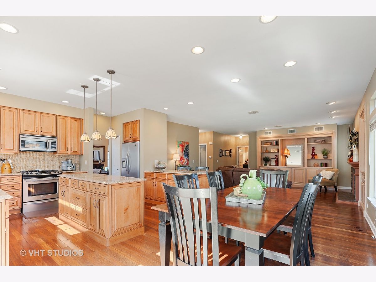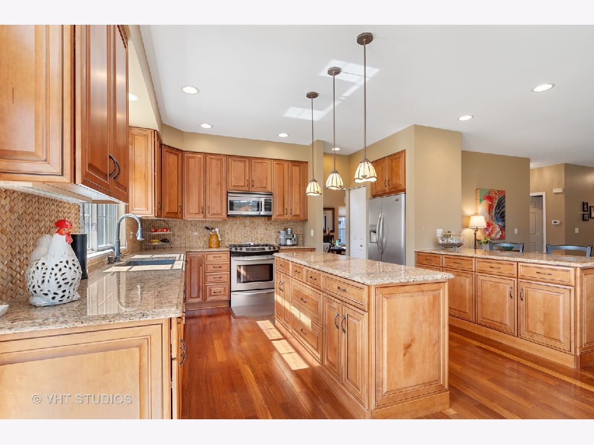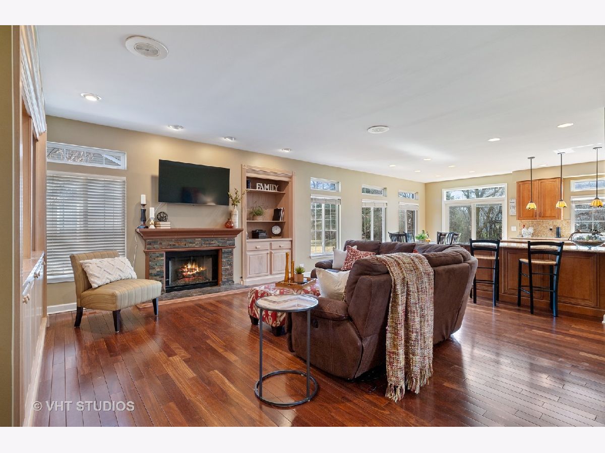 Stunning TWO STORY foyer, living room and dining room engulfed in natural light through UV PROTECTED WINDOWS. You'll be equally as impressed with the REMOLDED KITCHEN with maple wood cabinets, granite counters, SS appliances and the most beautiful ceramic basket-weave back-splash. Brazilian Oak HARDWOOD floors and 9' CEILINGS throughout the main level enhance the family room/great room that features CUSTOM BUILT-IN CABINETS and gas fireplace. Work from home or enjoy some quite time in the private 1st FLOOR DEN/OFFICE, with custom built-in wall of shelving, that can be accessed from foyer via french doors w/windows and sidelight. 2nd story has 4 generous bedrooms, connected by an extra wide hallway, including VAULTED MASTER BEDROOM SUITE with double sinks, separate shower and 2 WALK-IN CLOSETS. FULL FINISHED BASEMENT with 8' ceilings creates additional living space which could have many potential uses with a lower level family room, media/game room (with some more custom built-in cabinets), fitness room, workshop and yet plenty of room for storage. PRIVATE BACKYARD with paver patio and natural fence of MATURE TREES. LONG MEADOW PARK is located within this community and consists of a playground, ball fields, walking paths, pond and a gazebo covered picnic area available for rent. Located within miles of shopping (Super Target, Home Depot, TJMaxx Home Goods & Starbucks), schools, library, 3 Metra stops and a PHENOMENAL Park District WATER PARK/Spray Park with fitness/rec center w/indoor pool, ball fields, sled hill and the new Dunbar Rec Center with dance studios and cooking school. HIGHLY RANKED FREMONT Elementary and Mundelein High School districts with reasonable taxes. Check out the high school's STEM addition in the included community pictures. Newer Roof (2018), siding (2017) and slider (2018) to patio. A Great Buy in a Great Community!!
