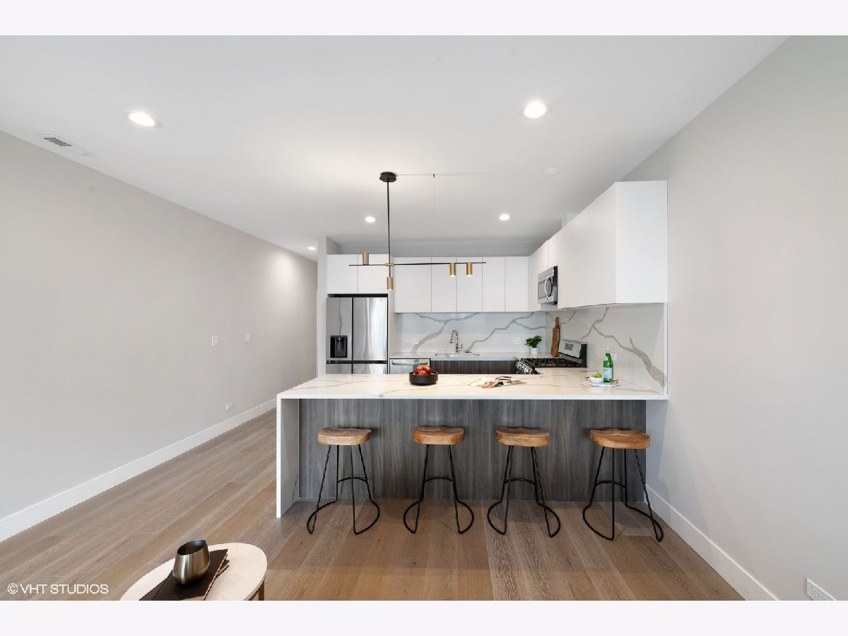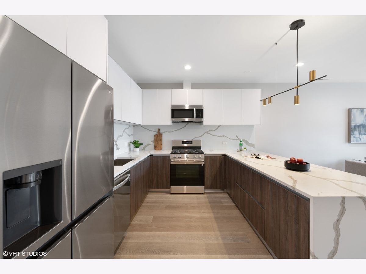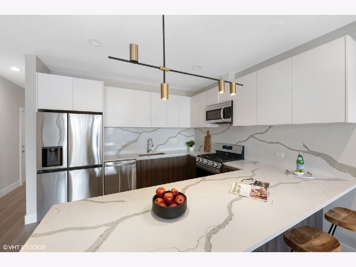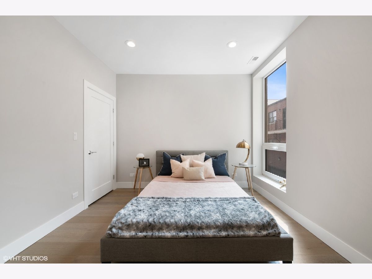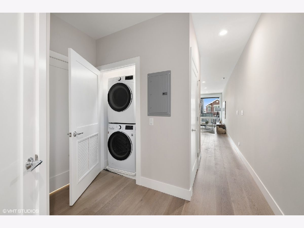 READY FOR OCCUPANCY! Fortress Home introducing 31- Unit Boutique ELEVATOR building offering an urban chic living with thoughtfully designed open concept floorplan. The sleek gourmet kitchen provides custom two-tone cabinetry, quartz counters, stainless steel appliances, and a massive peninsula flowing along with the wide plank flooring into the open, natural light filled living area with floor-to-ceiling European windows and a covered private balcony (13x5) off the living room. The spacious primary suite boasts a large window with a walk-in closet and the spa-inspired en suite bathroom with a walk-in shower, designer tile and custom single floating vanity. The 2nd bedroom features a large window and a closet. Enjoy a beautiful bathroom with a soaking tub/ shower and custom floating single vanity. The unit comes with an in-unit washer/ dryer and assigned 150 SF rooftop deck with panoramic city view. Attached heated garage space is included in the price. Pictures are taken of the model Unit #503 and #204. Conveniently located near West Loop, Little Italy, United Center and Medical District. Easy access to Eisenhower Expressway / 290, Blue line El Train stop, Western Ave Metra Stop for MD-N, MD-W, & NCS, and CTA buses.