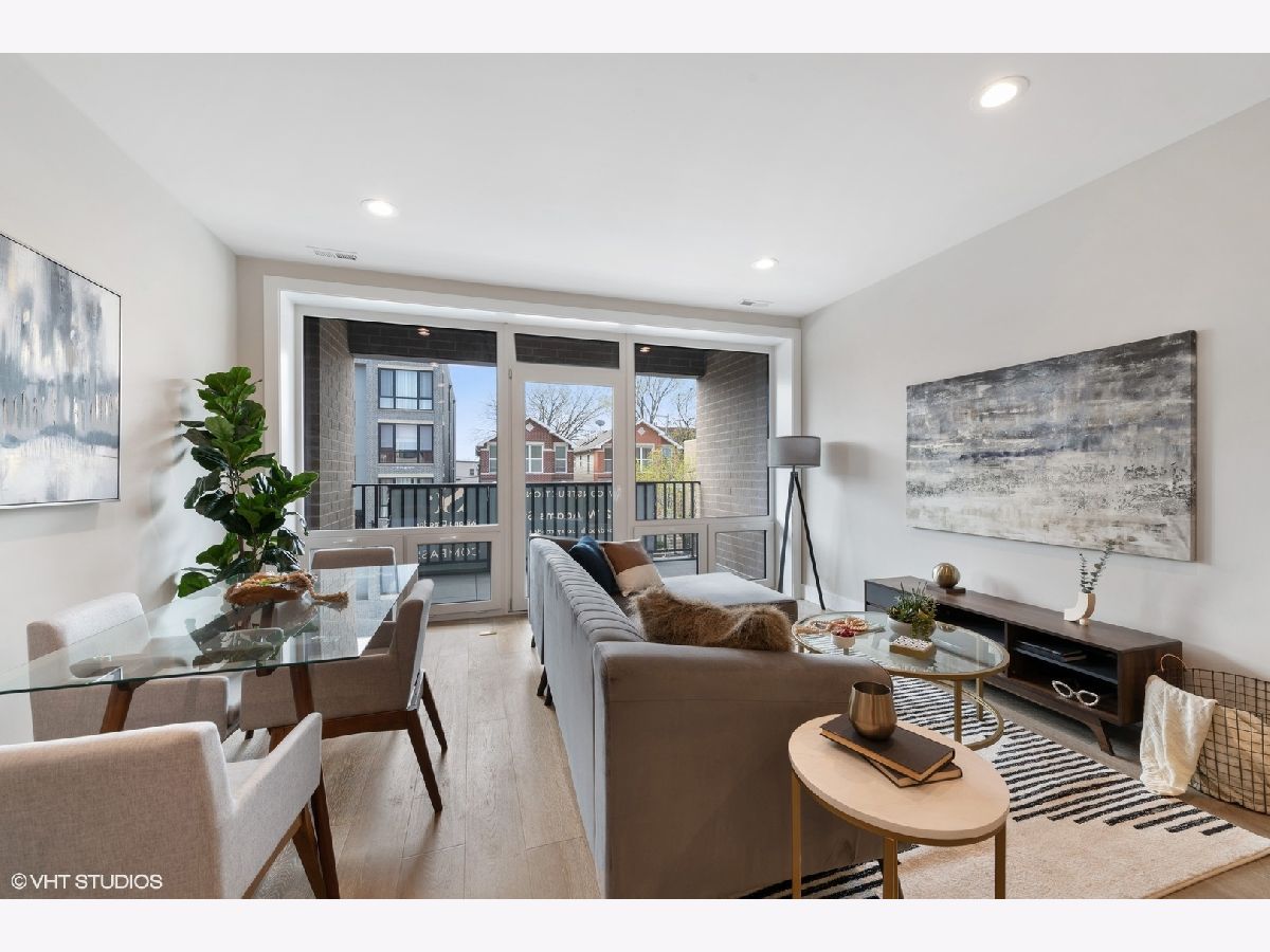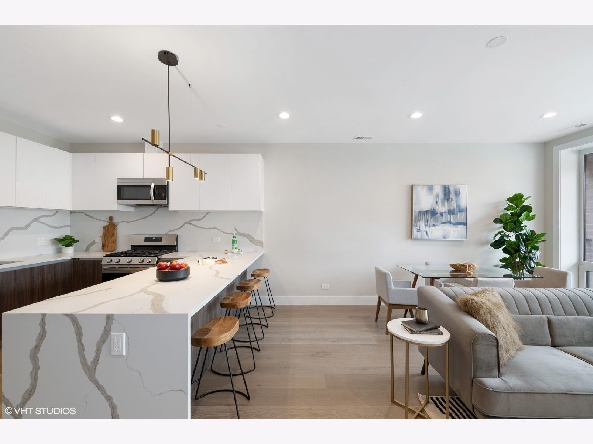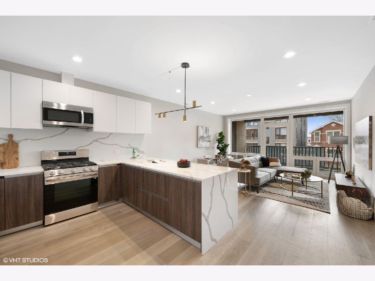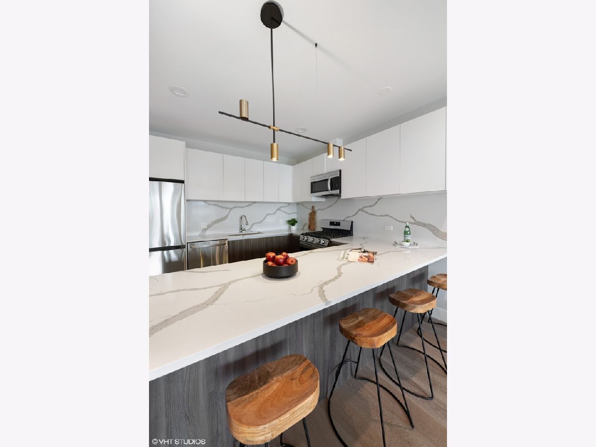 READY FOR OCCUPANCY! Fortress Home introducing 31- Unit Boutique ELEVATOR building offering an urban chic living with thoughtfully designed open concept floorplan. The sleek gourmet kitchen provides custom two-tone cabinetry, quartz counters, stainless steel appliances, and a massive peninsula flowing along with the wide plank flooring into the open, natural light filled living area with floor-to-ceiling European windows and a covered private balcony (13x5) off the living room. The spacious primary suite boasts a large window with a walk-in closet and the spa-inspired en suite bathroom with a walk-in shower, designer tile and custom single floating vanity. The 2nd bedroom features a large window and a closet. Enjoy a beautiful bathroom with a soaking tub/ shower and custom floating single vanity. The unit comes with an in-unit washer/ dryer and assigned 150 SF rooftop deck with panoramic city view. Attached heated garage space is included in the price. Pictures are taken of the model Unit #503 and #204. Conveniently located near West Loop, Little Italy, United Center and Medical District. Easy access to Eisenhower Expressway / 290, Blue line El Train stop, Western Ave Metra Stop for MD-N, MD-W, & NCS, and CTA buses.