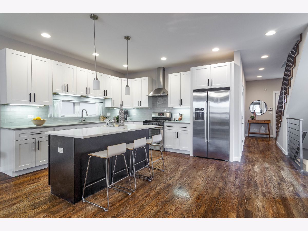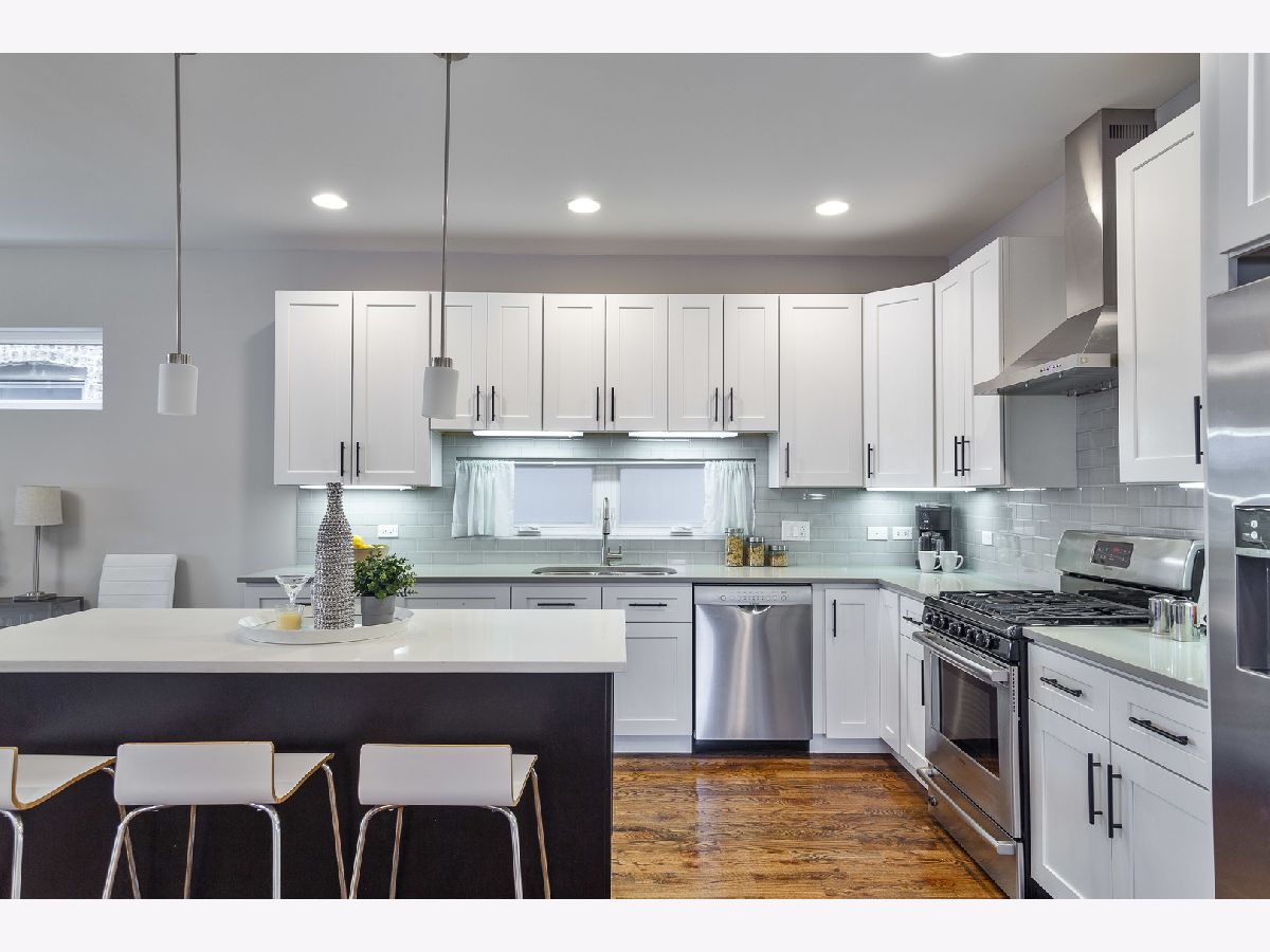 Bright and spacious 4 bed, 3.1 bath single family home on an extra-wide 30' lot in Logan Square! Contemporary facade, fenced in corner lot, and fresh landscaping. Expansive, open concept main level floor plan with hardwood flooring, great natural light, and on trend kitchen with white shaker cabinetry, quartz countertops, island with bar seating, and stainless Bosch appliances. Main level bedroom and full bath. Upper level primary suite with private bath featuring dual sinks and frameless glass shower + WIC with custom organizers. Two additional bedrooms, full bath, and laundry with washer/dryer complete the upper level. Finished lower level features new carpeting, nice ceiling heights, huge recreation room, half bath, utilities, and second laundry with washer/dryer. Fresh paint throughout! Enclosed backyard with large paver patio and detached two-car garage. Prime Logan Square location with easy access to all your favorite restaurants, shopping, night life, public transportation, and more. Just over 5 mins to the Healy metra!