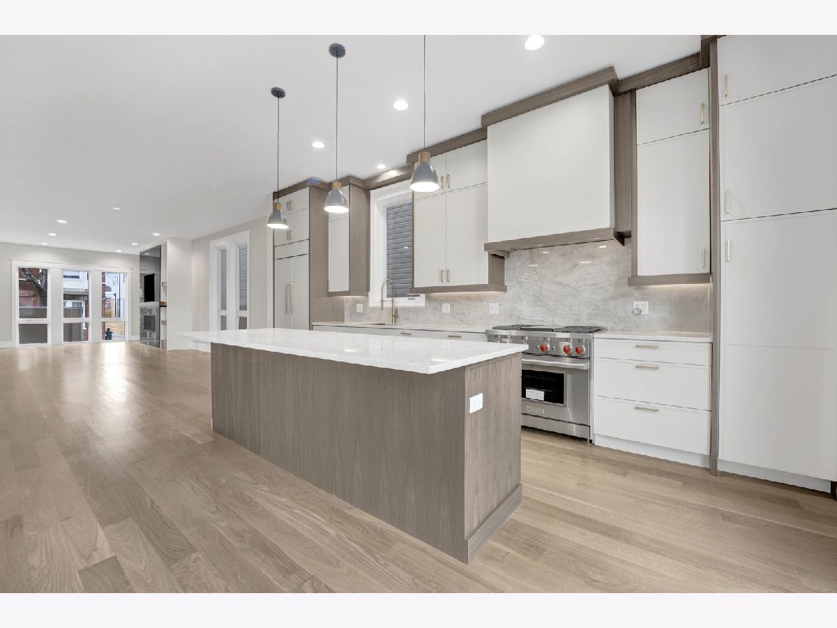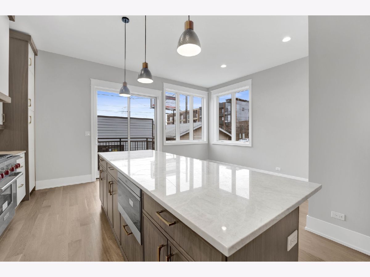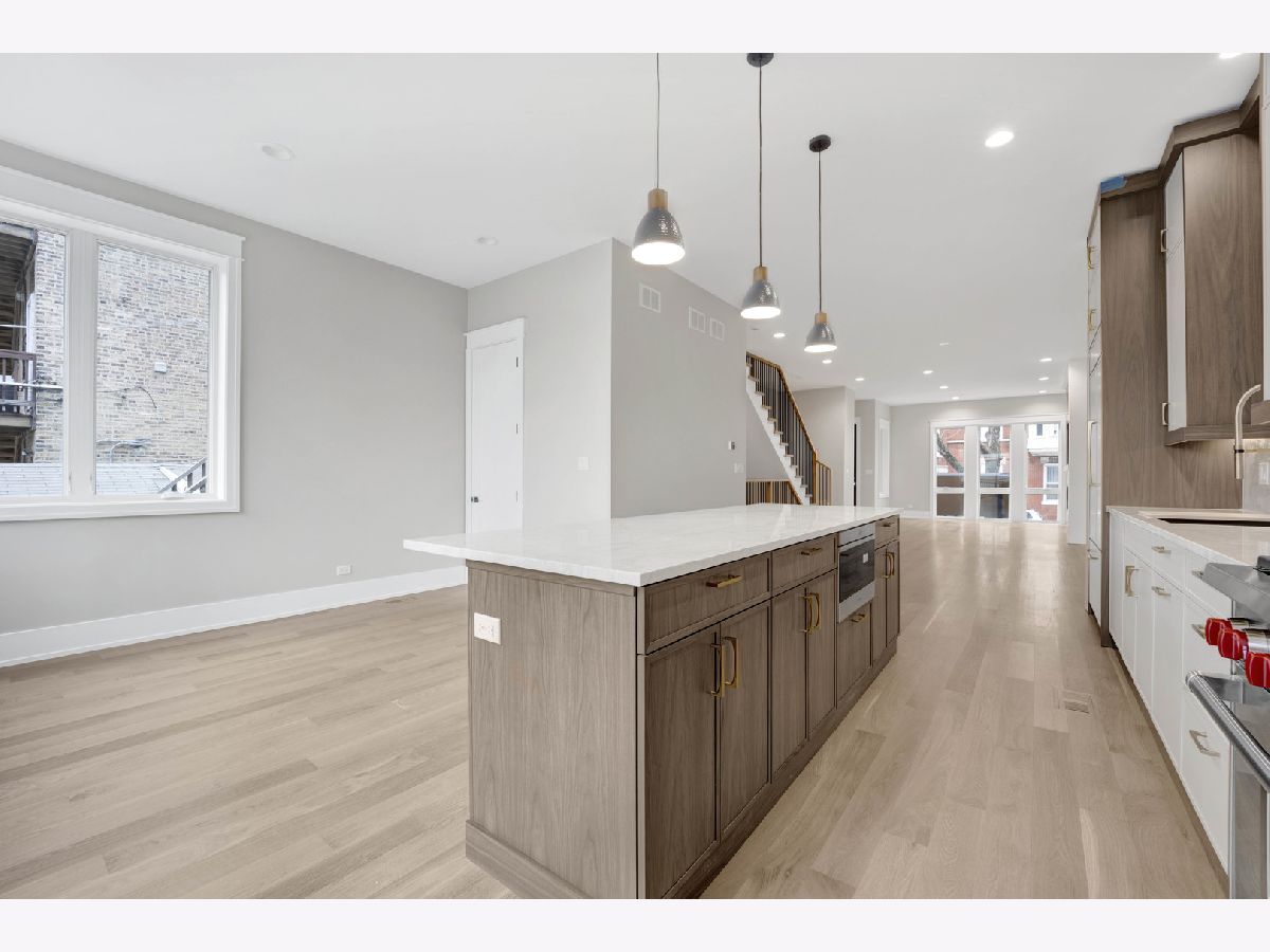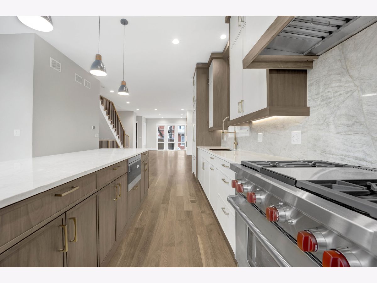 New Construction Modern Transitional Home! Open floor plan with high-end fixtures from Studio 41 and premium finishes. Very bright with oversized windows. The open-concept main level is perfect for entertaining. The open living/dining area features a direct vent gas fireplace with a floor-to-ceiling surround. The chef-quality kitchen includes top-of-the-line Sub-Zero and Wolf appliances, integrated custom cabinetry with Taj Mahal quartz countertops, and a large island with bar seating, plus an eat-in kitchen. The upper-level primary suite has a walk-in closet and an ensuite bath featuring a freestanding tub, frameless glass shower, dual sinks, and heated flooring. Two additional bedrooms, a full bath with a tub and dual sinks, and a separate laundry room with a washer, dryer, and sink complete this level.The third floor includes a wet bar and a half bath, opening to a roof deck with city views. The finished lower level offers a spacious recreation room complete with a wet bar, a fourth bedroom with large closets, a full bath with an oversized shower, and a utility closet. The rear balcony includes a staircase leading down to a stone patio and garage. Located in prime West Town, this home is close to restaurants, shopping, entertainment, and Smith Park! Enjoy easy access to public transportation and nearby neighborhoods.