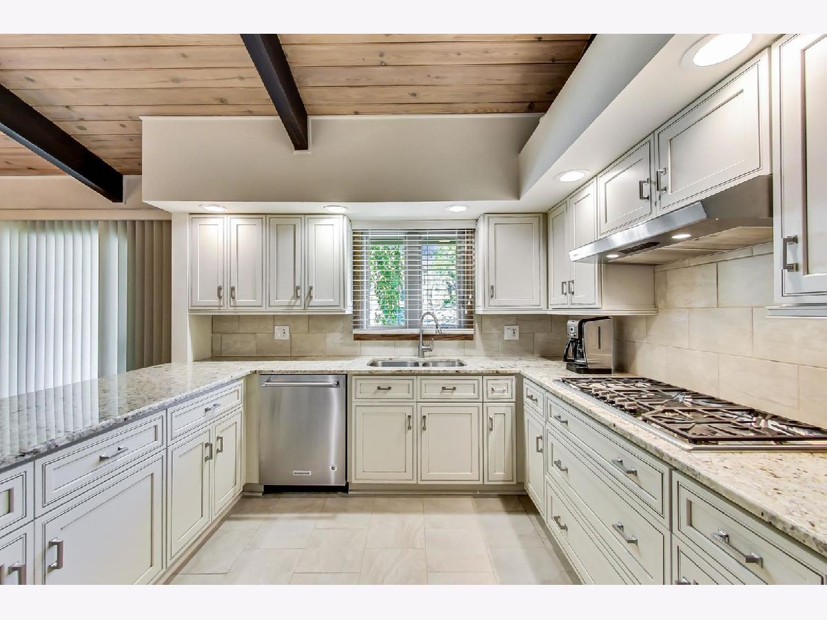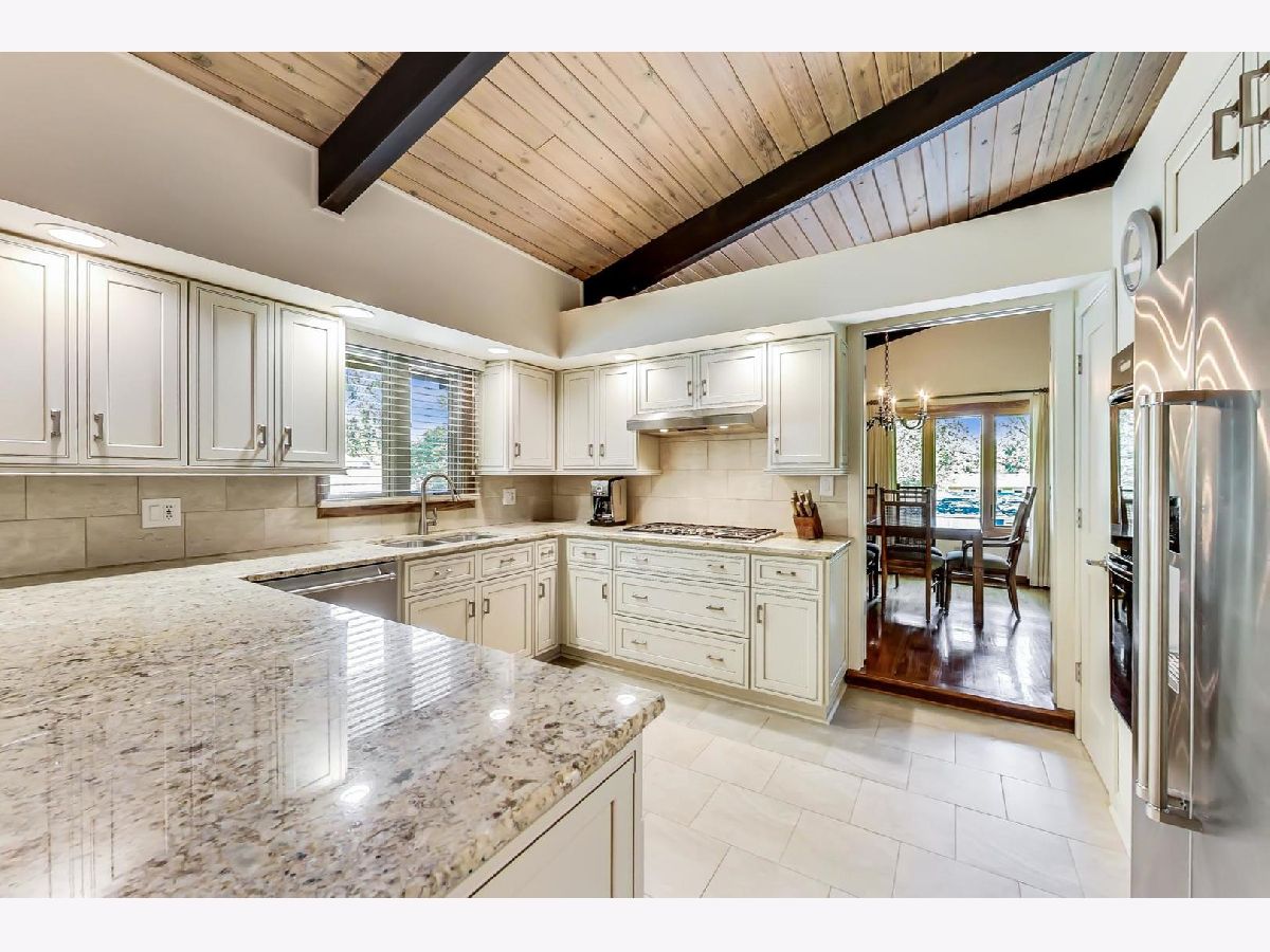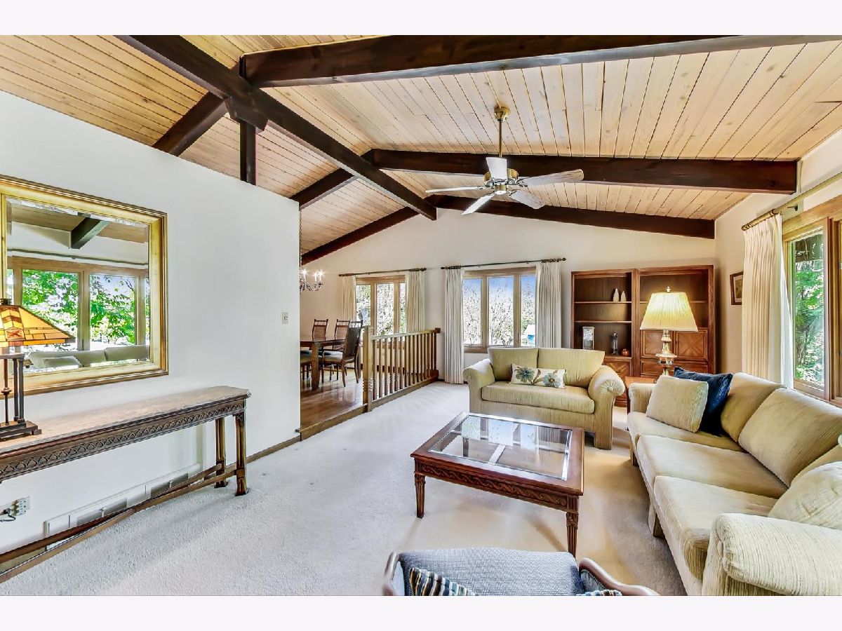 Tired of the boring choices or lack of choice? Then get to this Really unique hilltop Step Ranch "built/raised up" for walk-out family room on a quarter acre of towering oak trees lot in Brentwood Estates. Located just south of Deer Park (just south of Lake Cook Road - and north of Deer Park Forest Preserve wetlands. Great views from every window because of how the home is positioned. This 4br (primary suite & 2 other bedrooms on main level, 4th bedroom on family room level) 2.1 baths, vaulted - beamed ceilings in main living areas (LR/DR/Kit/Foyer). New beautiful kitchen from 2017 - granite counters, white soft close cabinets, Thermador stainless steel appliances, tile backsplash, large table eating area space with 2nd sink corner station (coffee station or wet bar). Fireplace with raised hearth in living room - wood burning converted to gas log. primary bathroom renovated 2017 (separate shower & tub), all windows - sliding doors - Renewal by Andersen 2010. Goodman central air new July/2020, Whole house Generac generator installed 2011, ADT new control box for alarm, smoke/carbon monoxide - smart phone control too. July 2021. Seller replaced oversized concrete double wide driveway, both sets of concrete stairs to entrances and large concrete patio off walk-out family room - all in 1998 but look recent. Trane furnace 2001, roof 2002, humidifier 2020.