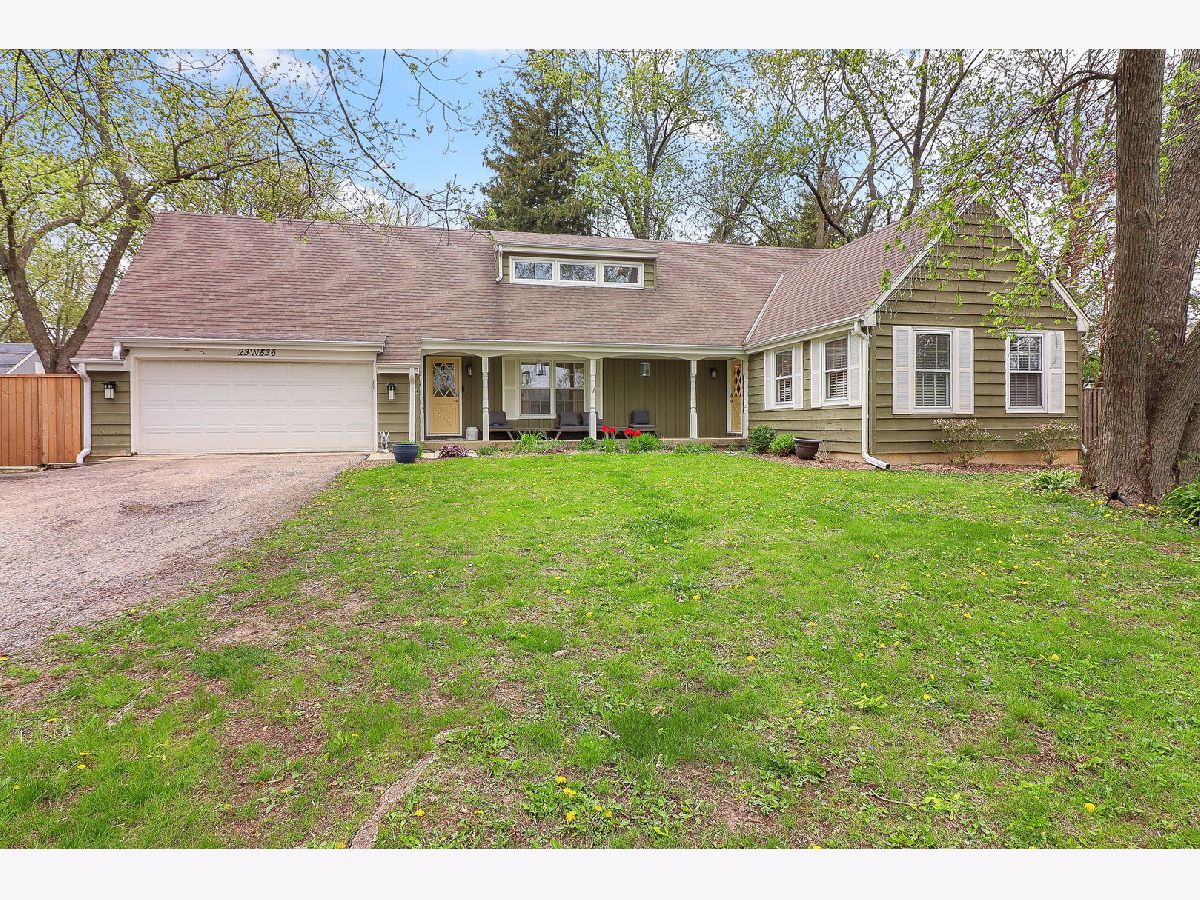 Highest and best due by Saturday, May 10th at 5:00 p.m. If you are looking for wooded country living in the burbs, a large fenced backyard for the pups, with a deck and separate firepit area, an outbuilding (barn) currently set up for cornhole tournaments or to watch a sporting event with friends, a separate parking area to park your RV and boat and all your toys with access to The Great Western Trail...this is the property for you. And let's not forget the large, beautiful, established trees and feeding into District 41 and GLENBARD WEST HIGH SCHOOL. All this and it just happens to come with a beautifully updated 2 story house offering 4 bedrooms, 2 1/2 baths, a finished basement with exterior access and a 2 car attached garage. The first floor has an open concept with the kitchen featuring maple cabinets with new under and over accent lights, granite countertops, stainless steel appliances, a double oven, and a large breakfast bar. This opens to the family room with hardwood flooring, a gas fireplace, and canned lighting and a separate dining area with plenty of room for a large table, crown molding and a door to the deck, the perfect floor plan for entertaining. The primary bedroom has an updated private bathroom with modern finishes including dual vanities and a walk in shower with Moen Smart system. There are 3 additional bedrooms upstairs that share a 2nd bathroom and all have hardwood flooring, lights and ceiling fans. The basement offers an additional rec room with a wet bar and exterior access, as well as an area currently being used as a bedroom, and still has a ton of storage space! The a/c was replaced in 2023, new well head 2022, barn was painted 2020, new canned lighting through 1st floor, brand new dishwasher, microwave, washer and dryer 2024. There is an extra large first floor laundry room/mud room/office space, hardwood flooring through most of 1st and 2nd floor, white trim. There are 2 (10 foot) wide bi-parting gates and 1 (12 foot) bi parting gates which allow you to drive your from the front all the way to the back parking lot area to store equipment or any toys you may have. The house has been very well loved and updated and it shows. Located in unincorporated Carol Stream with no HOA's pr restrictions and close proximity to downtown Glen Ellyn and Wheaton train stations.