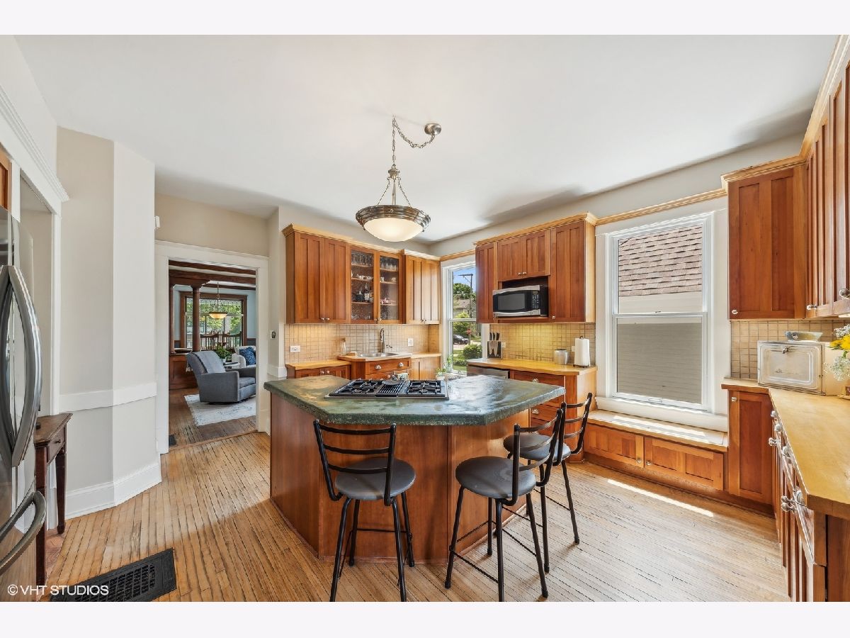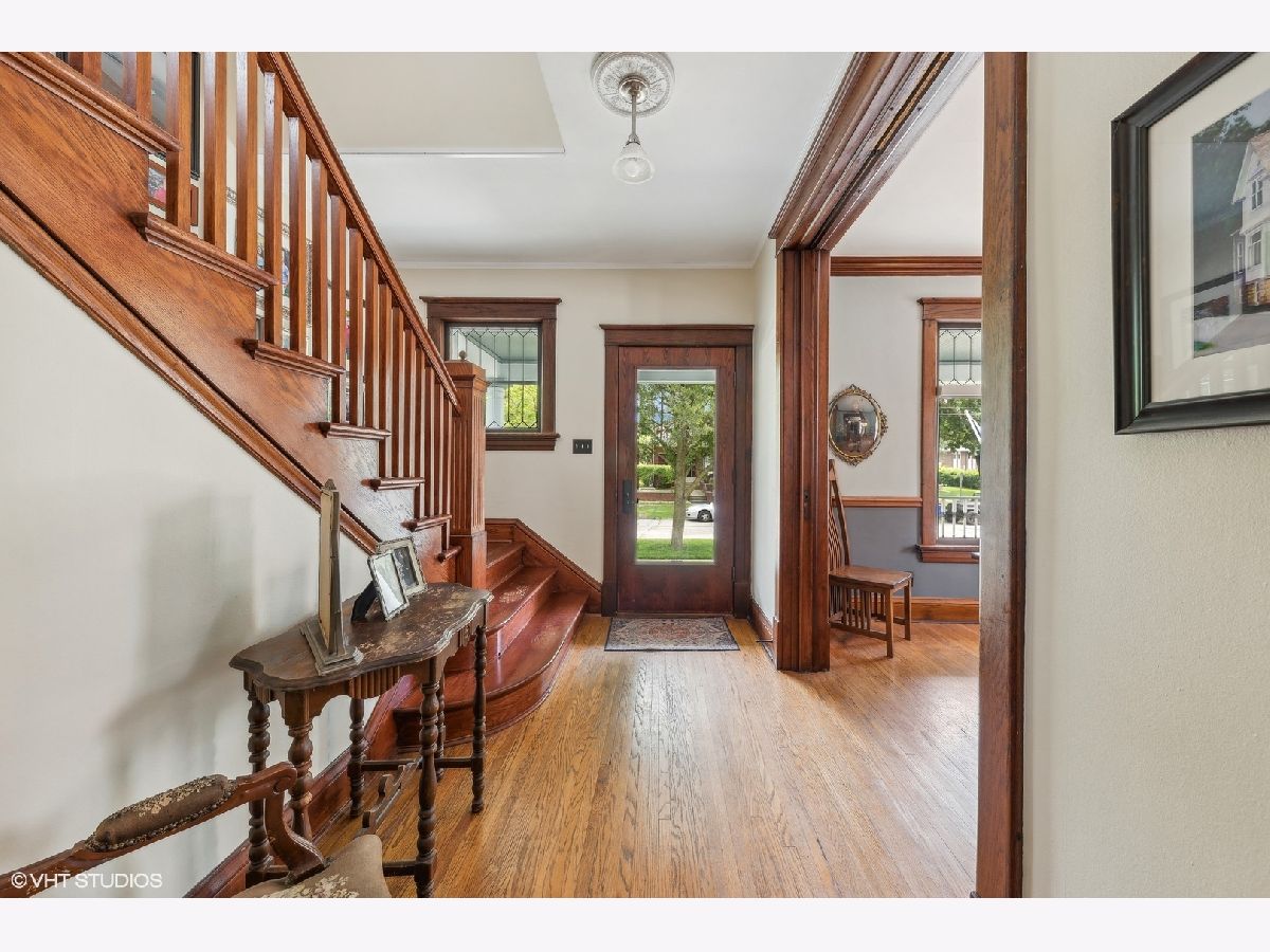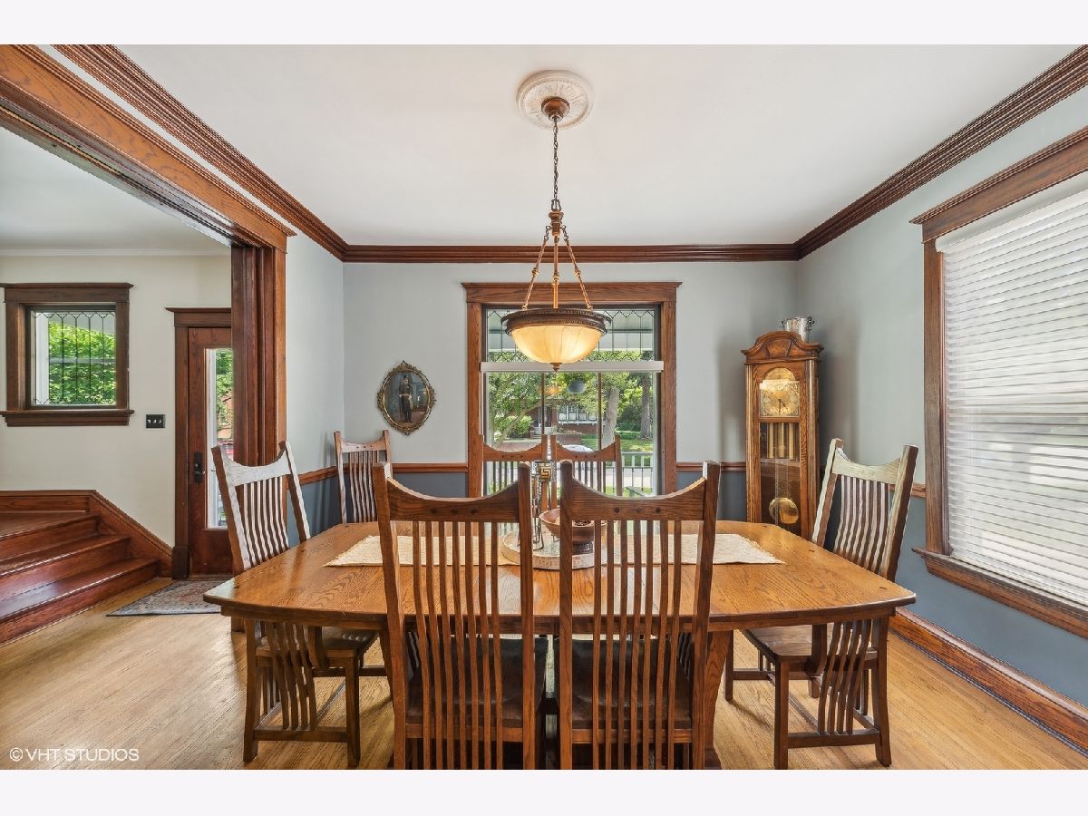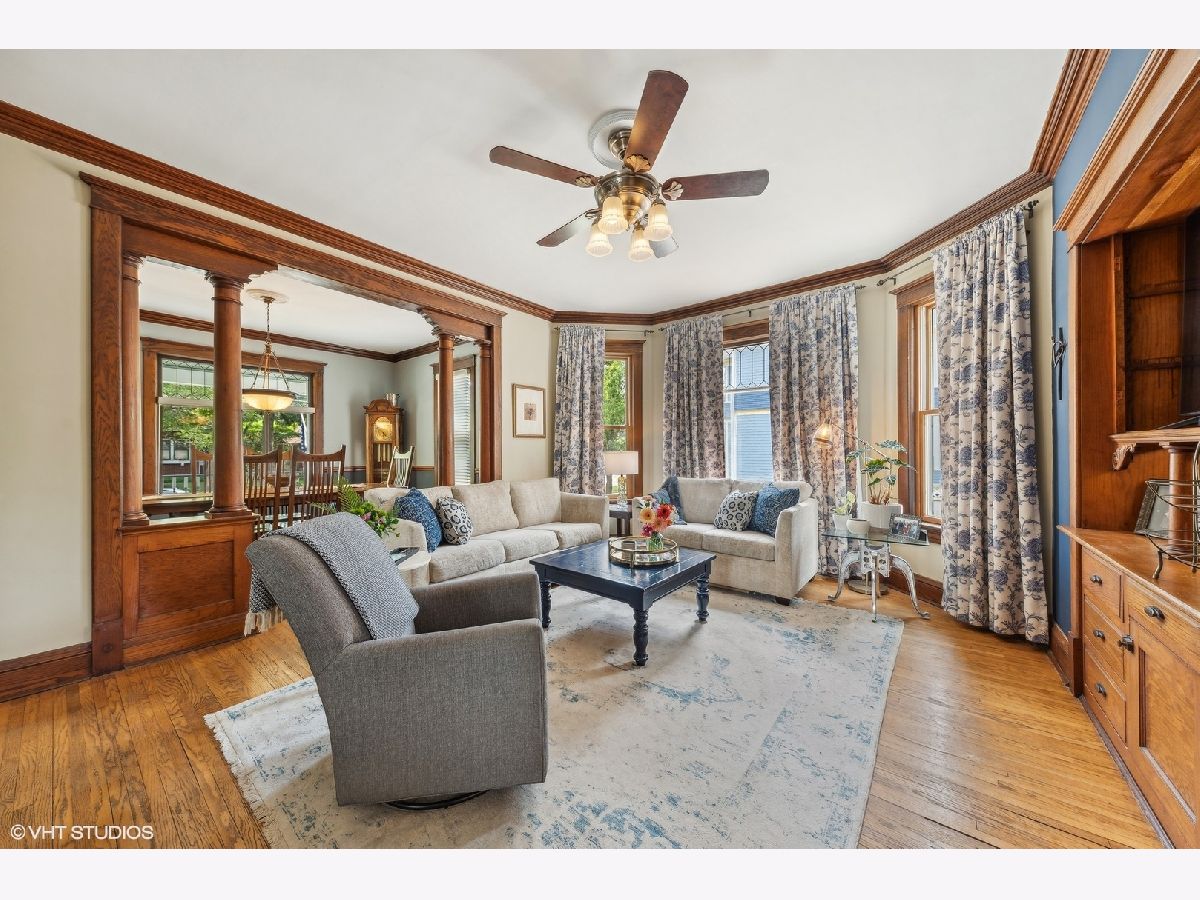 Welcome to this charming, restored Victorian home in the historic district of downtown Palatine. Once the residence of Herb Chidley, Palatine's beloved wildlife artist, who lived here from 1935 to 1999, this home offers a unique blend of history and modern comfort. Upon entering, you'll be greeted by the timeless allure of original wood molding, adding a touch of character throughout the home. The interior seamlessly blends modern conveniences with historic charm, creating a warm and inviting atmosphere. This lovely residence features a spacious floor plan with four bedrooms, including one on the main level. All three bathrooms have been recently updated, including the stunning first-floor bathroom with high-contrast colors, geometric tile, a restored original clawfoot tub, and luxurious finishes. At the heart of the home is a large, bright kitchen with ample counter space and custom cherry cabinets, perfect for preparing and enjoying meals with loved ones. The first floor includes a dining room, living room, and office, thoughtfully laid out for relaxation, entertainment and functionality for daily living. Step outside to discover comfortable outdoor living areas, perfect for unwinding or hosting gatherings. The outdoor space features a paver patio with a built-in fire pit, a covered outdoor living room with a TV, speakers, and a ceiling fan, and lovingly landscaped front and back yards with vibrant perennials. The uncommon, oversized, heated, and insulated three-car garage is ideal for large projects, automotive enthusiasts, and for storing larger recreational vehicles. Above the garage is a spacious walk-up loft that offers additional space for storage, hobbies, or potential conversion into a studio or workspace. The unfinished lower level provides ample storage or potential for future customization. For peace of mind, many important functional updates have been completed, including a new roof, water and sewer lines, exterior drain tile, blown-in insulation, paint and restoration of the siding and exterior trim, and 200-amp service. Located on a quiet, tree-lined street, this home is just blocks from the Metra train, elementary school, and all the best downtown restaurants, coffee shops, and entertainment. It is also in the highly sought-after 211 School District. With its distinctive character and ample space, this Victorian home presents a rare opportunity to own a piece of history while enjoying modern comforts. Don't miss your chance to make this unique property your own!