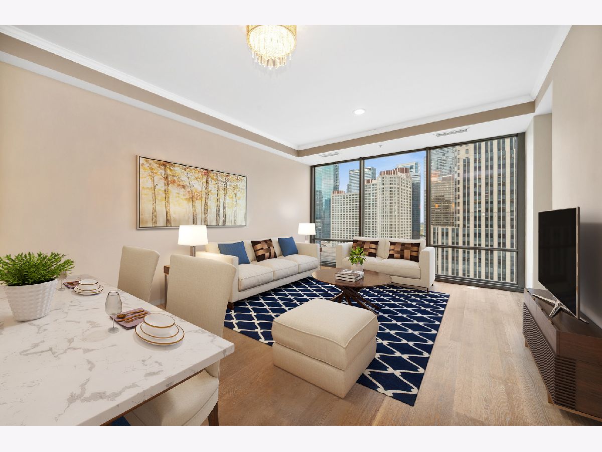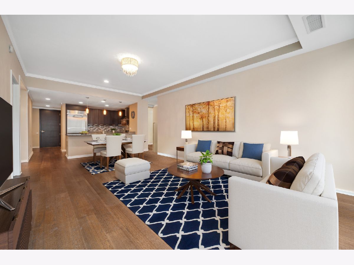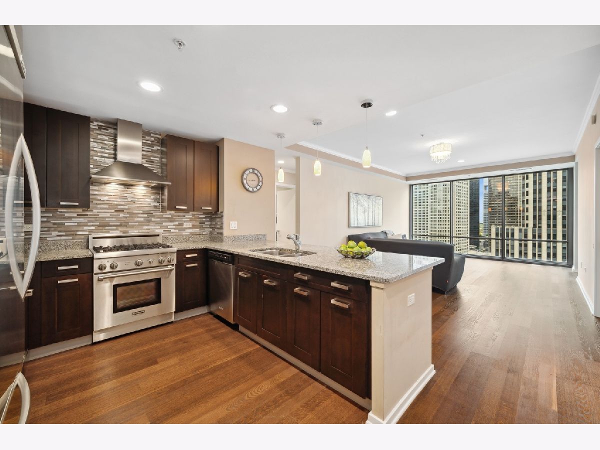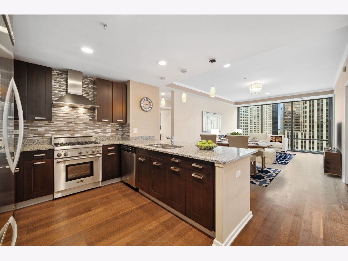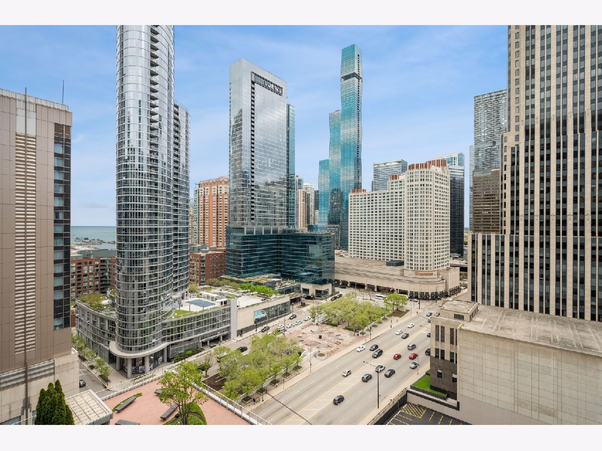 South facing 2 Bedroom plus Den 2 Bath condo in prime Streeterville location. Open floorplan with spacious living dining space featuring floor to ceiling windows showcasing a picturesque view of the skyline, iconic Michigan Avenue buildings and view of the lake for fireworks. Large U-shaped kitchen with Breakfast Bar, stone countertops Kitchen Aid Appliances and Thermador Deluxe Range. You will enjoy the light filled living dining room with hardwood floors, open to the kitchen. The split bedroom floor plan offers a primary suite on one side of the home and a second bedroom and den on the other side of the home allowing for serene privacy. The primary suite offers double closets, a stone bath with walk in shower and double vanity and linen storage. The second bedroom offers a wall of closets and adjacent stone bath with tile accents. A den or home office with hardwood floors and closet is perfect for working from home or can accommodate a day bed or pull-out sofa for extra guests. Enjoy the balcony for summer grilling or evening relaxing. Great condition condo with convenient location to Michigan Ave, and the lake front. The professionally managed building offers, 24 hr. door staff, exercise room, weight room, outdoor pool, pet run, and grill area and roof top garden. Whole Foods Grocery conveniently just an elevator ride away, along with Egg Harbor and many other restaurants and shopping venues just steps away.