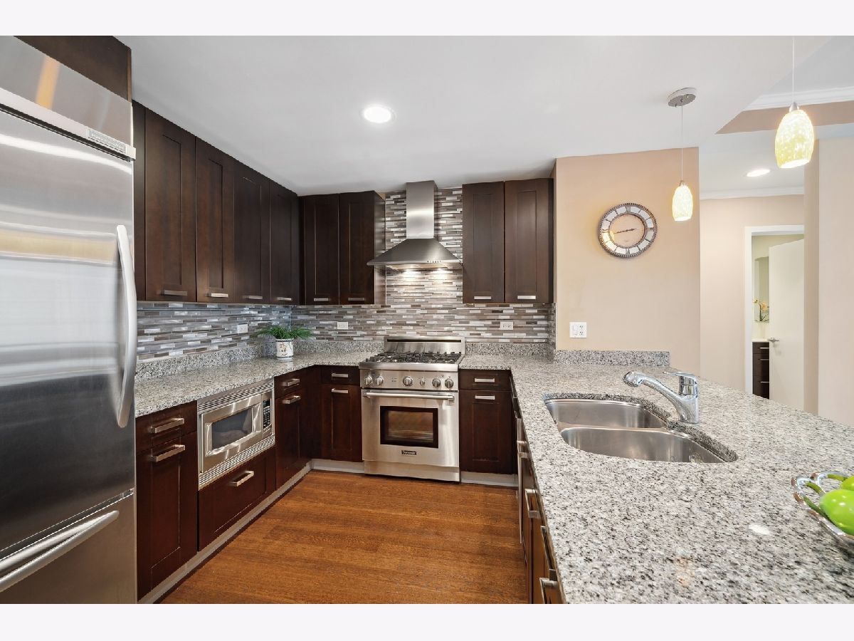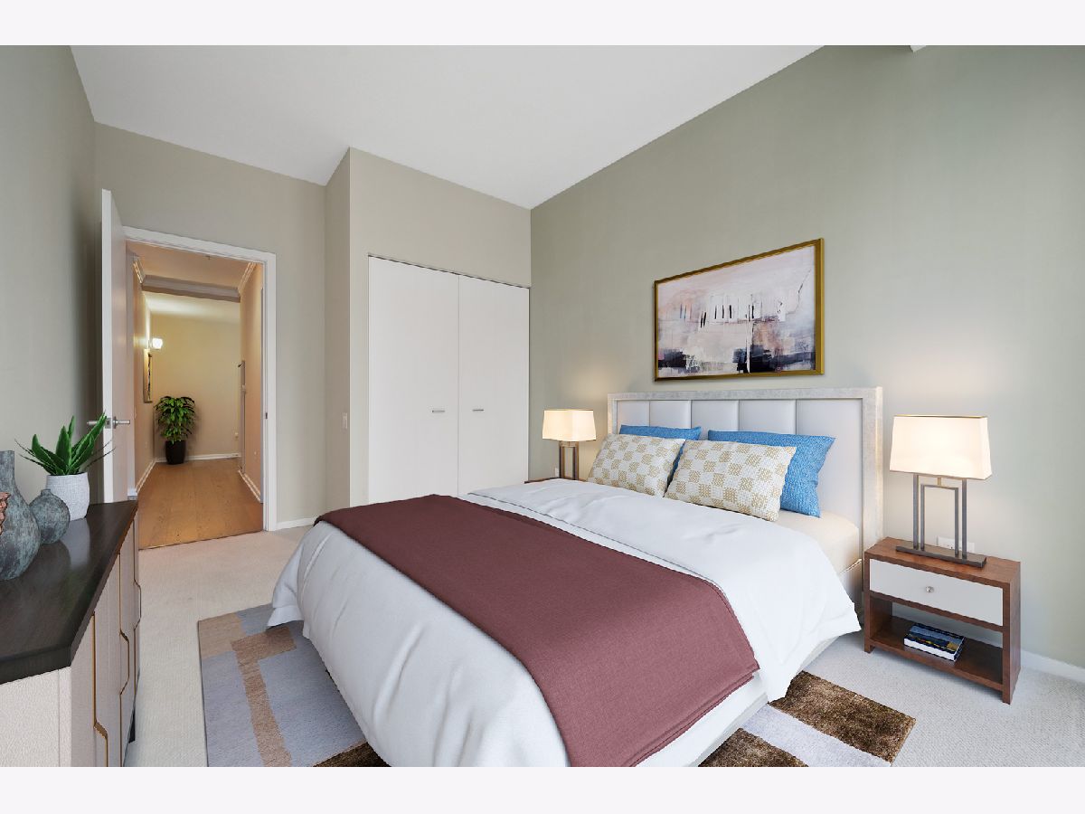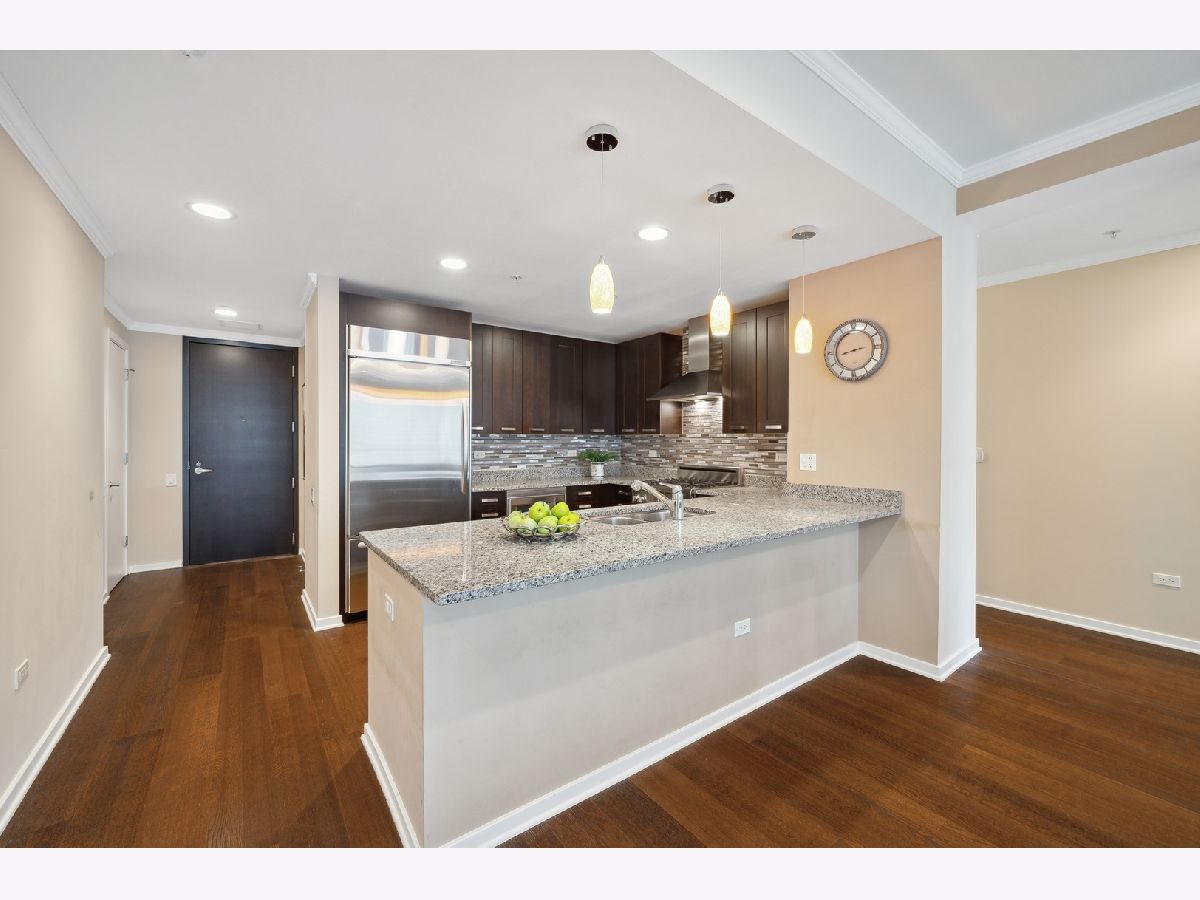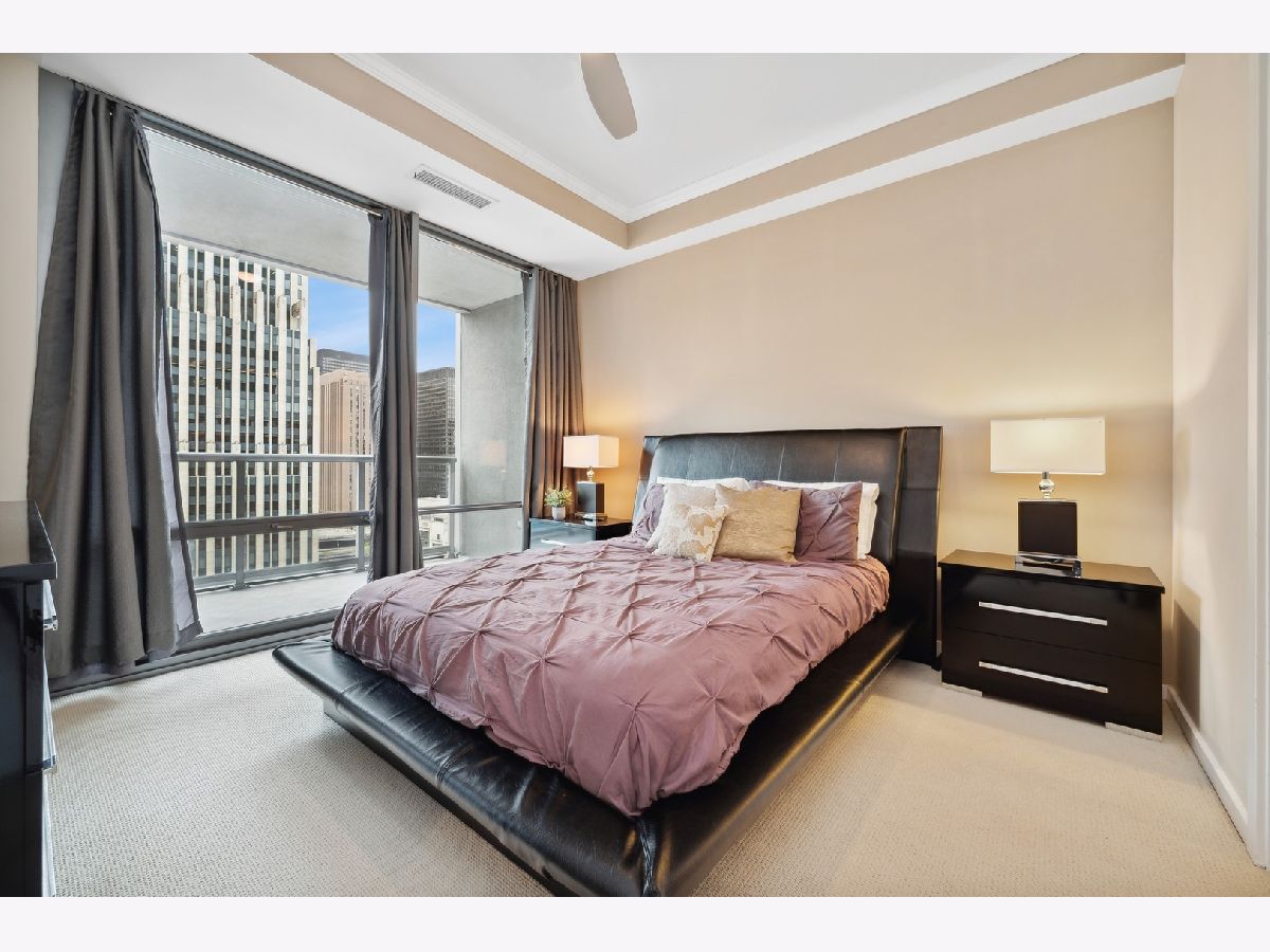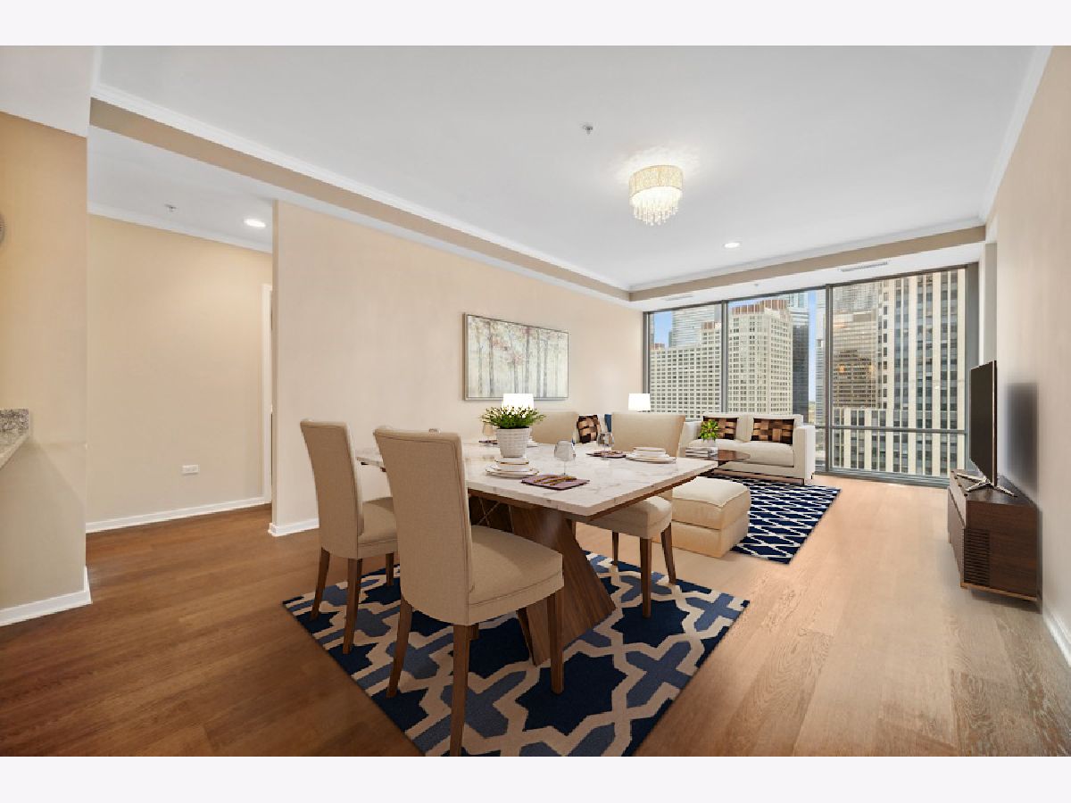 South facing 2 Bedroom plus Den 2 Bath condo in prime Streeterville location. Open floorplan with spacious living dining space featuring floor to ceiling windows showcasing a picturesque view of the skyline, iconic Michigan Avenue buildings and view of the lake for fireworks. Large U-shaped kitchen with Breakfast Bar, stone countertops Kitchen Aid Appliances and Thermador Deluxe Range. You will enjoy the light filled living dining room with hardwood floors, open to the kitchen. The split bedroom floor plan offers a primary suite on one side of the home and a second bedroom and den on the other side of the home allowing for serene privacy. The primary suite offers double closets, a stone bath with walk in shower and double vanity and linen storage. The second bedroom offers a wall of closets and adjacent stone bath with tile accents. A den or home office with hardwood floors and closet is perfect for working from home or can accommodate a day bed or pull-out sofa for extra guests. Enjoy the balcony for summer grilling or evening relaxing. Great condition condo with convenient location to Michigan Ave, and the lake front. The professionally managed building offers, 24 hr. door staff, exercise room, weight room, outdoor pool, pet run, and grill area and roof top garden. Whole Foods Grocery conveniently just an elevator ride away, along with Egg Harbor and many other restaurants and shopping venues just steps away.