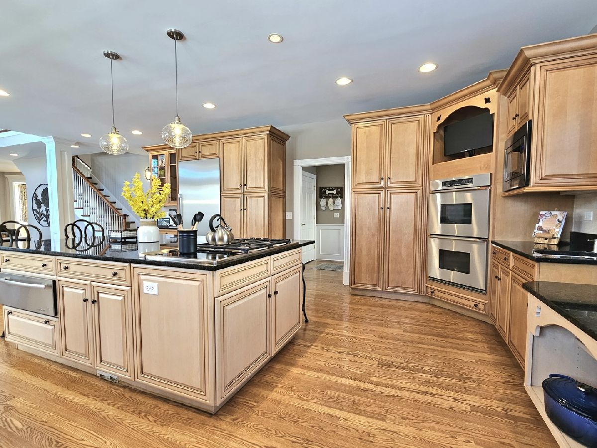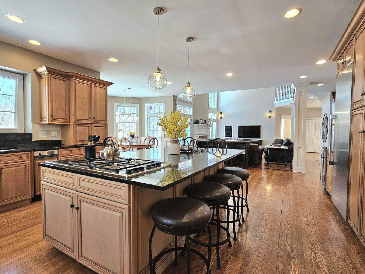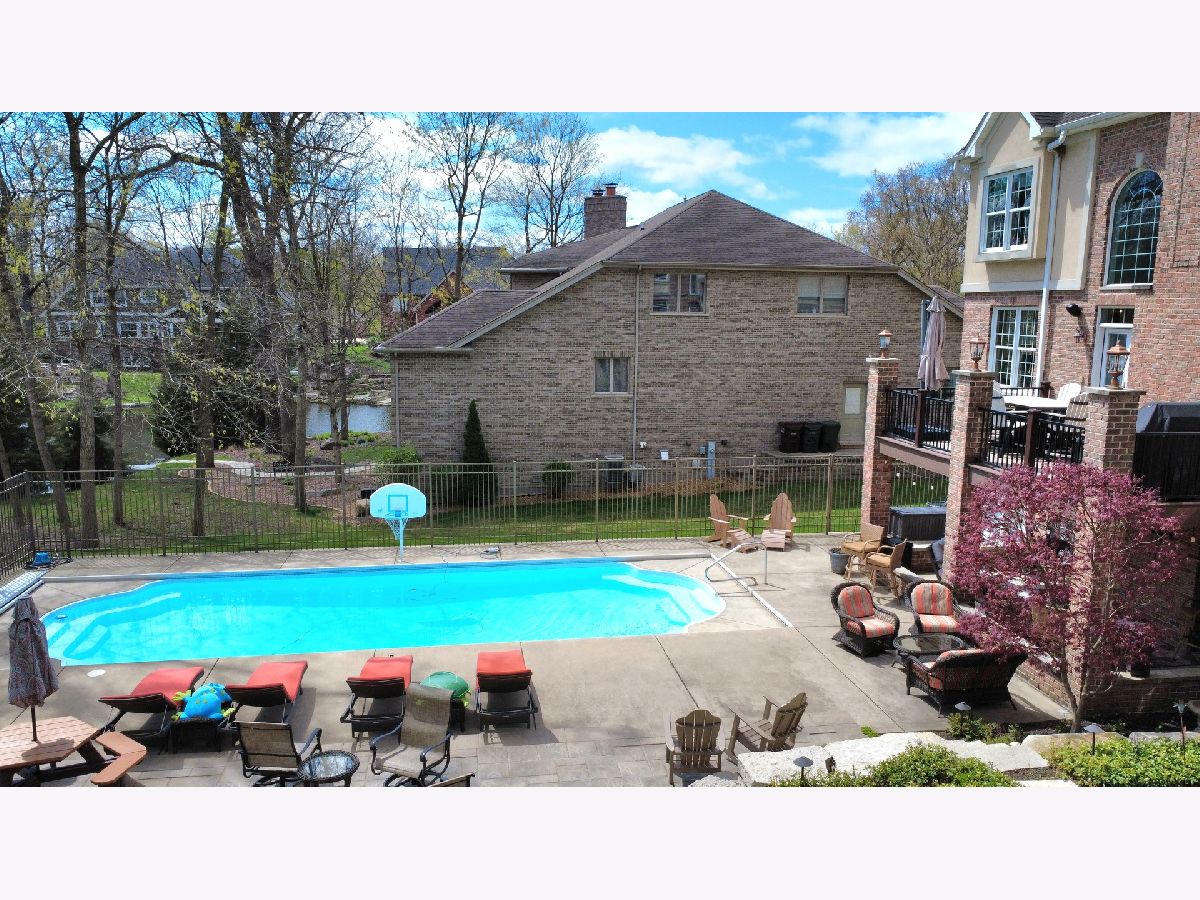 This extraordinary 3-story home, nestled in the heart of New Lenox on a sprawling 0.44-acre lot, offers a luxurious 8,000 square feet of living space, blending elegance and comfort at every turn. As you step inside, you're greeted by rich hardwood flooring that flows seamlessly through most of the main and second levels. The gourmet eat-in kitchen is a chef's dream, featuring granite countertops, stainless steel appliances, including a brand-new 2024 Thermador Refrigerator, a Dacor double oven, tile backsplash, an island with a cooktop and breakfast bar, a wine fridge, and a spacious eating area that overlooks the lush backyard. The home's large 2-story family room with a brick gas fireplace creates a warm and inviting atmosphere, perfect for family gatherings or cozy evenings. On the main level, you'll find a versatile office/5th bedroom, as well as a formal living room and dining room, both with wainscoting, crown molding, and oversized white trim throughout. The finished walkout basement is an entertainer's paradise, with a recreation room, massive playroom, private theater, full bath, and ample storage space the full basement and attached 3 car garage are both equipped with in floor radiant floor heating via a boiler for extra comfort. The dual hardwood staircase leads to the second level, where the expanded master suite awaits, complete with a sitting area, a private Rapunzel deck, and a spa-like en suite bath with double sinks, a makeup counter, a whirlpool tub, a large tiled shower with dual shower heads and a glass door, a water closet, and an oversized walk-in closet. Additional bedrooms include a Princess suite and two Jack & Jill bedrooms with access to a balcony overlooking the front door, all offering expansive closet space and natural light. The second level also features a convenient laundry room. On the third level, a large loft area, 6th bedroom with full bath, and extra storage space provide ample room for relaxation and versatility. This home boasts top-of-the-line amenities, including 2 furnaces and A/C units for zoned heating and cooling. The outdoor space is equally impressive, with a fenced-in backyard offering a serene pond view, an in-ground pool with an automatic cover, a deck, a patio, professional landscaping, and a stone stairway leading to the backyard from the new concrete driveway (2024). Whether you're hosting family events, enjoying quiet moments, or entertaining friends, this home offers the perfect setting for a luxurious lifestyle. New Lenox grade schools and Lincoln-Way West High school. Just minutes away from Train station, I-355 and I-80.