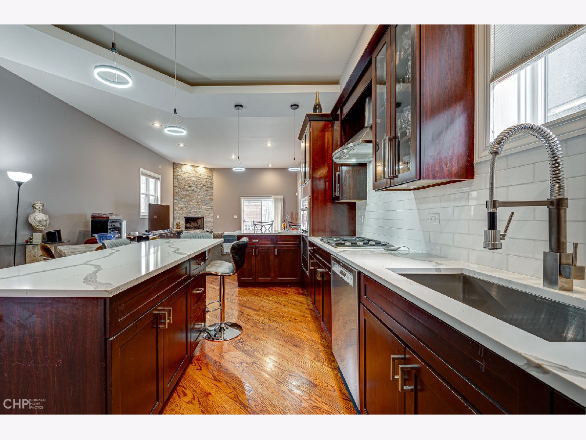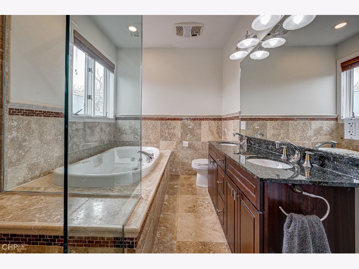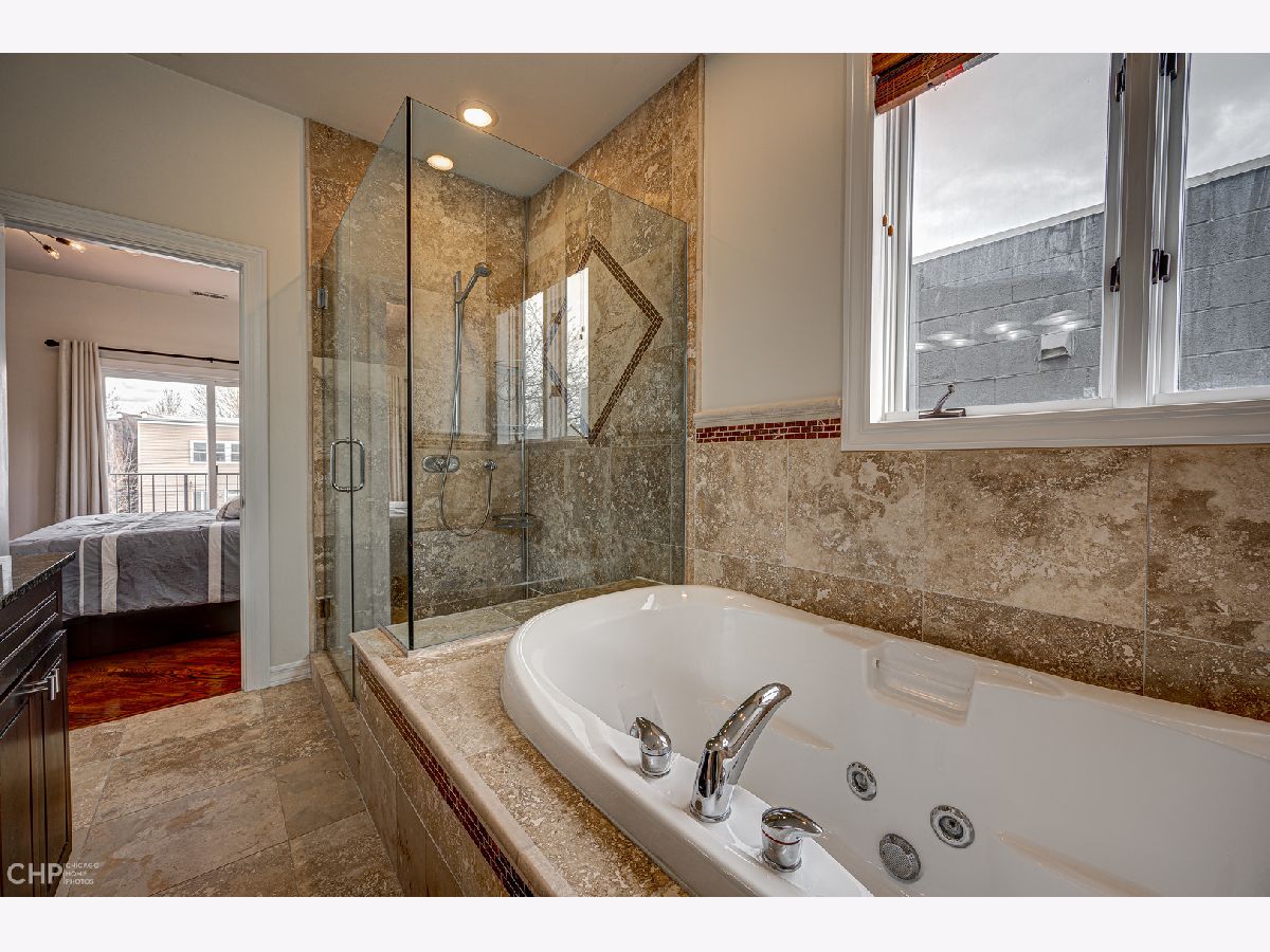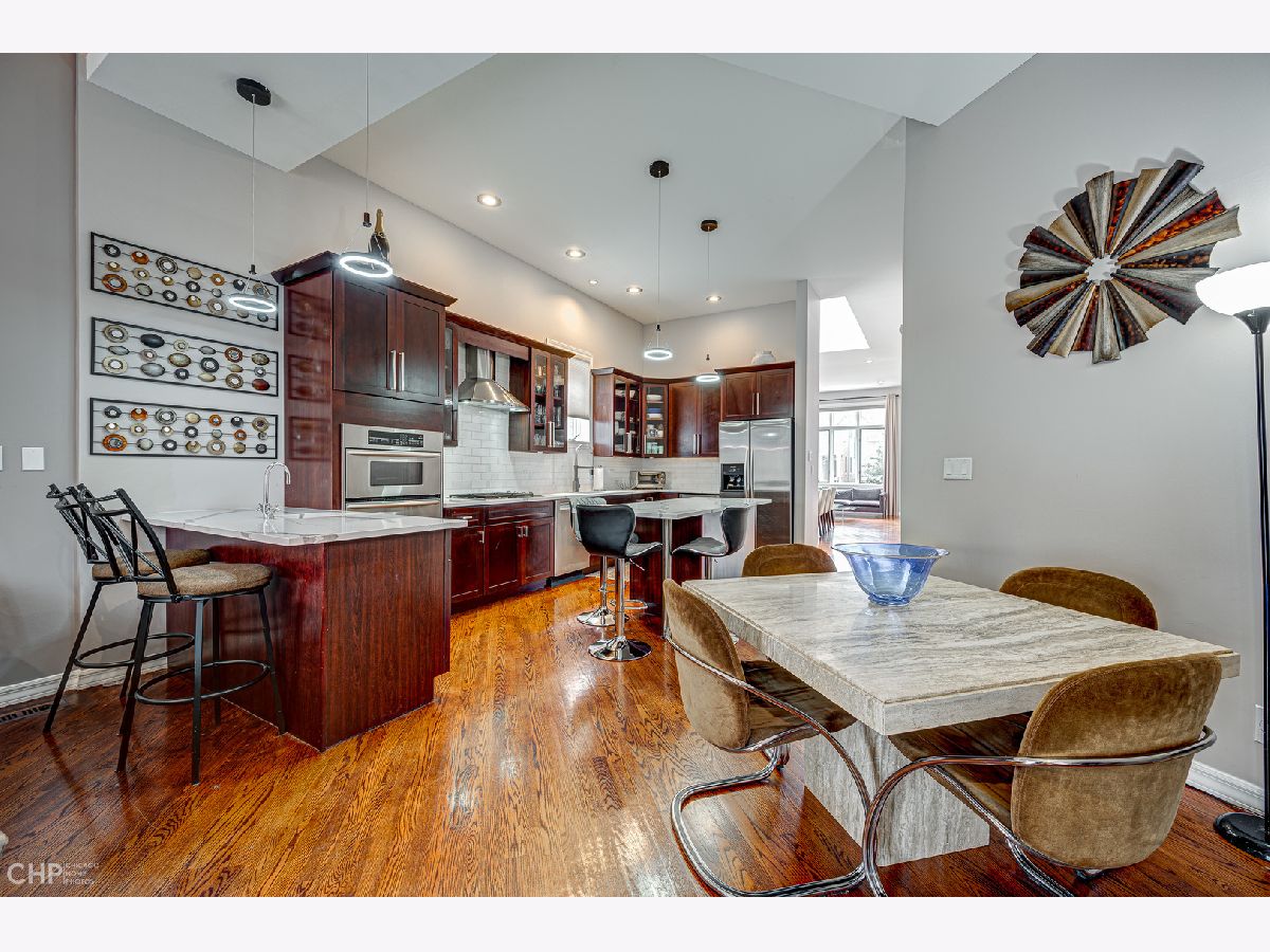 Welcome to 2430 W Huron, approximately 4,000 sf of soaring ceilings, entertainment spaces, and rooftop city views all in desirable West Town. This 4-bedroom home welcomes you to the foyer with 12' ceilings in the formal dining room with ample amounts of natural light with the added privacy of a floor to ceiling glass block wall. The chef's kitchen is a cook's dream with high-end Wolf, Bosch, and KitchenAid appliances, quartz countertops, all new faucet and lighting, custom cherry cabinets and walk-in pantry. The open concept kitchen to a large living area complete with gas fireplace and outdoor deck for summer barbecues. Ascend the open glass staircase in the foyer to the second floor with 9' ceilings. On the second floor you will find 3 bedrooms all complete with their own en-suite bathrooms, a true rarity in the city! The primary bedroom has a private balcony overlooking the backyard and en-suite bathroom that includes a double vanity, jet tub, and steam bath. A fully built-out walk-in closet completes the space. For those who can't get enough city views, the private rooftop deck built in 2020 is just up the stairs and offers panoramic views of Chicago. The lower level of the home is perfect for relaxing and hosting with high ceilings, media area, wet bar, and a wine fridge. It also offers a 2nd laundry room and the fourth bedroom complete with bathroom, large storage closet, and private backyard entryway. The all-brick 2+ car garage is the perfect finishing touch to this home along with the newly painted interior, decks, and exterior fencing. Close to Smith Park, 3 blocks to the Metra, easy access to 90/94 and 290, and in the Chopin School District.