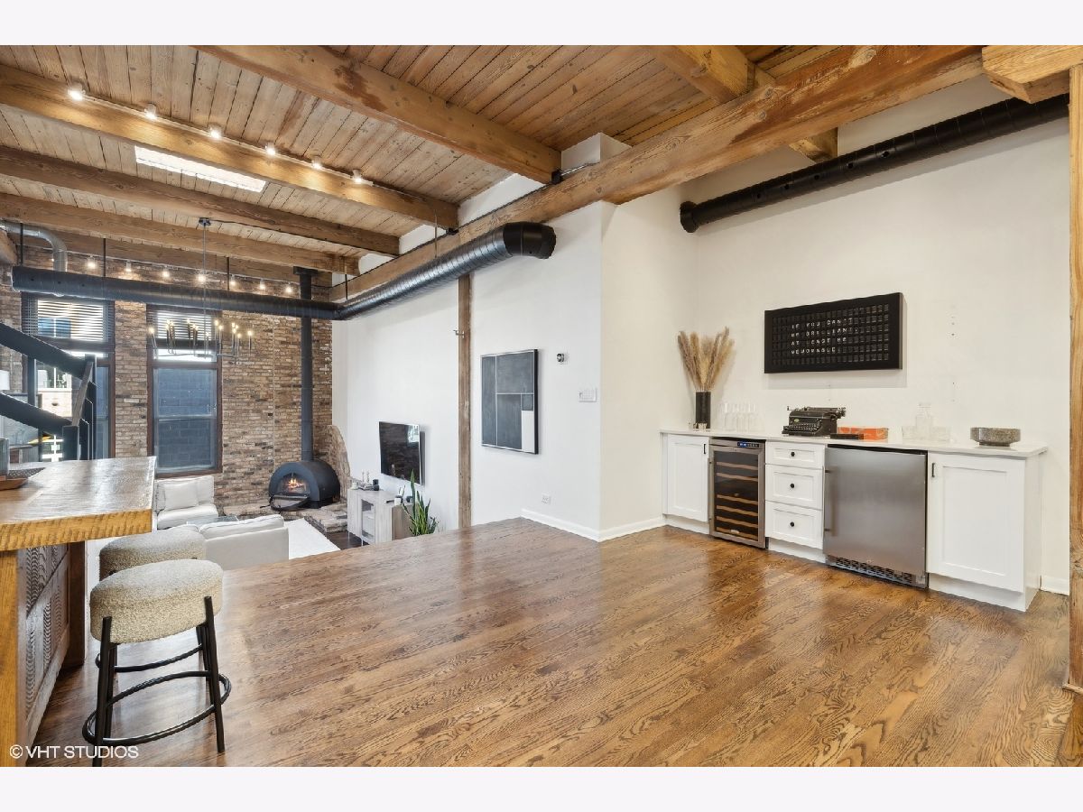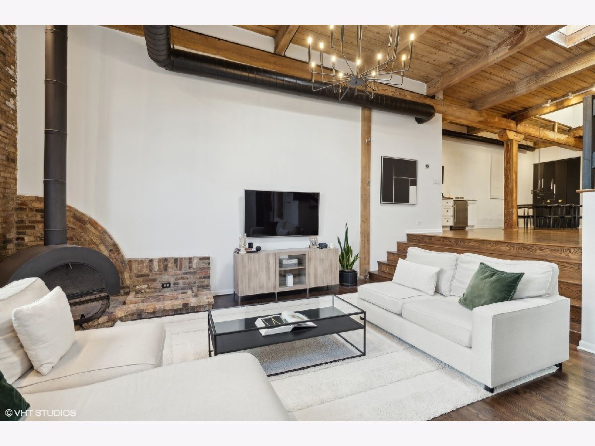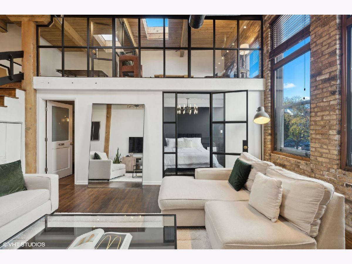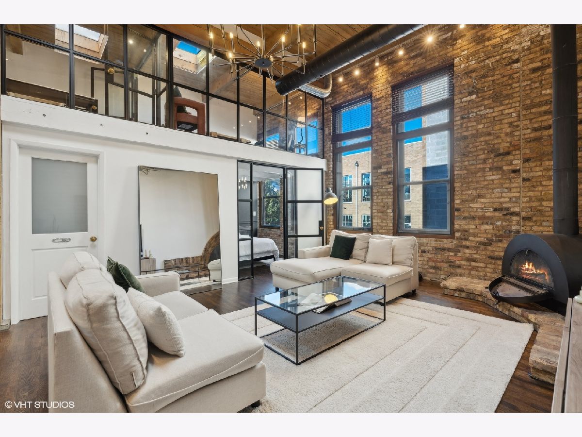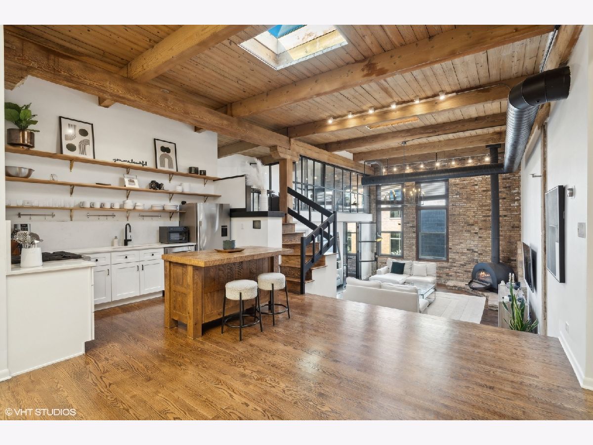 Sleek. Modern. Warm. One of a kind. Discover this top-floor duplex timber loft in Lincoln Park-a true gem that's as rare as it is remarkable. Flooded with light and brimming with character, this 2-bedroom, 2-bath plus lofted flex space embodies both style and warmth, perfect for unwinding or entertaining. Step into a recently renovated kitchen that pairs the elegance of quartz counters and stylish light fixtures with high-end, professional-grade appliances, including a Viking range. The open layout flows effortlessly into a stylish bar area with a wine fridge, framed by exposed brick and immense skylights, flooding the home with natural light. The perfect place to display your art collection. Newer hardwood floors on the lower level add warmth, while the wood-burning fireplace enhances the home's cozy yet chic vibe. This multi level space offers three different levels of living. A glass-and-steel-enclosed lofted space looks out over the main floor's living, dining and kitchen. A second bedroom is adjacent to the living room and a beautifully updated bathroom with chic subway tile, trough sink and glass enclosed shower. A spacious primary suite is located on the "ground" floor, accessed within the unit from a spiral staircase. Laundry is also conveniently offered on this level. Soundproofed windows, smart lighting, and a Nest thermostat provide seamless modern comfort. Step outside to a shared rooftop deck with seating and a grill for those stunning city views. Attached EV-ready garage parking and storage closet are included, completing this one-of-a-kind loft experience. This is Lincoln Park living at its best- with steps to trendy dining on Armitage, shopping on Lincoln and the train at Fullerton. The loft offers both a convenient and calming retreat from city living. You have to see it for yourself.