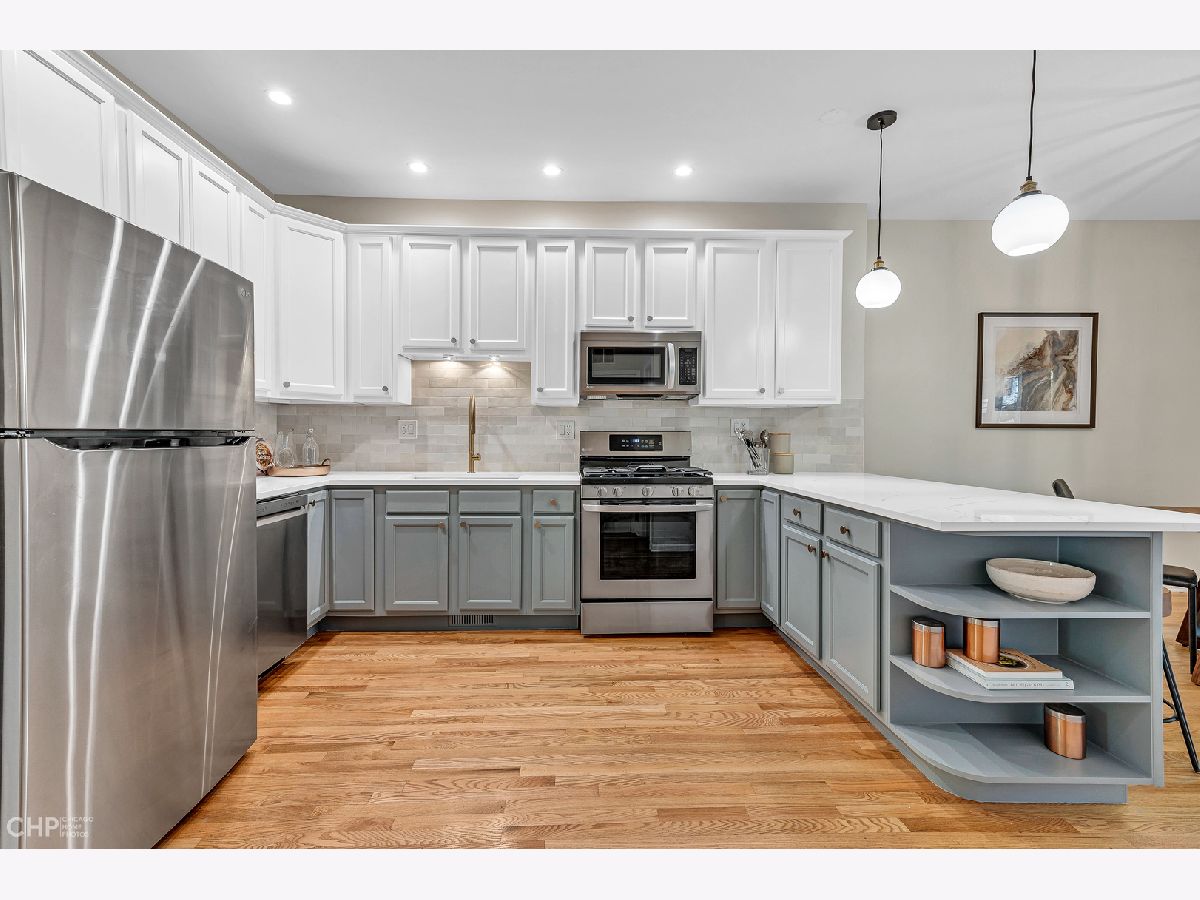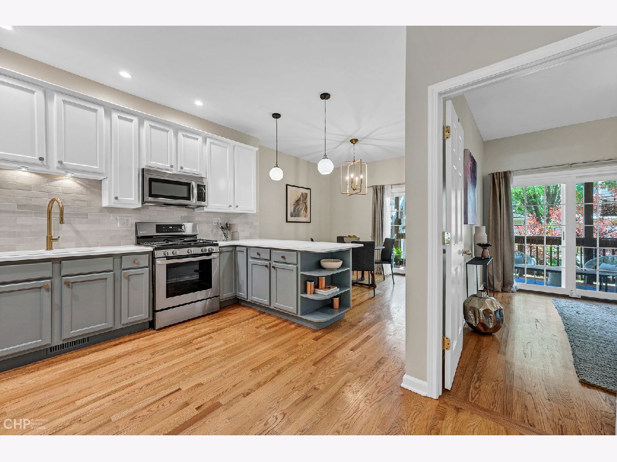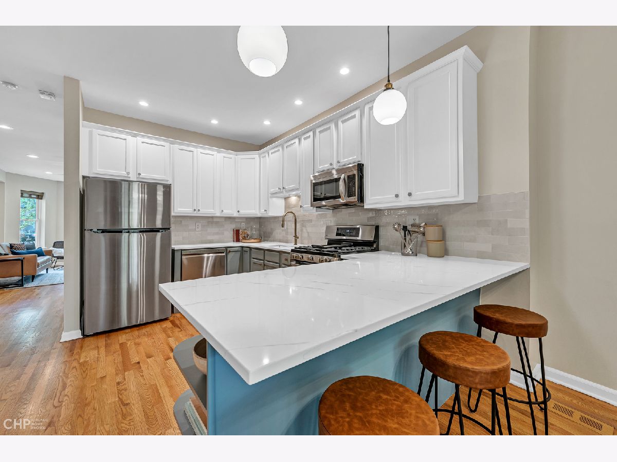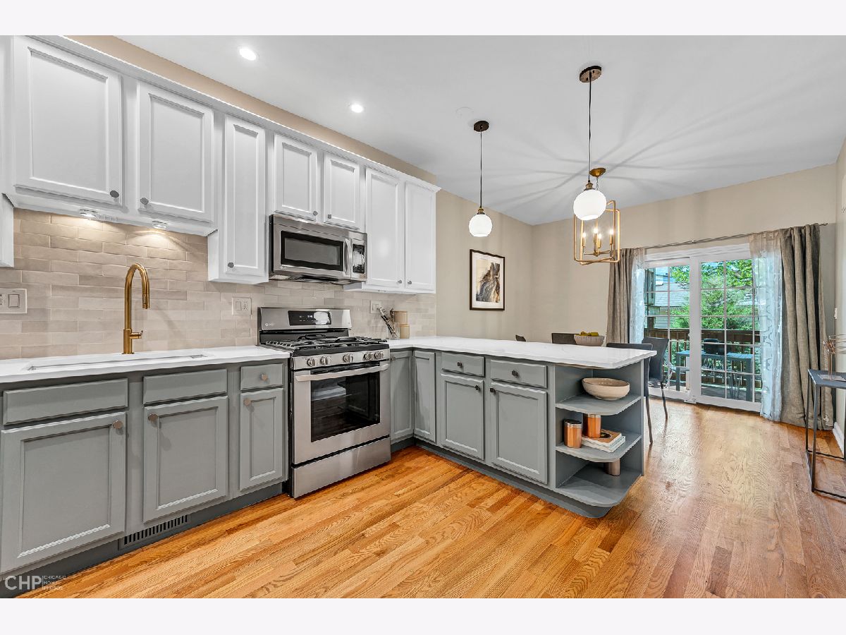 Spacious and modern 3-bedroom, 2-bathroom duplex down located in the heart of Logan Square. This stunning home includes fresh paint throughout, remodeled kitchen, updated bathrooms, custom lighting, refinished hardwood floors, and so much more! The large eat-in kitchen boasts newly painted cabinetry with stylish hardware, a custom backsplash, brand new quartz countertops, and all stainless-steel appliances. The kitchen adjoins an extra-wide, open concept living and dining room combo with beautiful bay windows that let in tons of natural light. The main level features a large bedroom and a full bath. An insanely large back deck is perfect for all your summer soirees. The outdoor space also includes a landscaped backyard. The lower level features a quiet primary bedroom with a walk-in closet and office nook as well as a second bedroom and large remodeled bathroom. The lower level includes a large laundry room with a side-by-side washer + dryer and a plethora of storage to finish off this perfect space. Great updates and tons of storage throughout this incredibly spacious unit make for a welcoming home, ideal for those seeking a single-family feel. This property is tucked away on a tree-lined, one-way street that is mere steps to Logan Boulevard, award-winning restaurants, public transportation, renowned Logan Square Farmers Market, and more! Garage parking is included in the price!