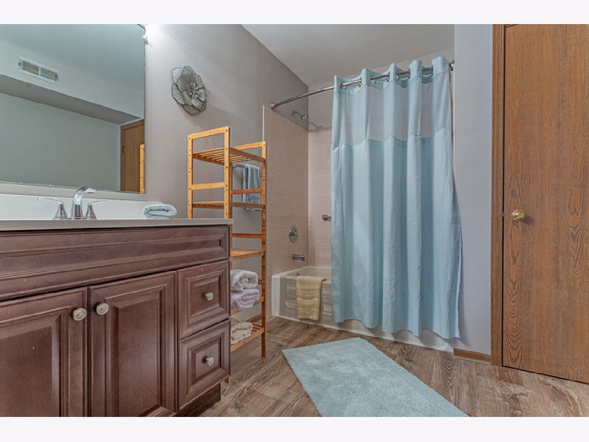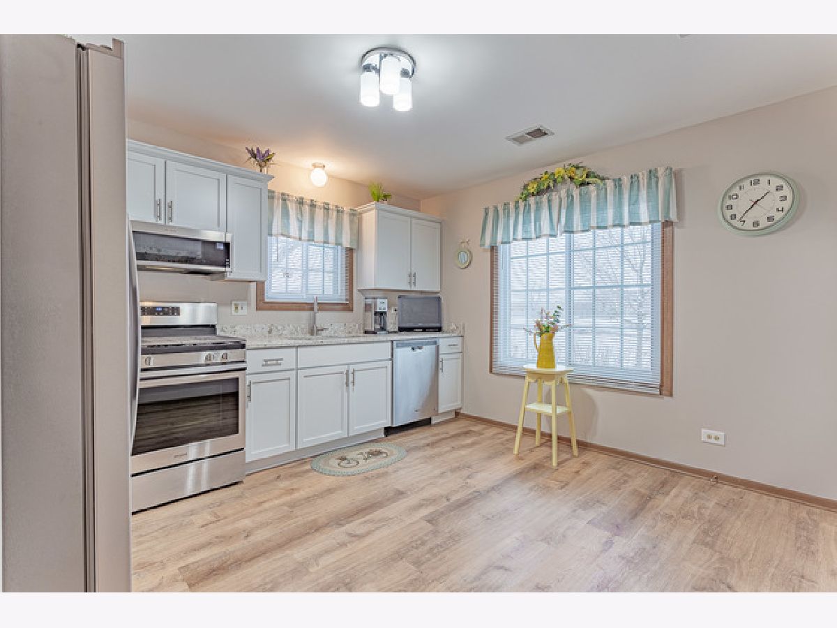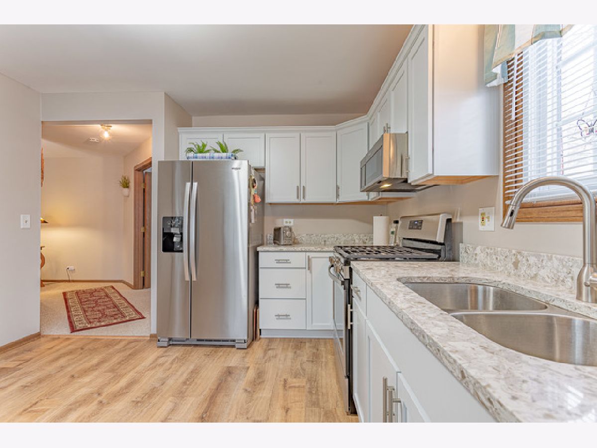 Looking for "New"?? Come see this beautiful first floor unit! Brand new kitchen (2020) features white shaker style cabinets, quartz countertops, wood laminate flooring and all high end stainless appliances overlooking serene pond. Rare split floorplan with each bedroom having its' own updated bath--new sinks, vanities, and toilets. Freshly painted throughout in the last year there's nothing to do but move in here. End unit also feature attached garage and LONG driveway-with guest parking is just across the street. Super convenient location just a short walk from Target, Jewel and more. Come see what this beauty has to offer!!